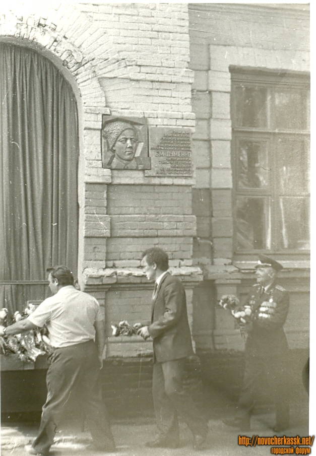 На этом снимке запечатлён момент возложения к новооткрытой мемориальной доске цветов заместителем председателя Новочеркасского горисполкома Николаем Чайковским, председателем горисполкома Петром Мрыхиным и ветераном 5-го гвардейского Донского казачьего кавалерийского корпуса полковником Лобовым О.Н.