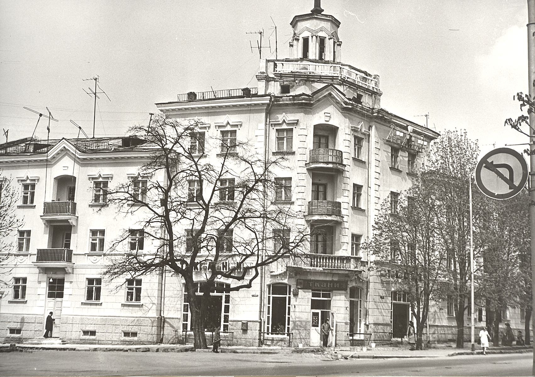 Автор фото Городецкий А. П. Дата снимка - 21 апреля 1982 года. Из архивов НМИДК. С центрального входа - магазин Ткани. Дом введен в эксплуатацию в 1956 году.