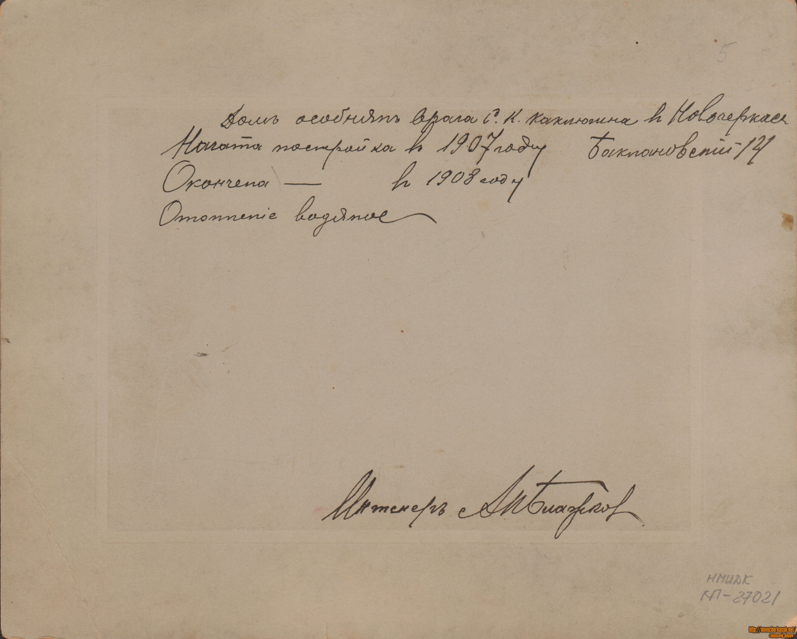 Надпись на обороте: Дом-особняк врача С. К. Каклюгина в Новочеркасске, Баклановский, 14. Начата постройка в 1907 году. Окончена – в 1908 году. Отопление Водяное. Инженер А. Блажков Съемка 1908 год.