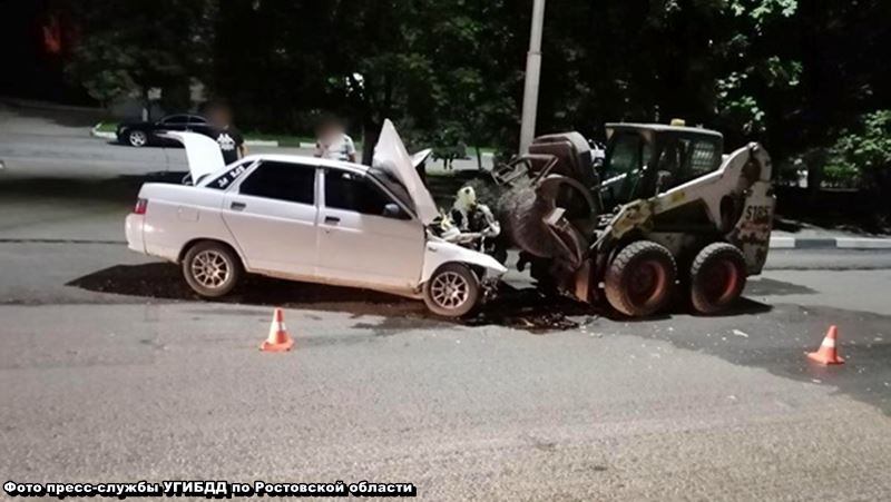 Лобовое столкновение двух авто произошло вчера в полночь на Платовском проспекте в самом центре Новочеркасска, травмы получили два человека. По предварительной информации, водитель автомобиля ВАЗ-2110 двигался по проспекту Платовскому от улицы Атаманской в сторону собора, отвлекся за рулем и врезался в минипогрузчик коммунальной службы, который занимался уборкой проезжей части. В результате ДТП травмы получили два человека. 23-летнего водителя «десятки» бригада скорой помощи увезла в больницу, а его 20-летний пассажир от госпитализации отказался, поэтому медицинская помощь ему была оказана на месте. Очевидцы сообщили, что коммунальная машина перед столкновением двигалась с проблесковым маячком желтого цвета.