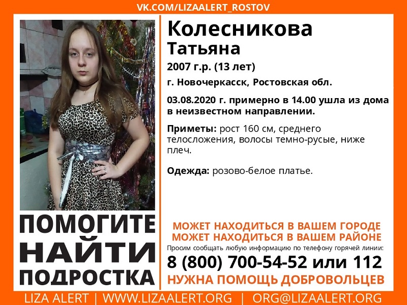 В Новочеркасске к поиску 13-летней девочки Татьяны Колесниковой, пропавшей после ссоры с родителями, подключились волонтеры. Отряд «Лиза Алерт ЮГ» разместил объявление в сети и привлекает к работе всех желающих. Поиски идут на всей территории донского региона и за его пределами. Напомним, Татьяна Колесникова вышла из дома на улице Дубовского №31 около 14:00 в понедельник, 3 августа. Девочка не взяла с собой мобильный телефон, поэтому связи с ней нет. Пропавшая ростом 157 сантиметров, с русыми волосами и светлыми глазами. Чуть выше переносицы имеет заметную родинку. В день исчезновения была одета в бело-розовое платье. Если вам что-либо известно о местонахождении Татьяны Колесниковой, просьба сообщить ее маме Ольге по номеру 8(951)585 29-27, или по телефону 02.