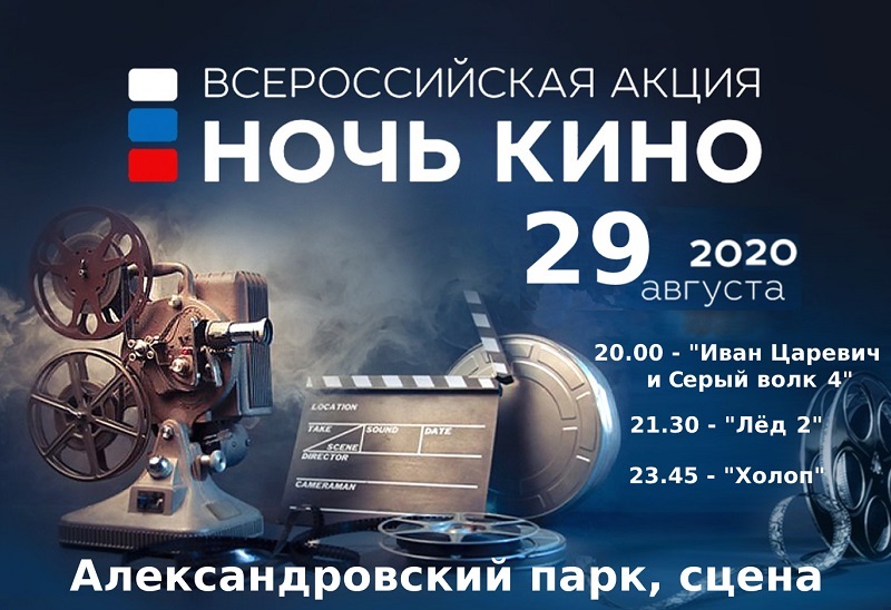 Ежегодная акция «Ночь кино» пройдет в России уже в 5 раз. В этом году в ней поучаствует и наш город, конечно же, с соблюдением всех мер по обеспечению санитарной безопасности. В рамках акции, в субботу 29 августа, начиная с 20:00 на сценической площадке Александровского парка со свободным (бесплатным) доступом начнется демонстрация трех самых кассовых российских фильмов 2020 года, созданных при поддержке Фонда кино. Зрителям покажут анимационный фильм «Иван Царевич и Серый Волк - 4», спортивную мелодраму «Лёд - 2», приключенческую комедию «Холоп».
