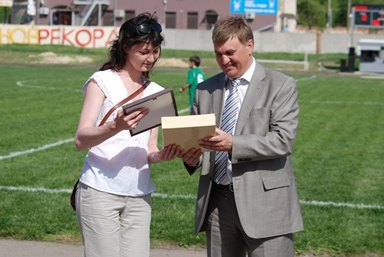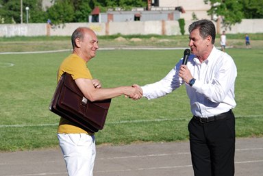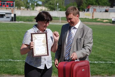 Продолжилось празднование Первомая на стадионе «Ермак», где основатель газеты Александр Андрющенко вручил призы и подарки победителям конкурса на домашней игре ФК «МИТОС».