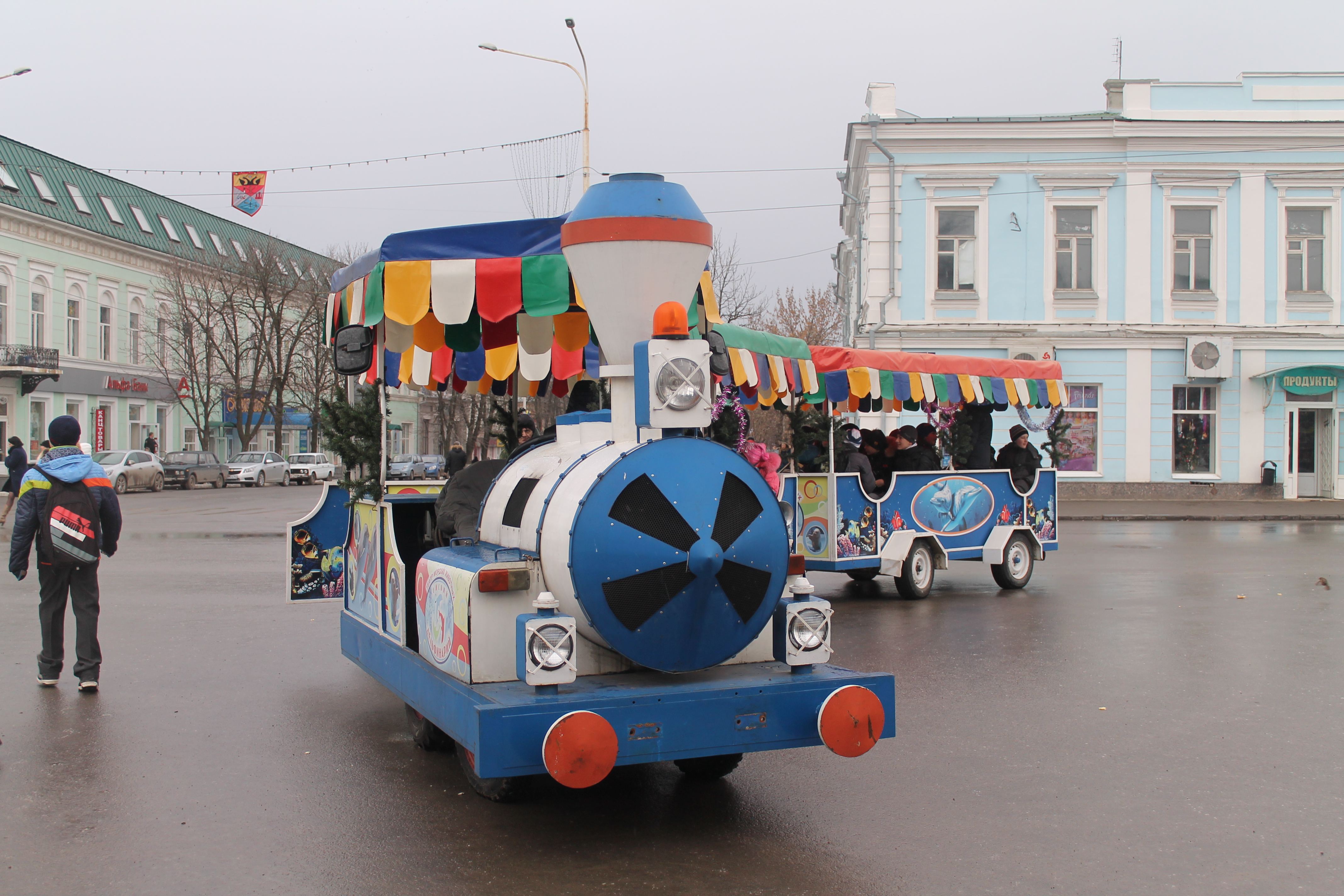 Ну а какой же Новый год без хороводов? Тигруля, Медвежонок, Ослик и Козочка водили веселые хороводы с малышами вокруг городской елки. Не только детям, но и взрослым понравились герои сказок: жители города постоянно фотографировались с ними и ходили импровизированным «паровозиком». А настоящий паровоз, украшенный маленькими елочками и игрушками, катал всех желающих по Платовскому проспекту.