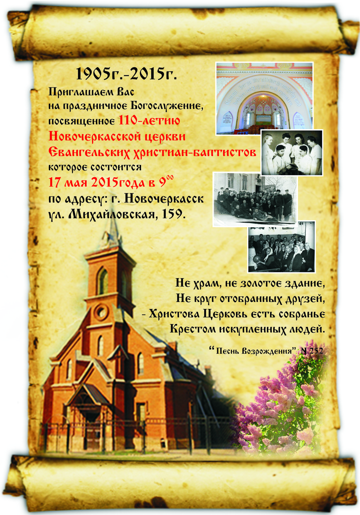 17 мая 2015 г. в 9:00 состоится праздничное богослужение, посвященное 110 летию общины церкви Евангельских христиан баптистов в г. Новочеркасске. Служение пройдет в кирхе, по ул. Михайловской, 159.