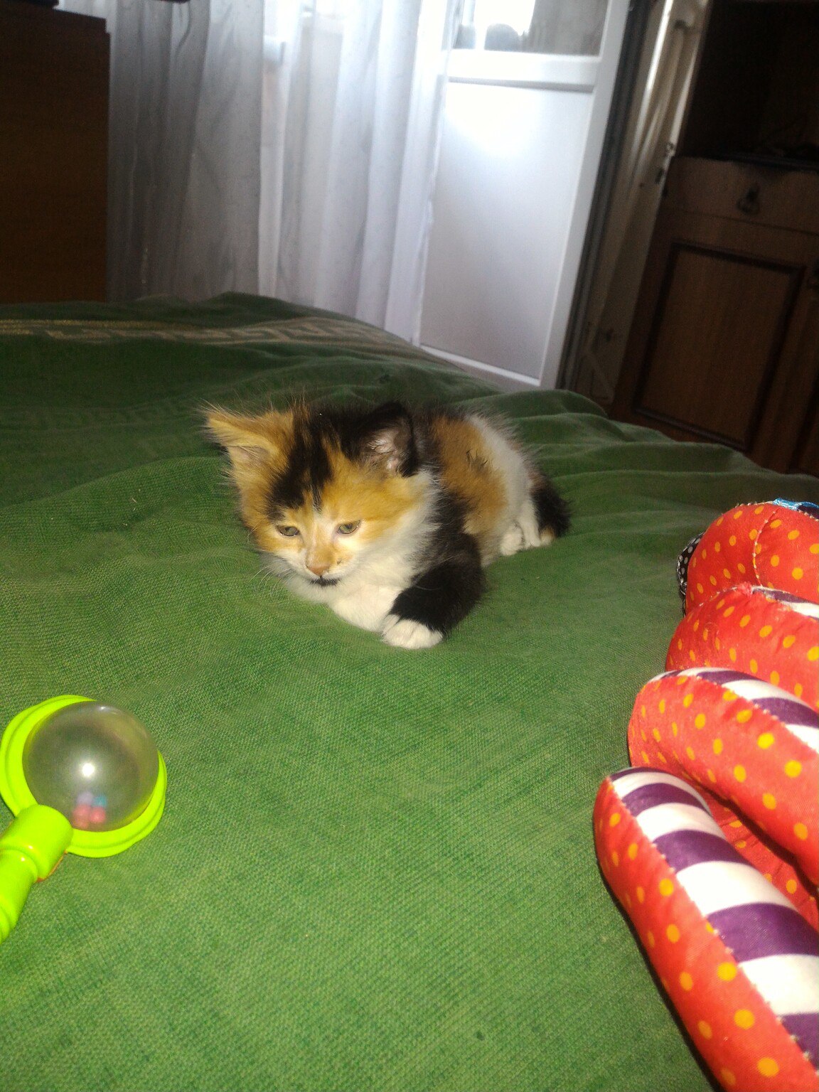 Во двор подкинули кошечку на вид 1-1,5 мес. Пока взяла ее к себе,но оставить не могу,у меня младшей доченьке всего 5 мес.,а она все время играться лезет,будит ее,грызет ручки,в общем не дает ребенку покоя. Кошечка все подряд кушает,очень ласковая,игривая. Бросить на улице конечно же не могу такую крошку. 89515064216