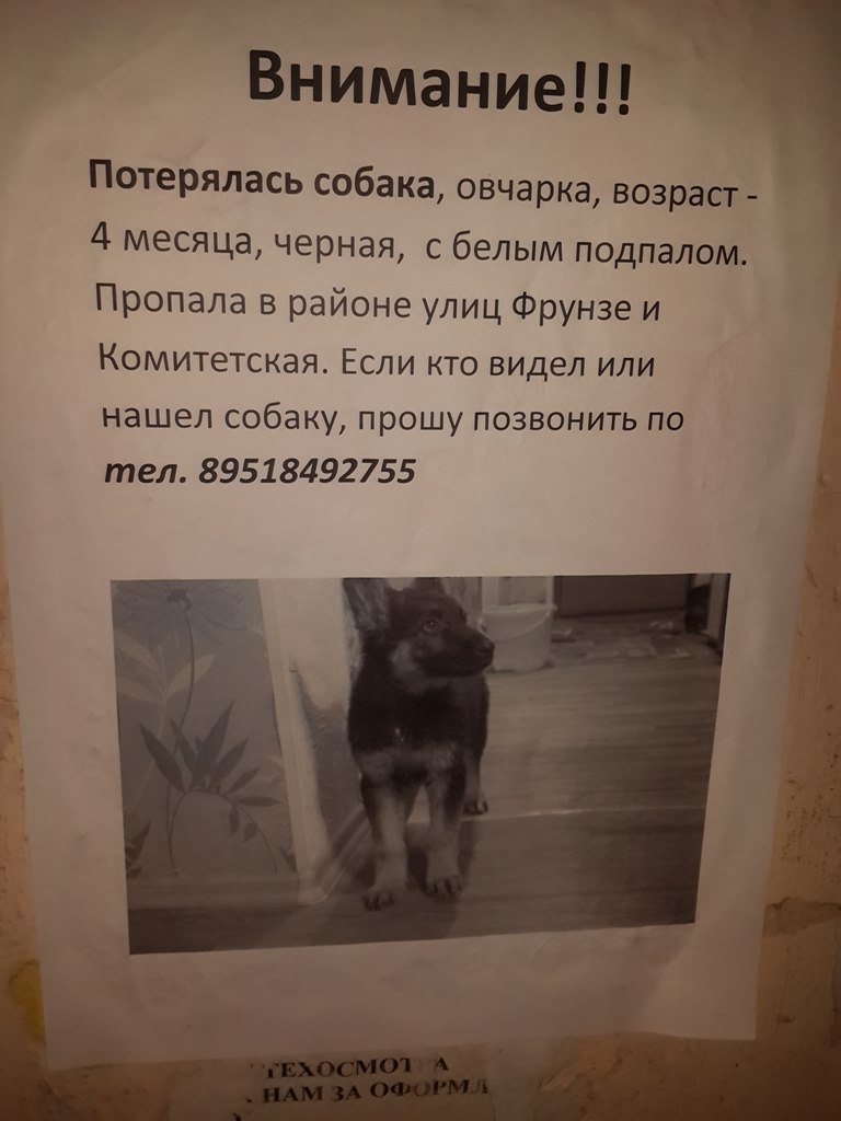 буквально сегодня на комитетской видел объявление на столбе - пропал щенок овчарки, 4 месяца.