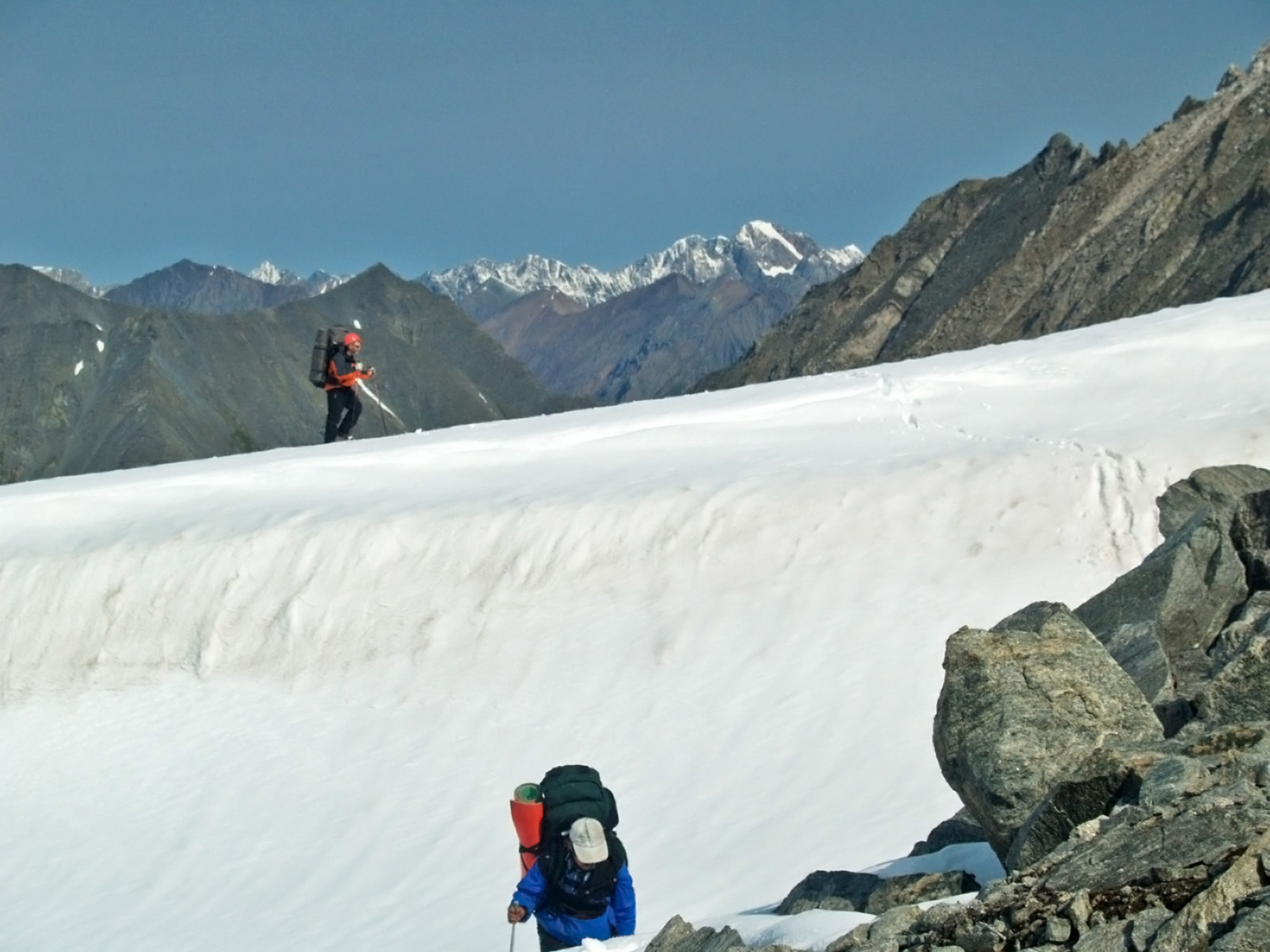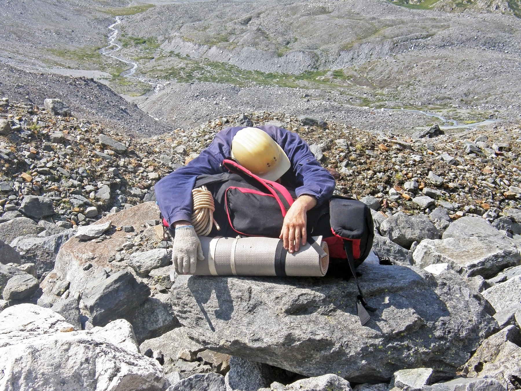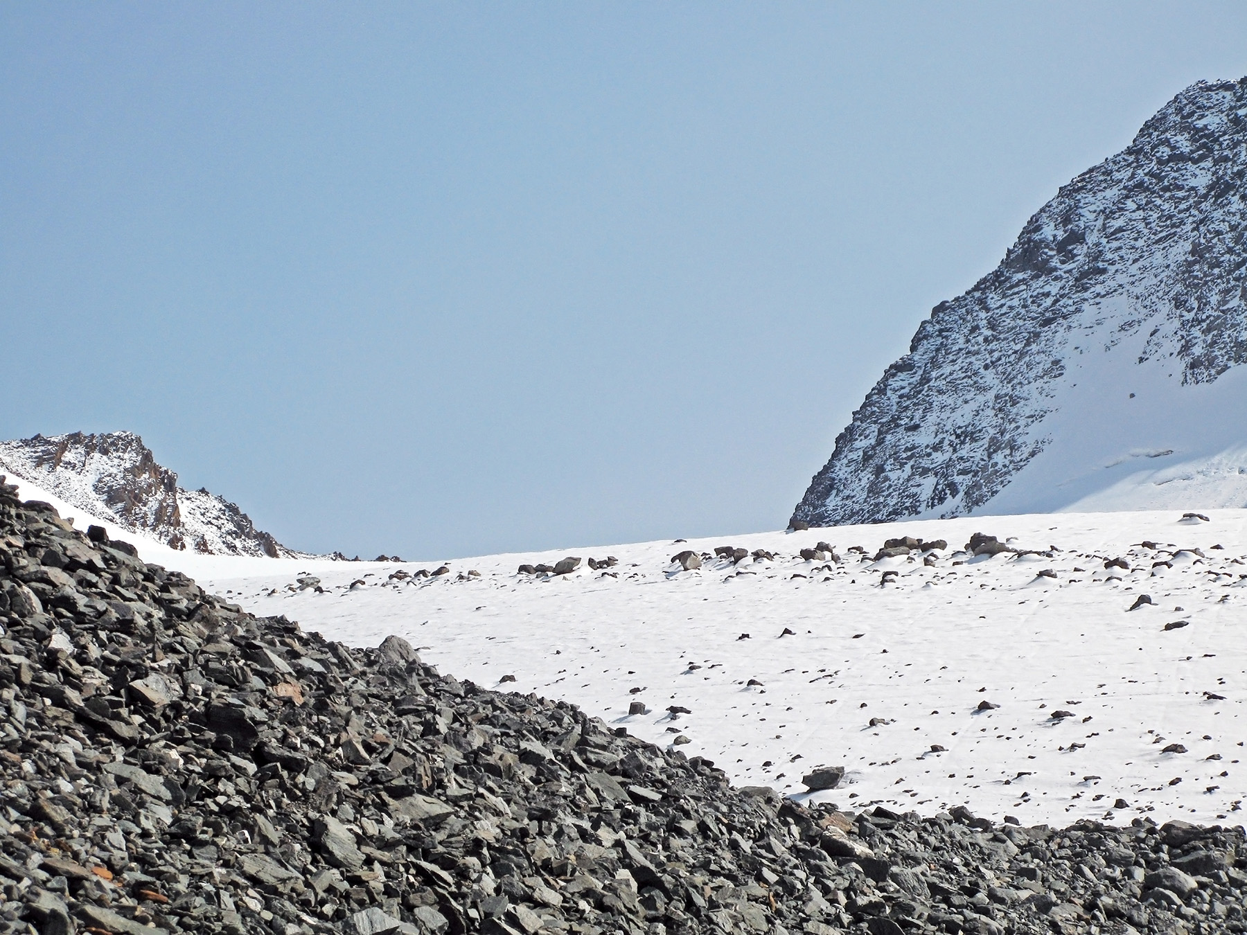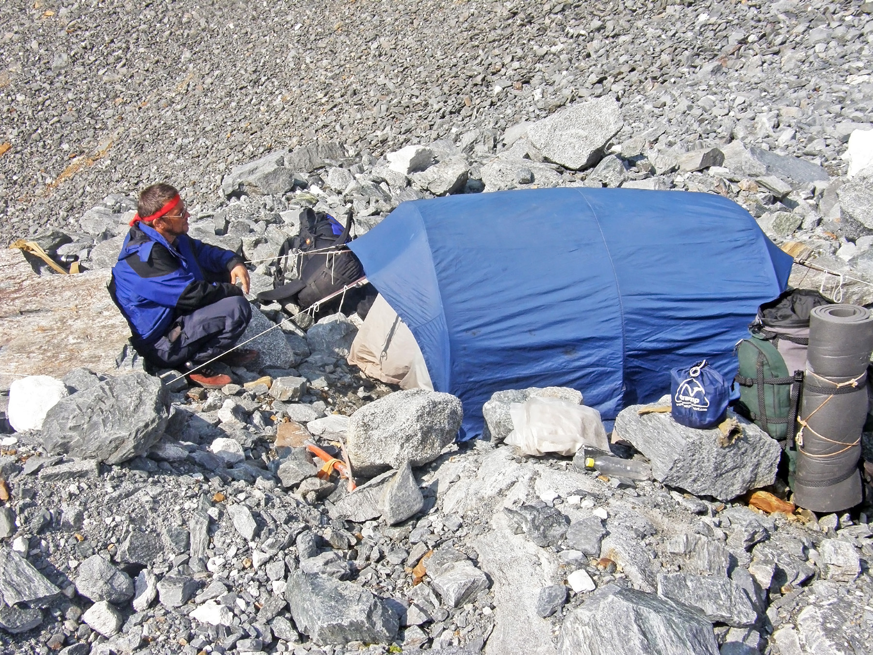В 13-30 собираем остатки сил, и делаем ещё один переход по гребню правобережной морены. Перед перегибом ледника находим горизонтальные площадки на не полностью вытаявшей гряды бараньих лбов. Есть расчищенные площадки под палатки. Время 14-00, с утра набрали чуть больше тысячи метров высоты. Чувствуется сильная усталость. Народ активно «давит» на меня, мол, давай станем здесь, пока места есть! Мол, устали, а дальше ледник, и возможная ночёвка на леднике, «не хотим!». Сдаюсь. Решаем здесь стать на стоянку, вода есть, из ручейков с ледника. Тут же организуем чай. После отдыха и чая ставим палатки. Время-начало четвёртого.
