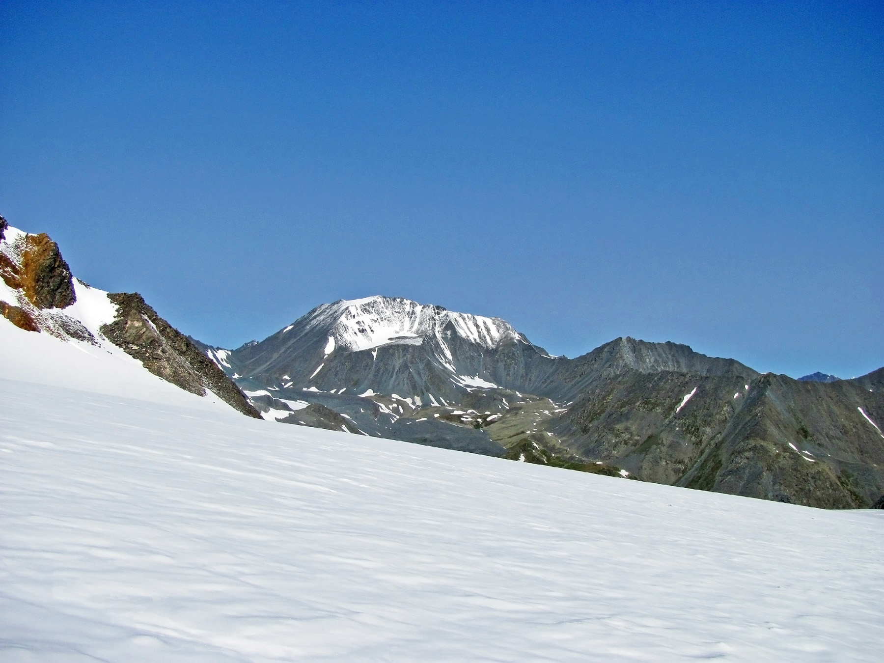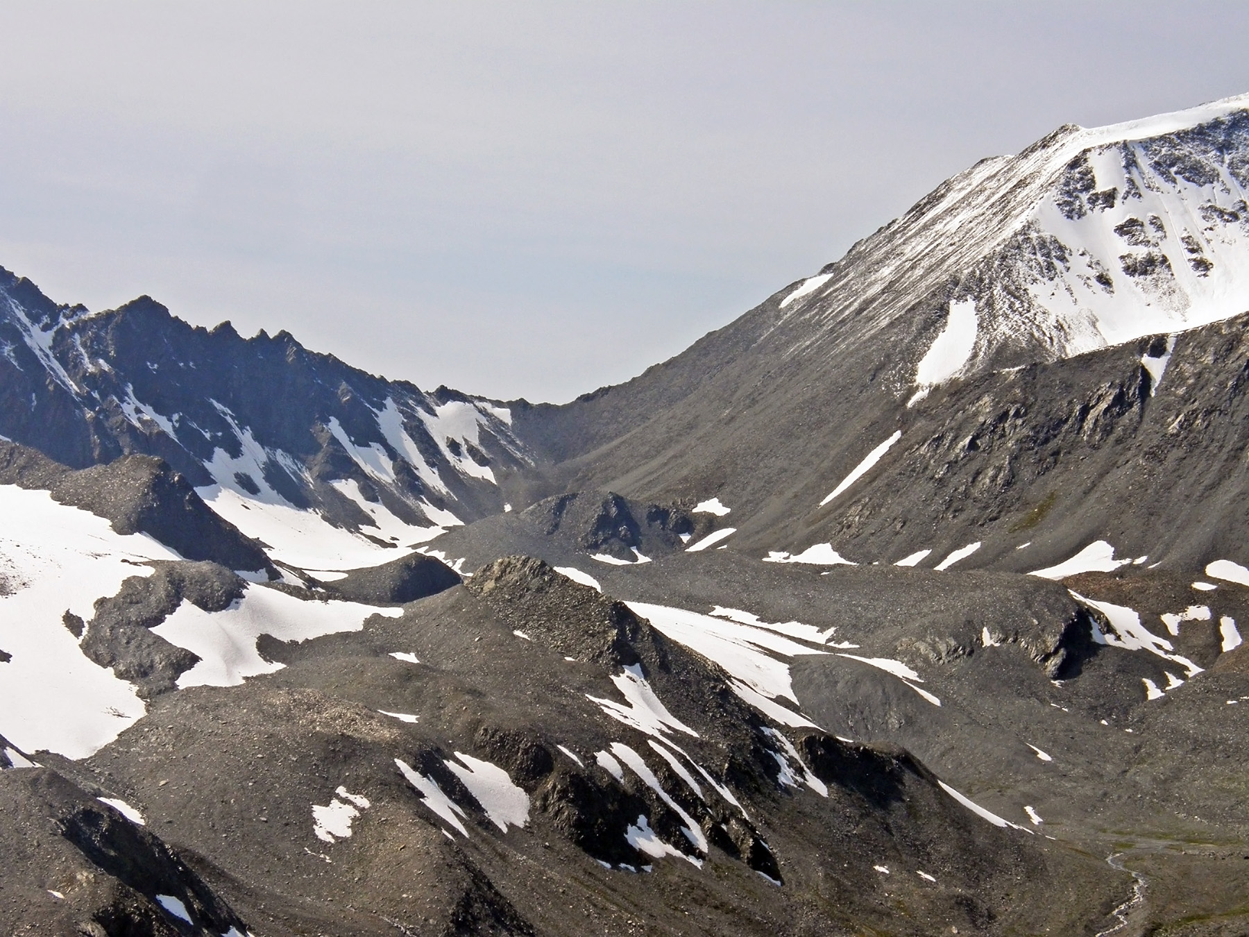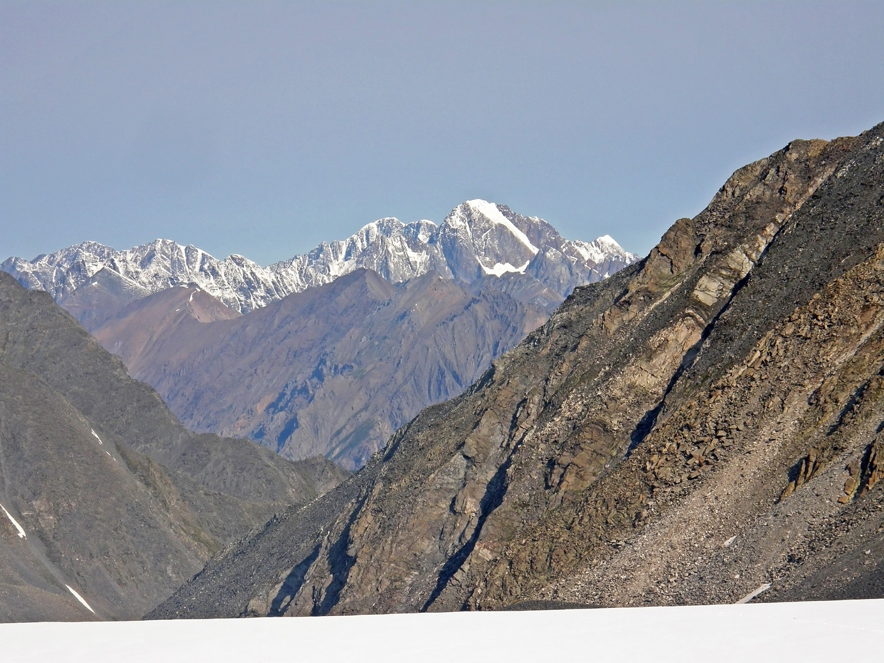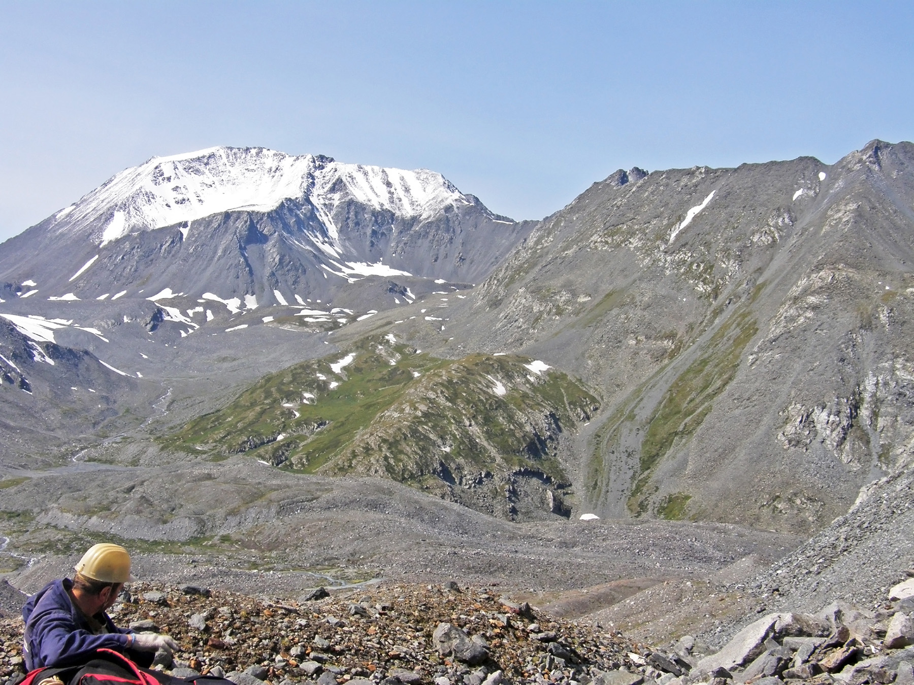 Мы набрали значительную высоту, отсюда хорошие виды на подходы под пер. НЭТИ, ДнепроГЭС, и ещё одну седловину, между вершинами 3496,6 и 3299,3, которая не имеет ещё названия (даже сейчас, спустя 15 лет), ведущую на север, в верховья правого, сухого притока в среднем течении реки Мештуайры (Мештуайры, ниже, сливается с Оштуайры, и образуют реку Караайры, которая через 3 км впадает в реку Карагем). На космокарте из этой долинки виден обширный вынос обломочного материала, «не дотянувший» до русла Мештуайры метров 150.