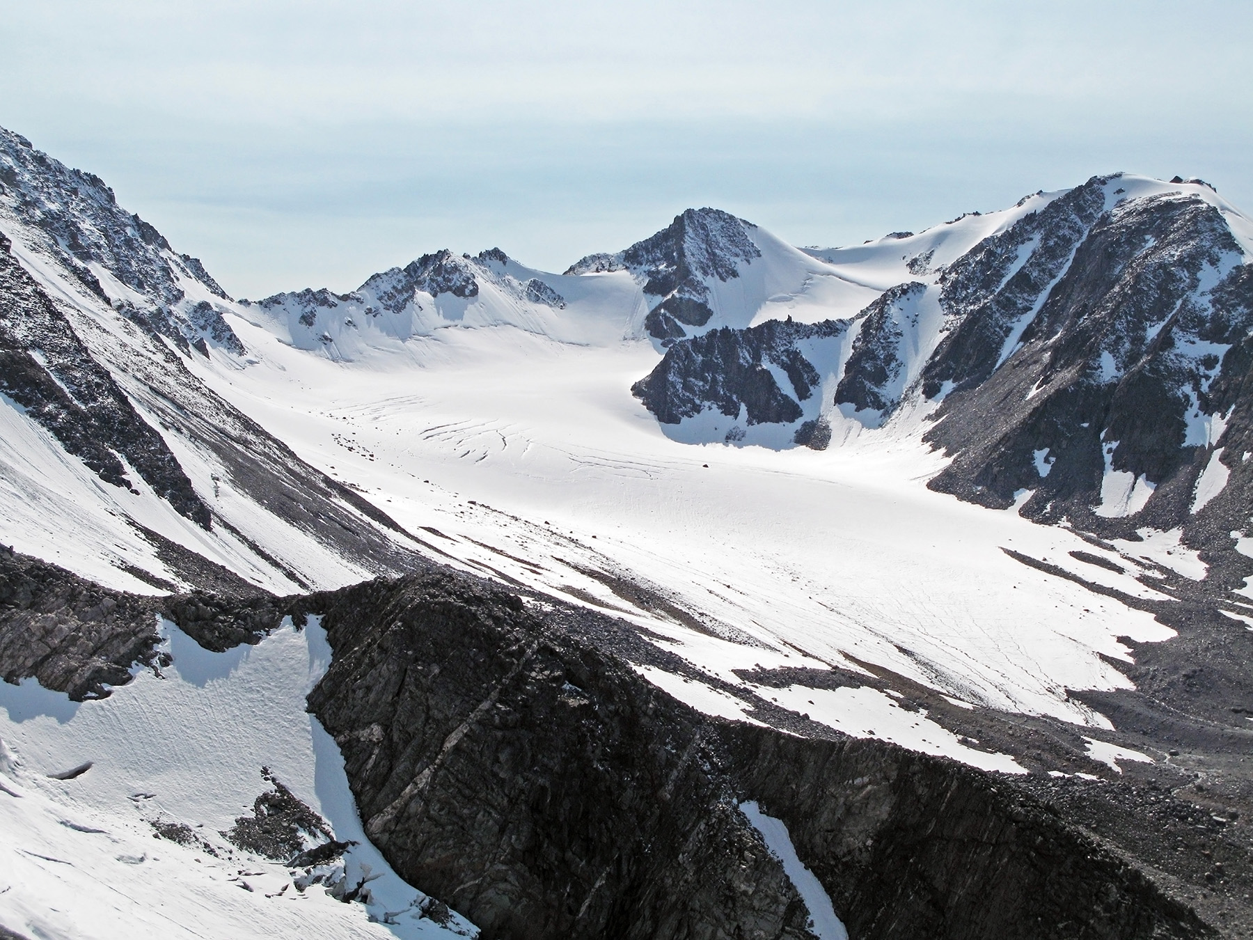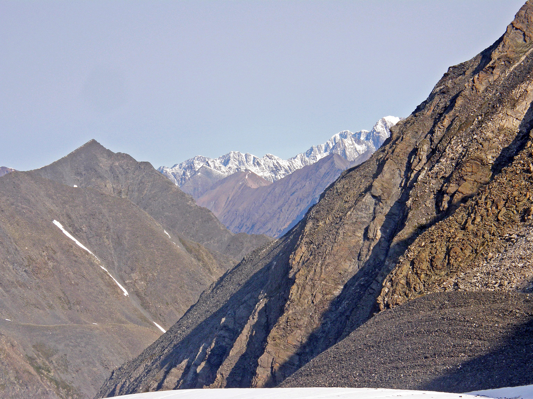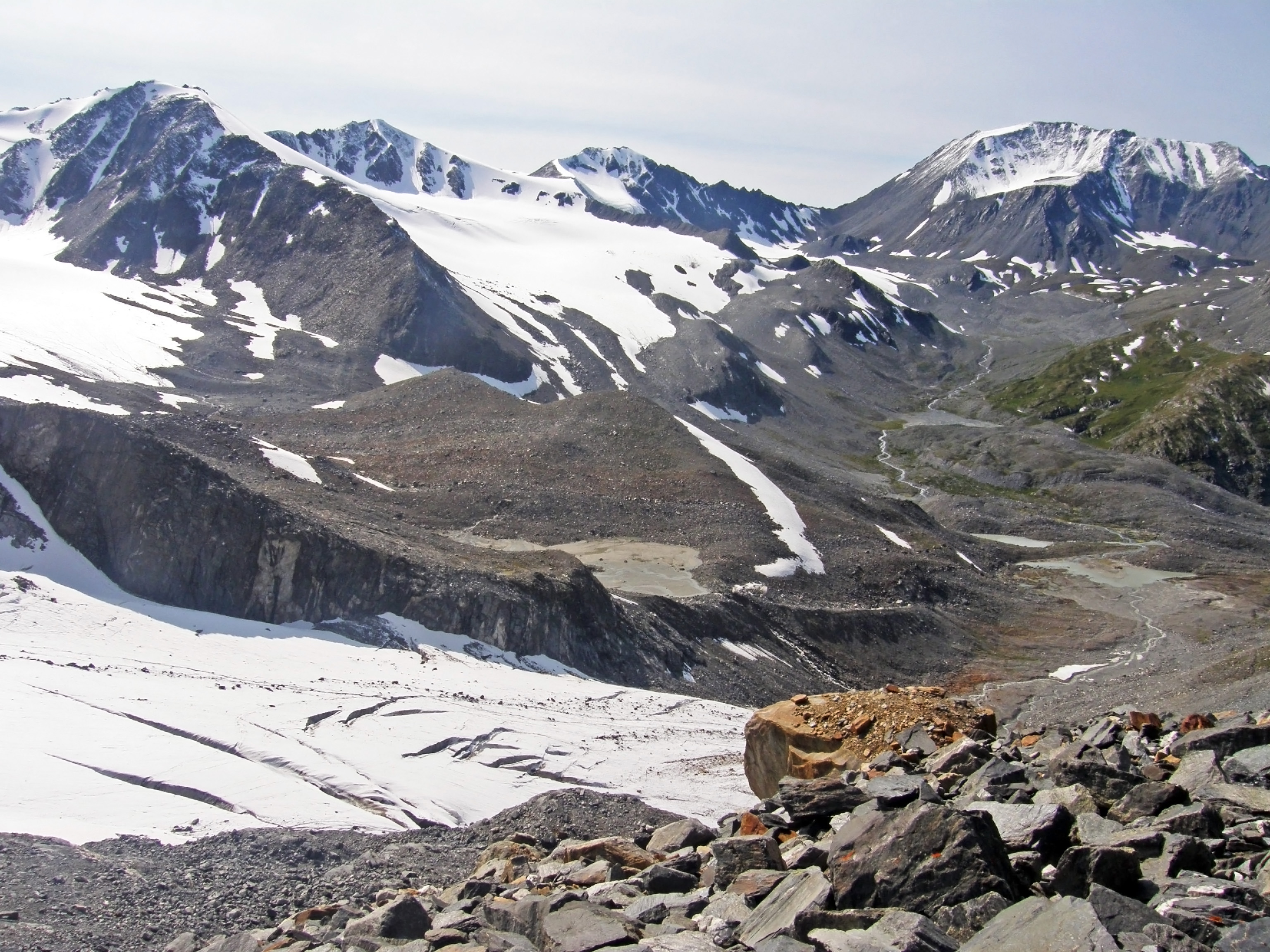 Мы набрали значительную высоту, отсюда хорошие виды на подходы под пер. НЭТИ, ДнепроГЭС, и ещё одну седловину, между вершинами 3496,6 и 3299,3, которая не имеет ещё названия (даже сейчас, спустя 15 лет), ведущую на север, в верховья правого, сухого притока в среднем течении реки Мештуайры (Мештуайры, ниже, сливается с Оштуайры, и образуют реку Караайры, которая через 3 км впадает в реку Карагем). На космокарте из этой долинки виден обширный вынос обломочного материала, «не дотянувший» до русла Мештуайры метров 150.
