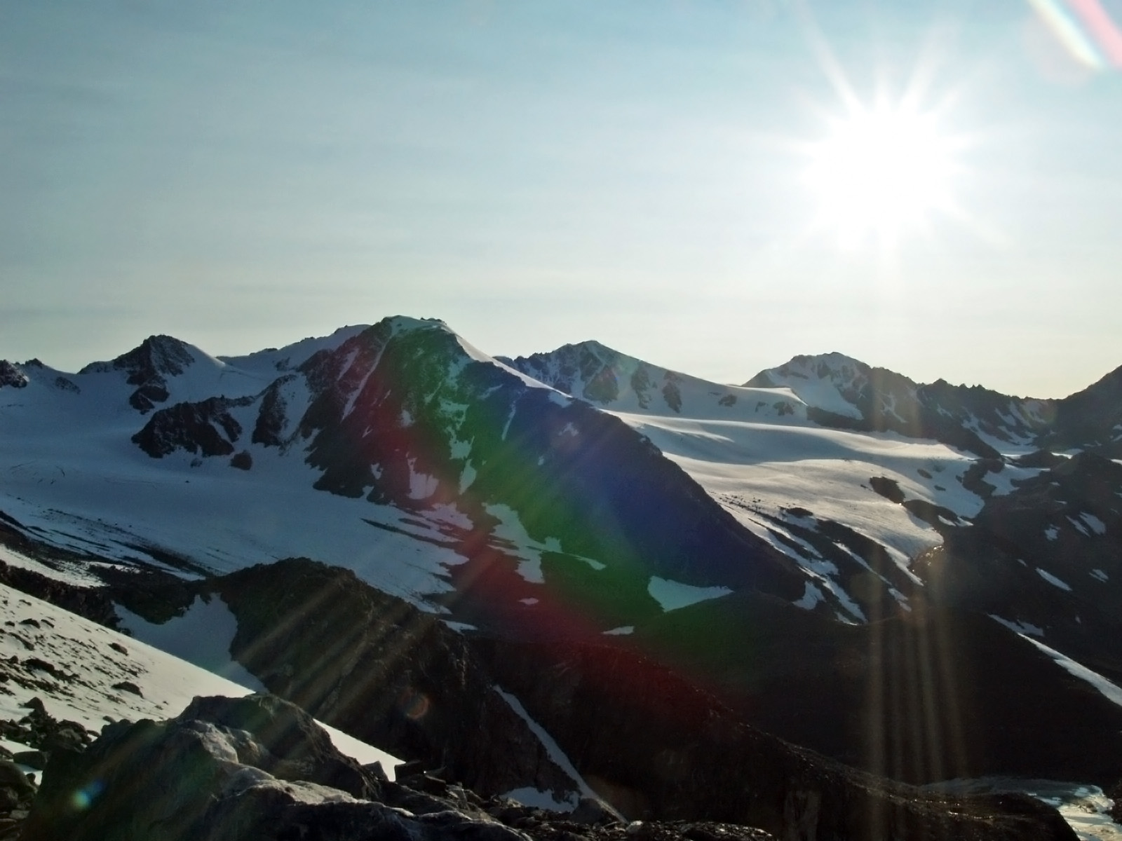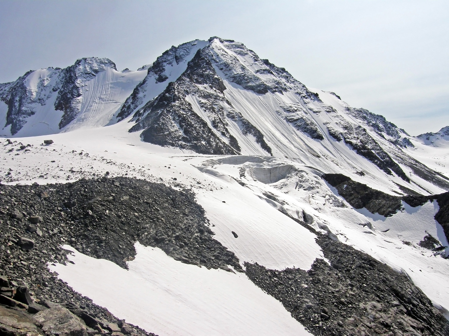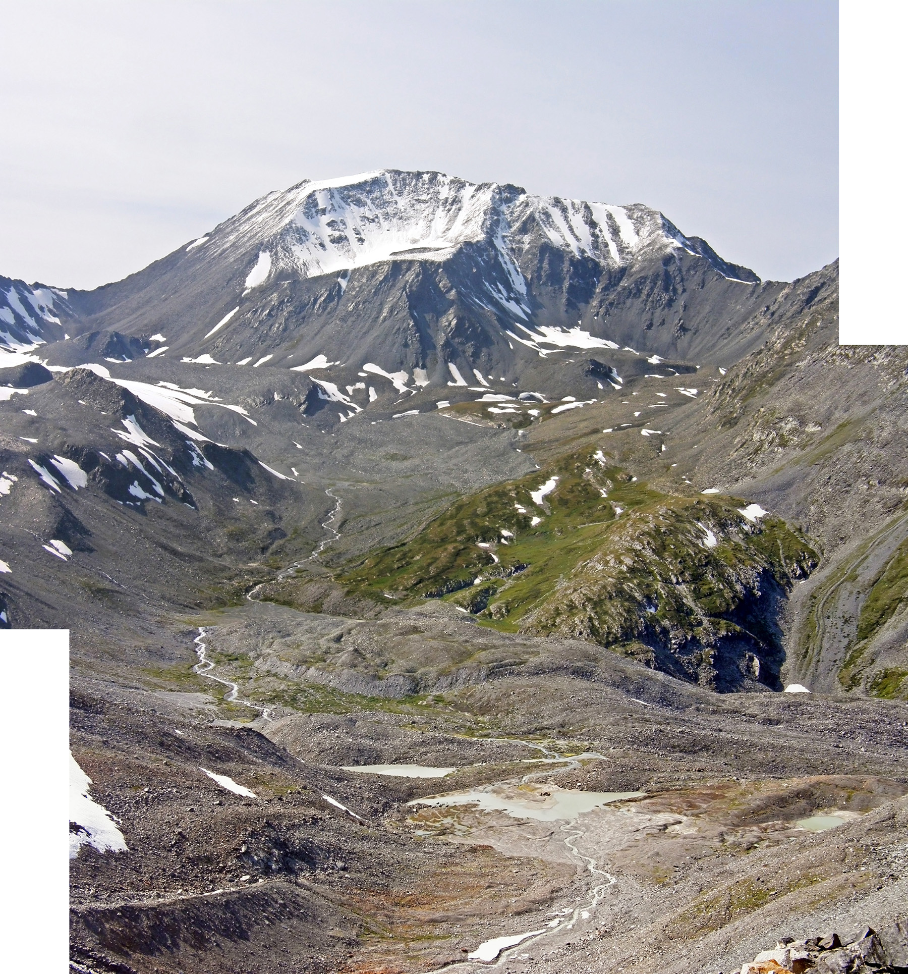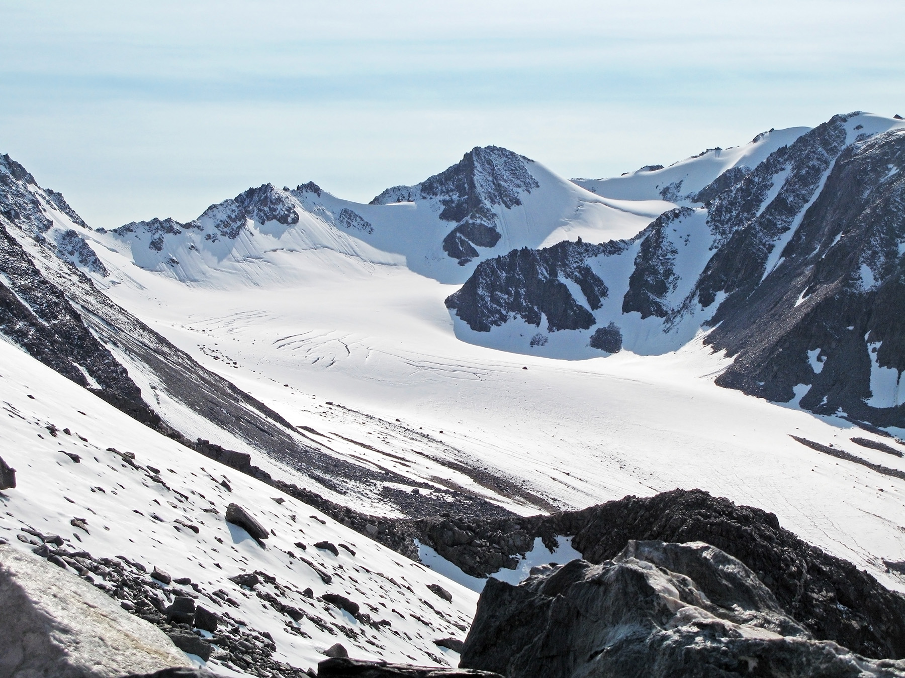 Мы набрали значительную высоту, отсюда хорошие виды на подходы под пер. НЭТИ, ДнепроГЭС, и ещё одну седловину, между вершинами 3496,6 и 3299,3, которая не имеет ещё названия (даже сейчас, спустя 15 лет), ведущую на север, в верховья правого, сухого притока в среднем течении реки Мештуайры (Мештуайры, ниже, сливается с Оштуайры, и образуют реку Караайры, которая через 3 км впадает в реку Карагем). На космокарте из этой долинки виден обширный вынос обломочного материала, «не дотянувший» до русла Мештуайры метров 150.