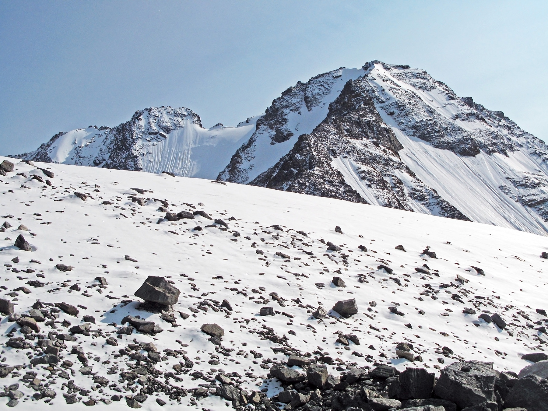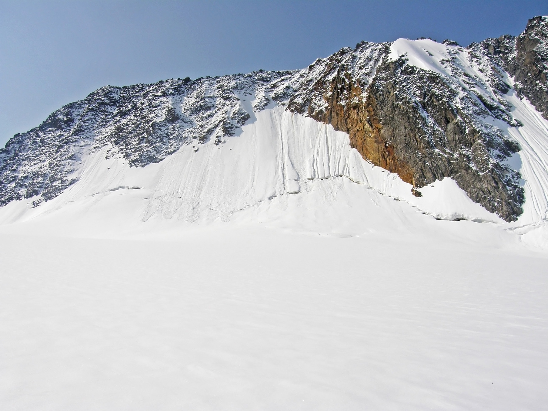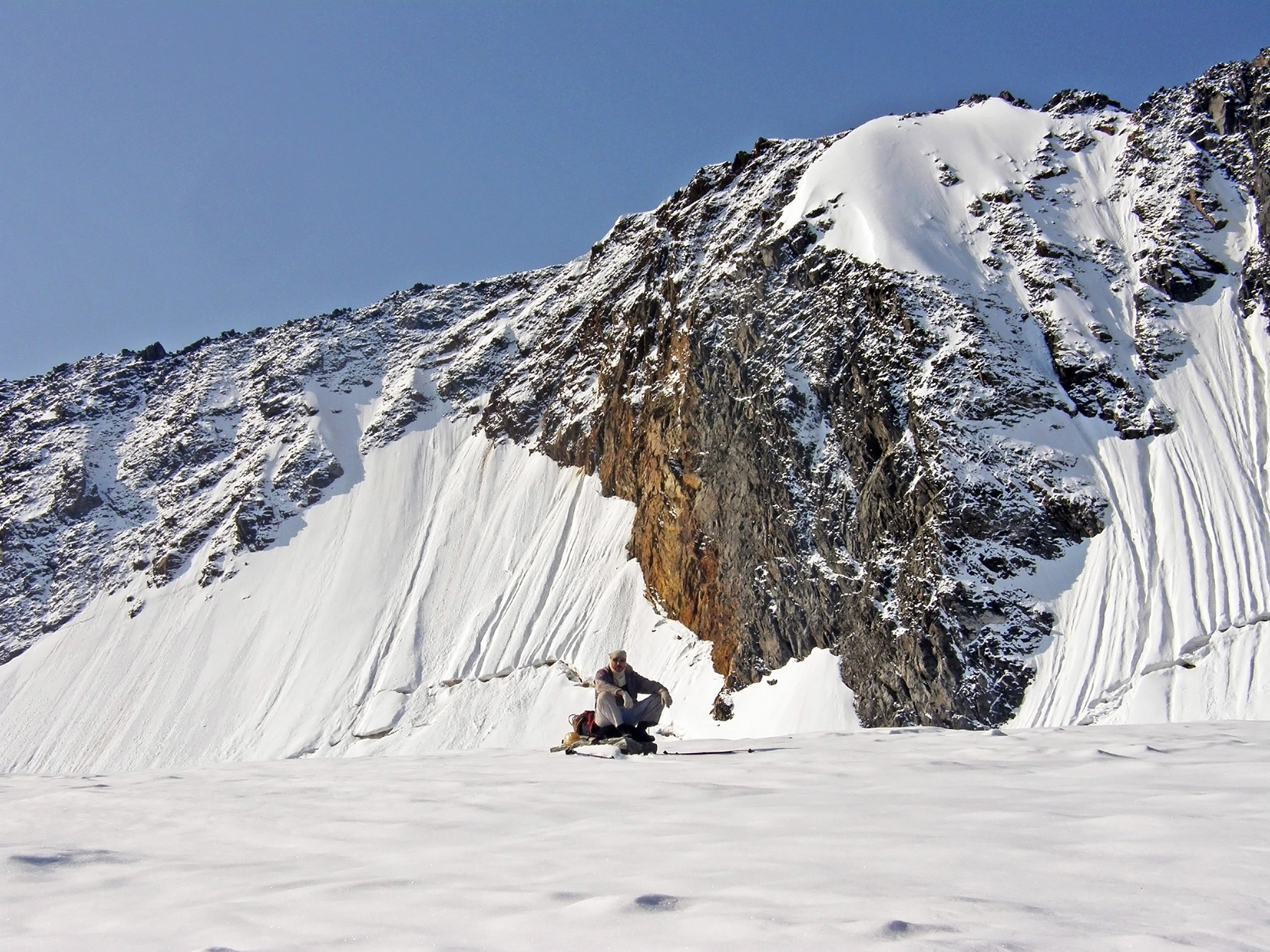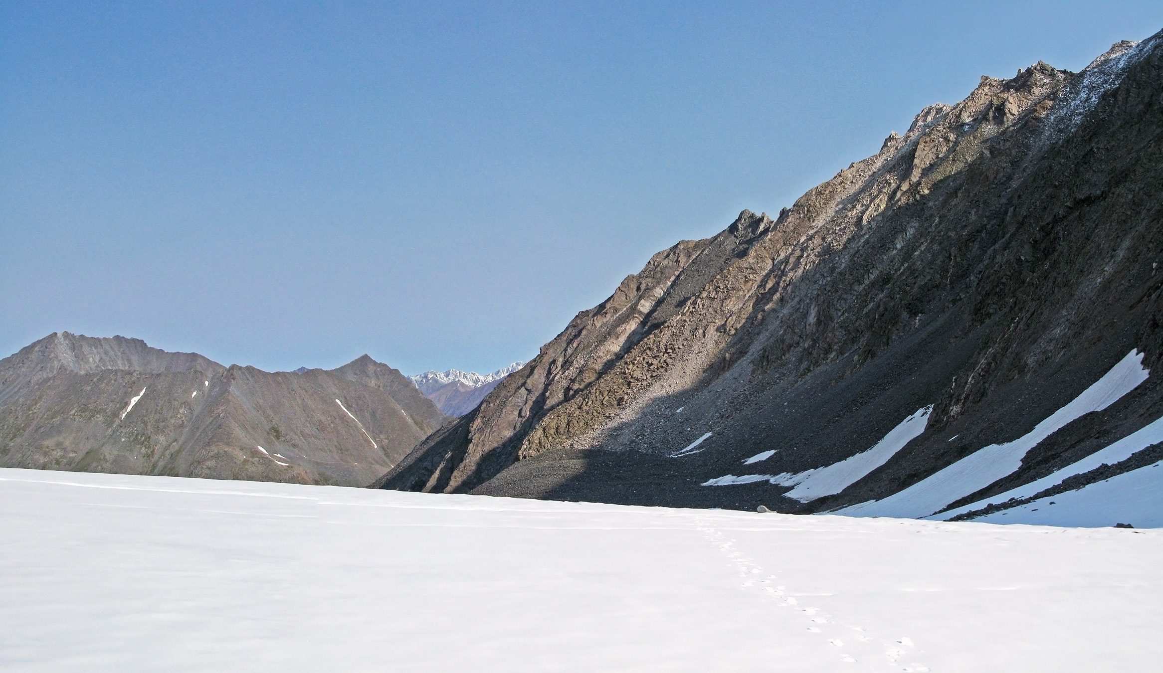 В 8-30 сели на первый привал. Прямо на леднике. Камней нет. В 8-40 продолжаем движение. В снежно-скальном гребне справа от нас должен быть перевал Тюнь Западный (2-Б; 3100). Под путь подъёма к нему подходит широкий снежный склон в этом гребне. Седловина-заснеженный гребень, на склоне видны полосы от схода мелких лавин. И в середине склон подрезан бергшрундом. Когда-то я заявлял его в несостоявшийся поход 97-го года.