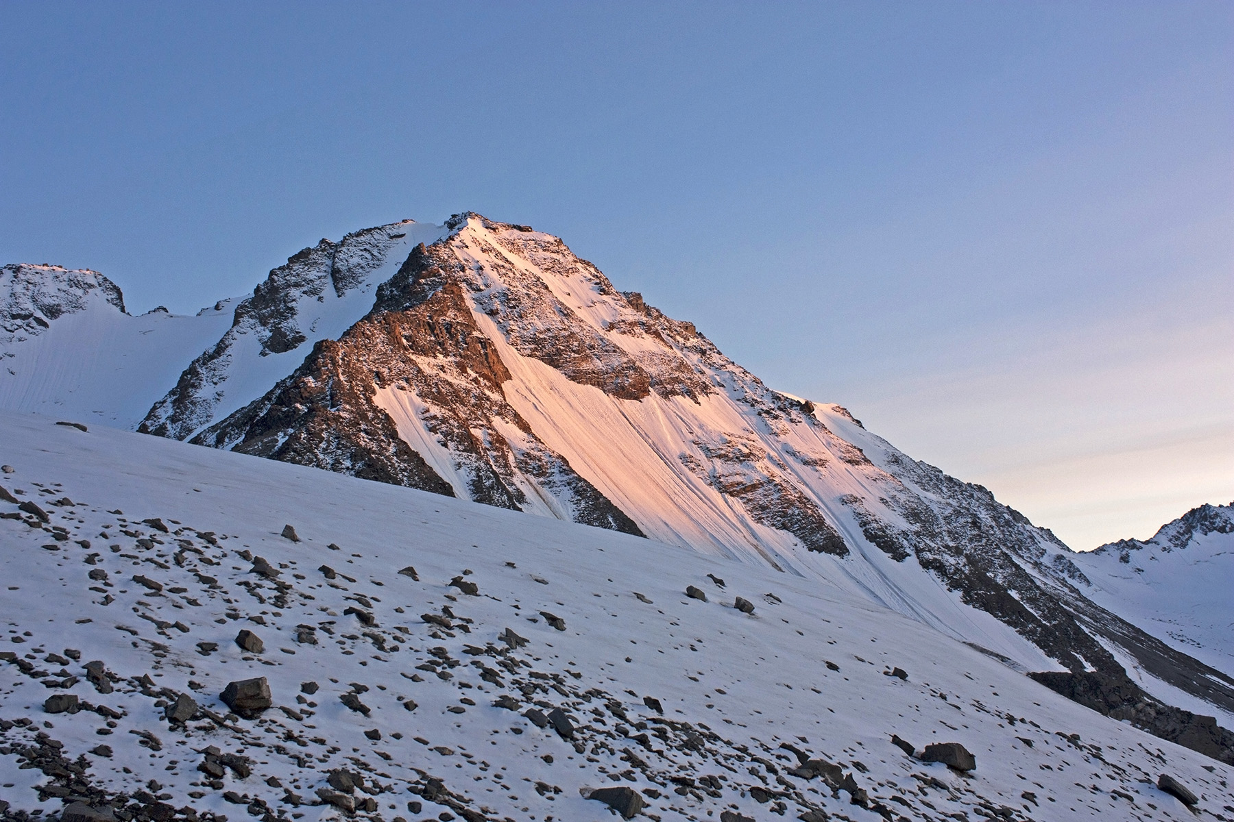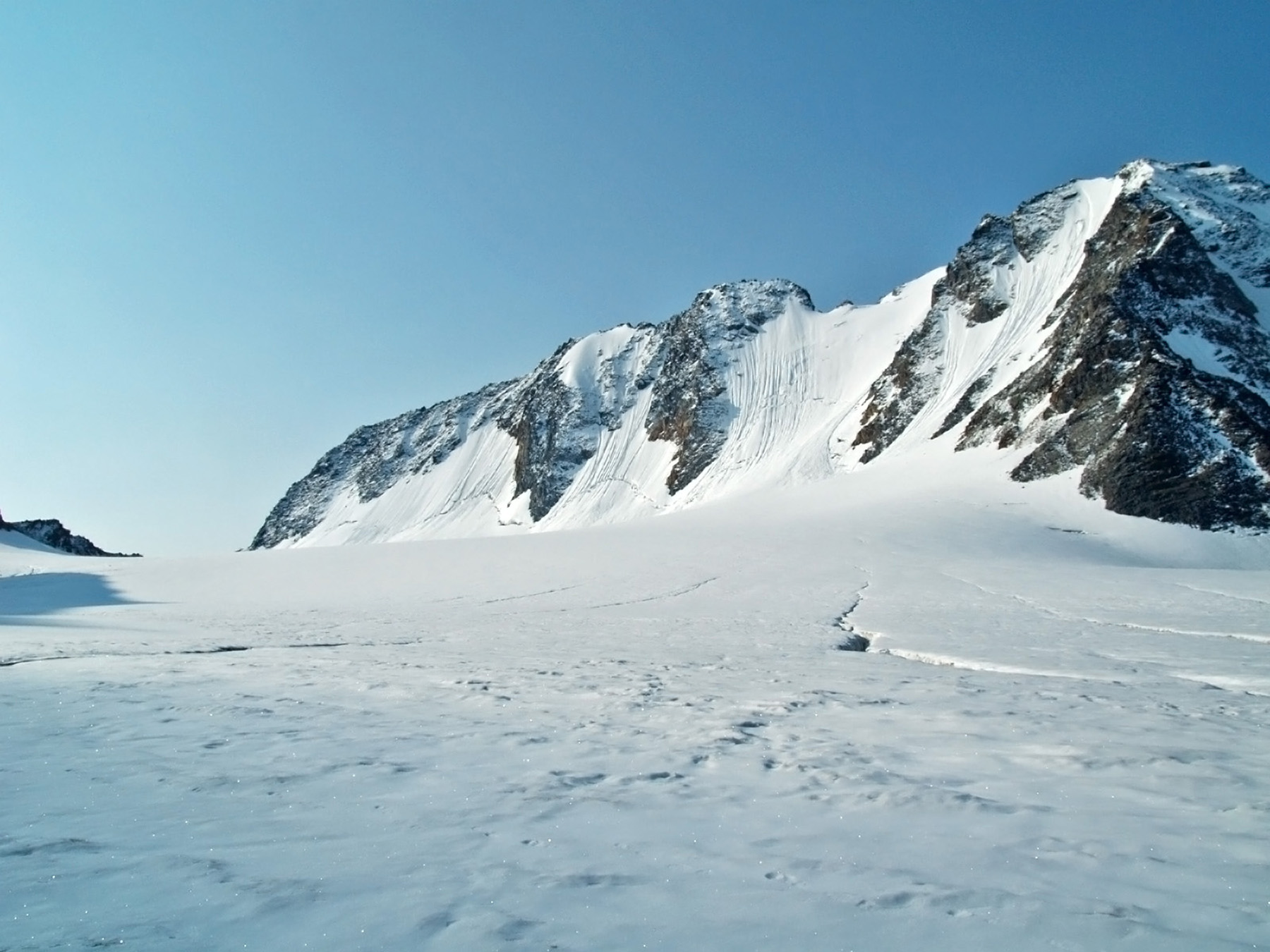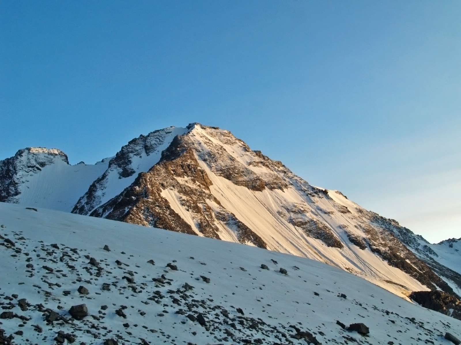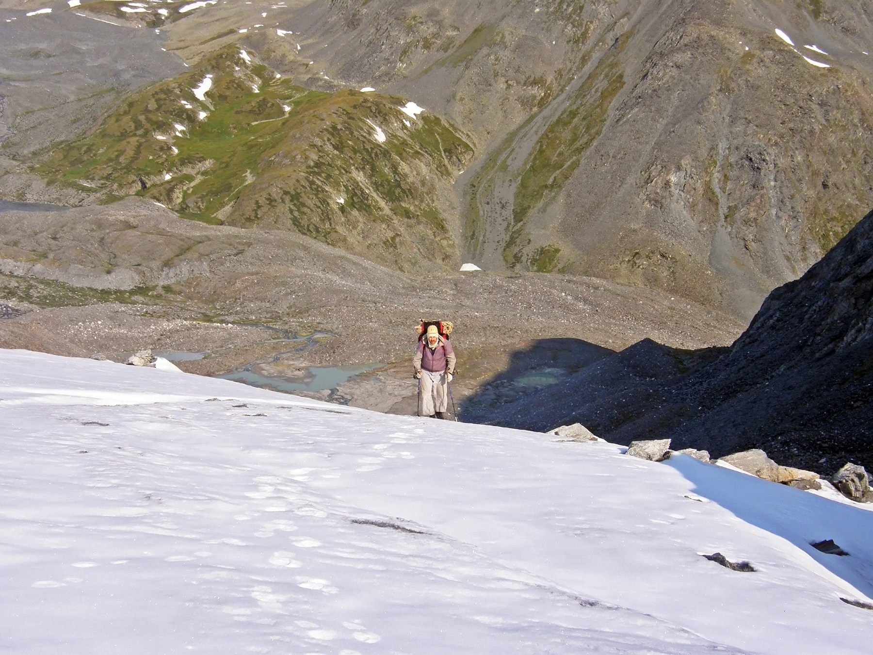 В 8-30 сели на первый привал. Прямо на леднике. Камней нет. В 8-40 продолжаем движение. В снежно-скальном гребне справа от нас должен быть перевал Тюнь Западный (2-Б; 3100). Под путь подъёма к нему подходит широкий снежный склон в этом гребне. Седловина-заснеженный гребень, на склоне видны полосы от схода мелких лавин. И в середине склон подрезан бергшрундом. Когда-то я заявлял его в несостоявшийся поход 97-го года.