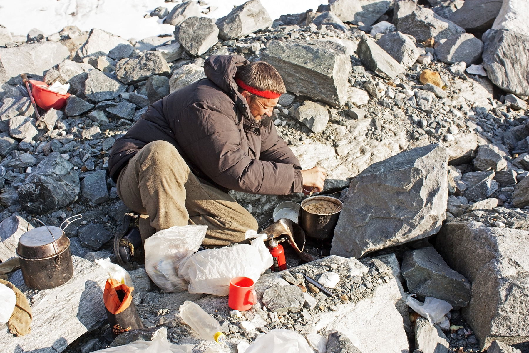 К 17-00 холодает, у нас высота где-то 3040, и ледник рядом. Утепляемся-одеваемся. Начинаем готовить ужин. Вместо мяса-спаржа. Док начинает злиться. Обильно использует все доступные специи. Вечером, в палатке, Серёга проводит сеанс иглорефлексотерапии Лёне. Курс лечения продолжается.