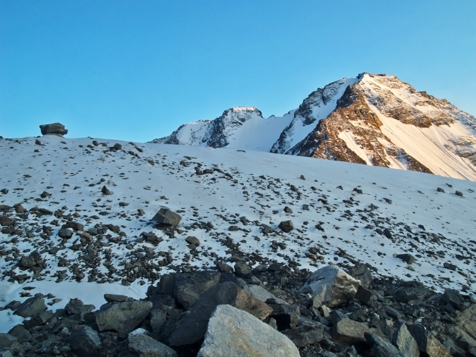 Выходим со стоянки в 8-00. Сразу выходим на ледник, и проходим около ледово-каменного гриба. Попутно фотографируя его с разных сторон. На леднике тонкий слой снега. Трещины хорошо видны. Их немного, концентрируются в центральной части ледника, на крутом перегибе. Мы держимся левой стороны, там, где их поменьше. Кошки не стали одевать, и в связки не стали связываться. Посчитали, что здесь в этом нет необходимости.