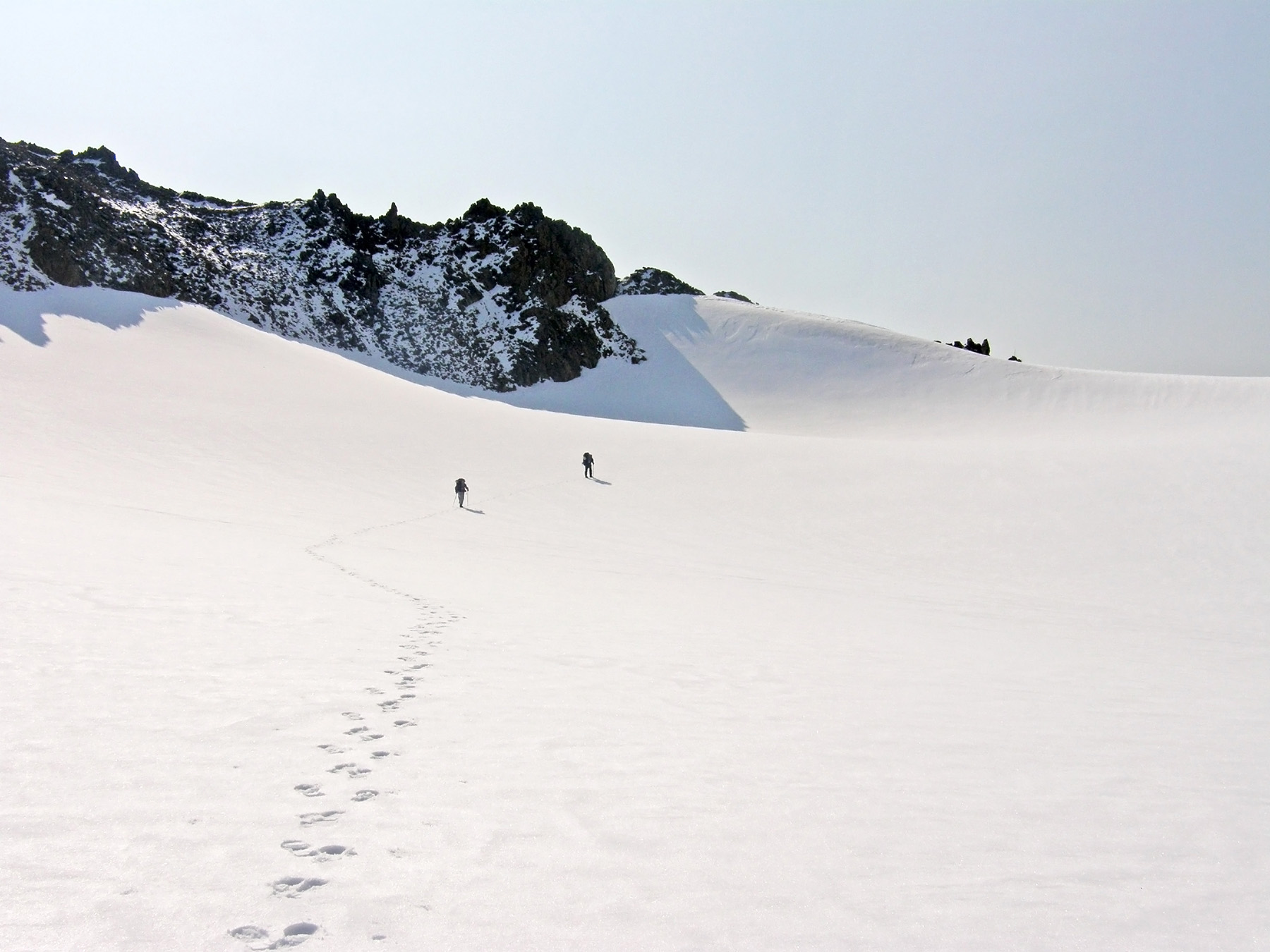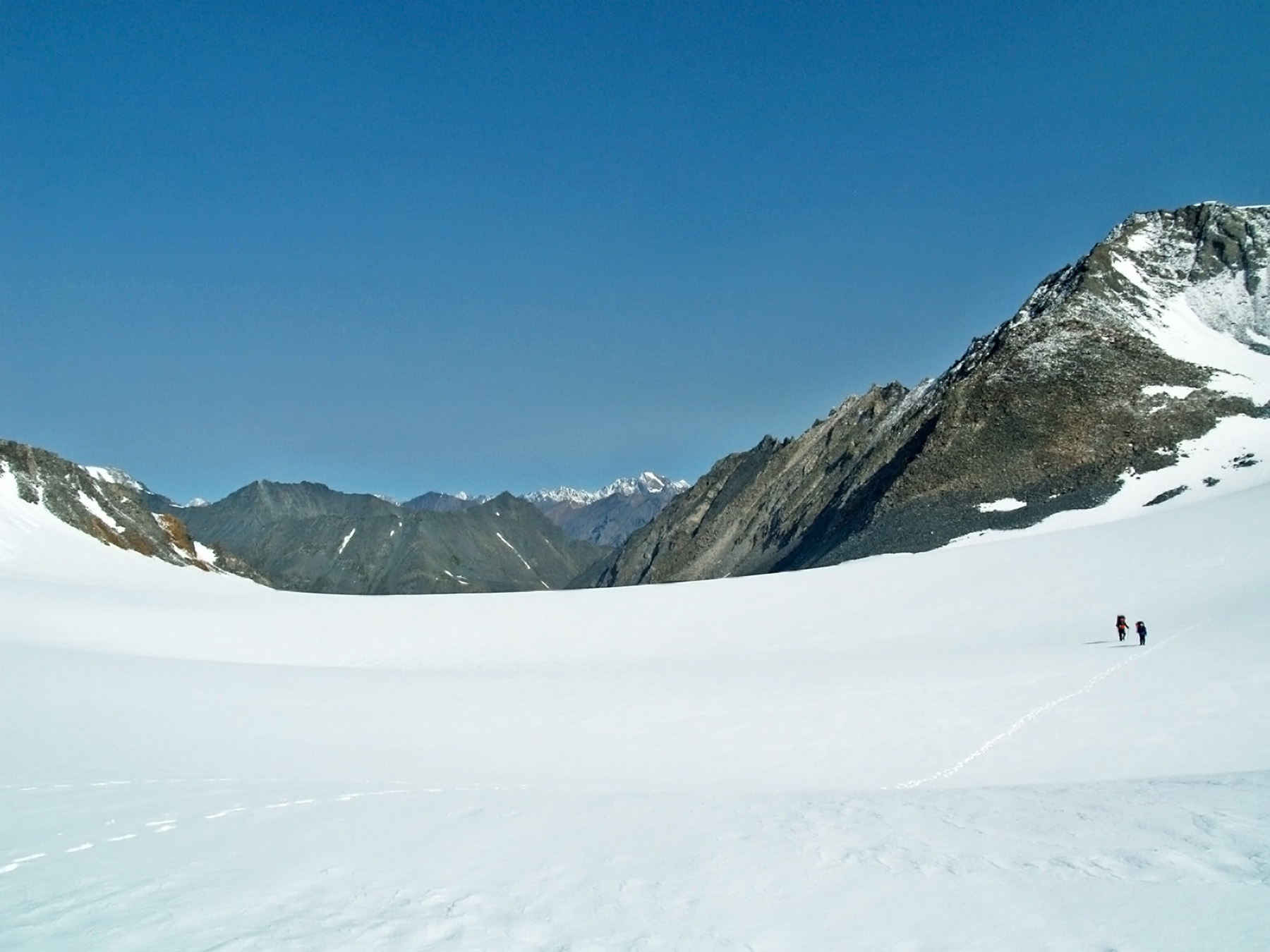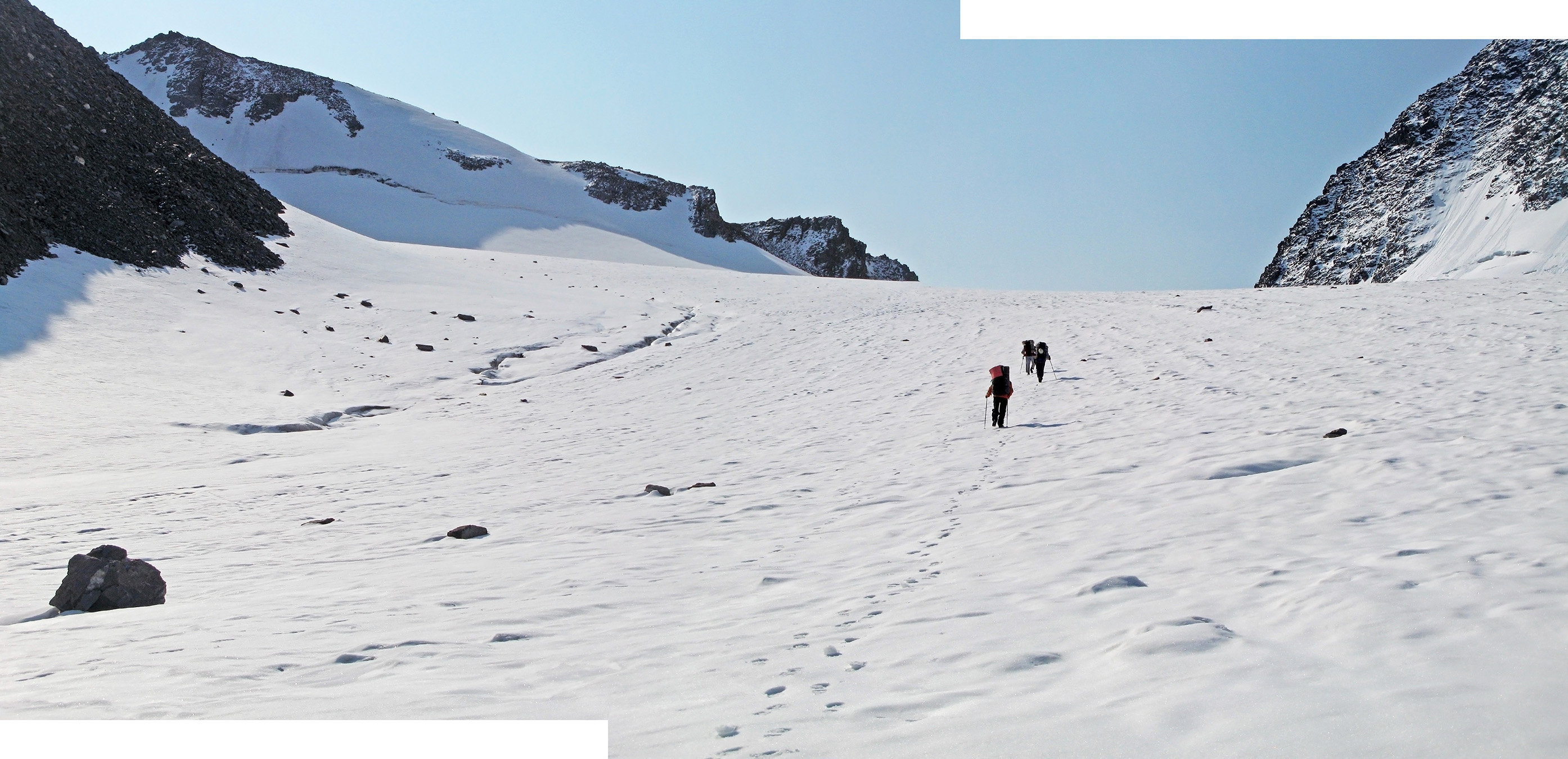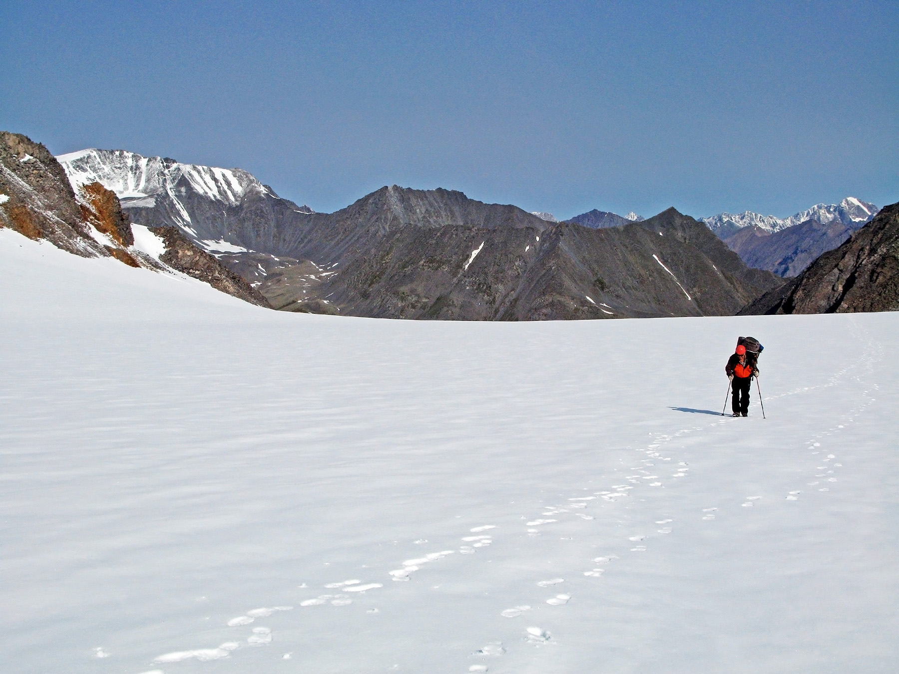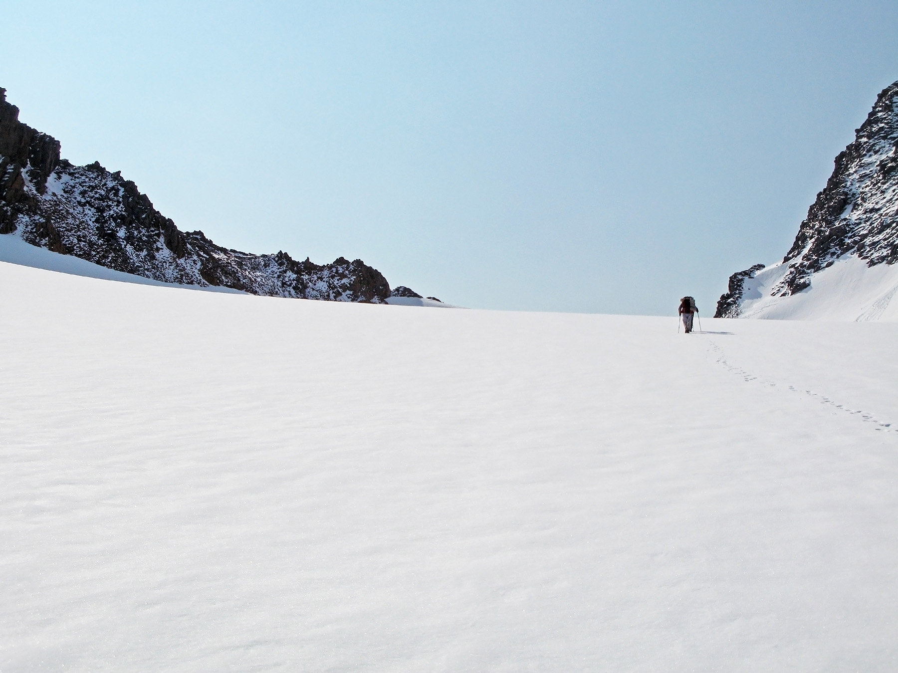 За 10-15 минут поднимаемся на ровную часть ледника, с некрутым набором высоты в сторону перевала. Впереди открылся вид на седловину Обманутых Надежд. До перевала отсюда чуть меньше полутора километров. Идём по плато, фотографируем друг друга и окрестности.