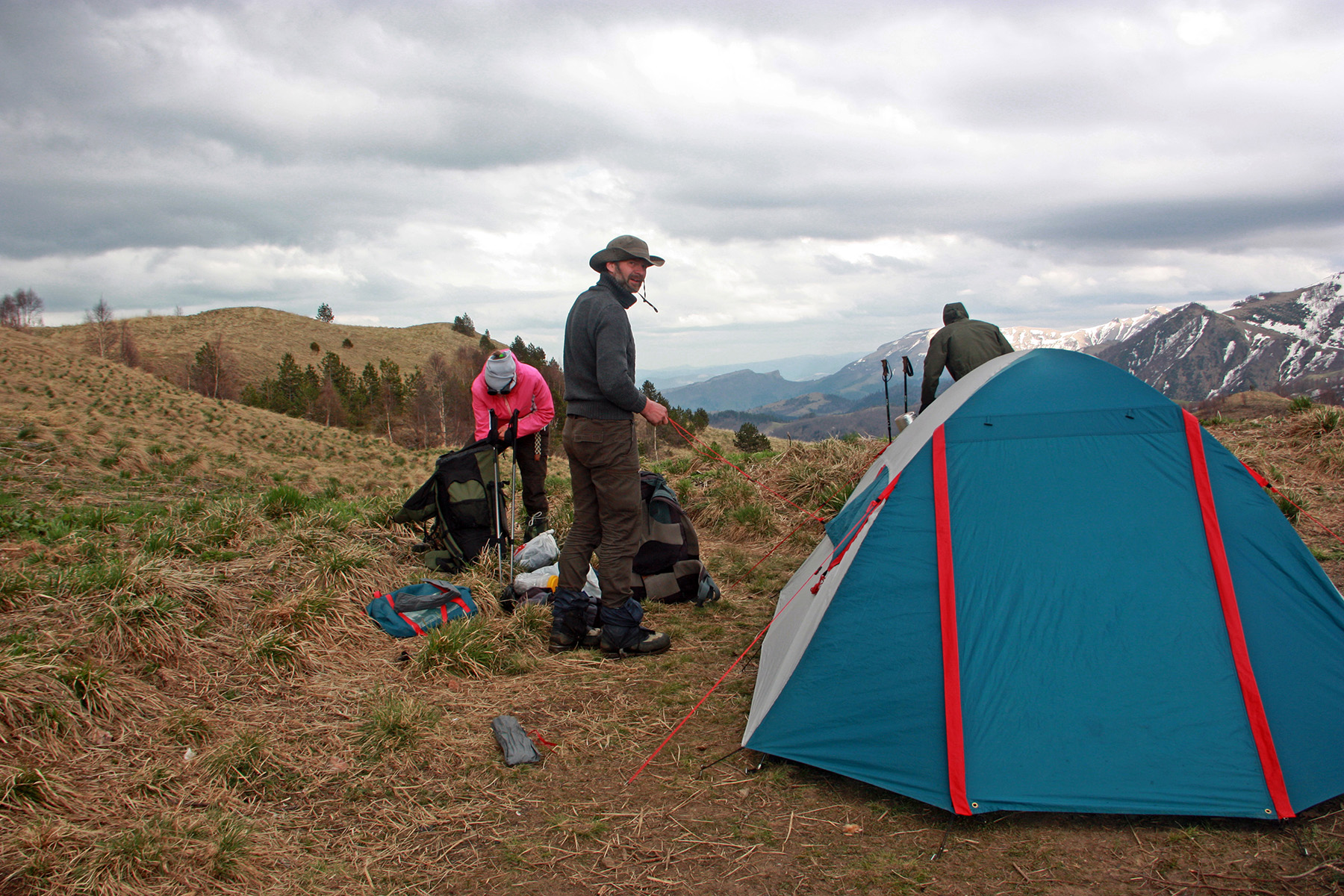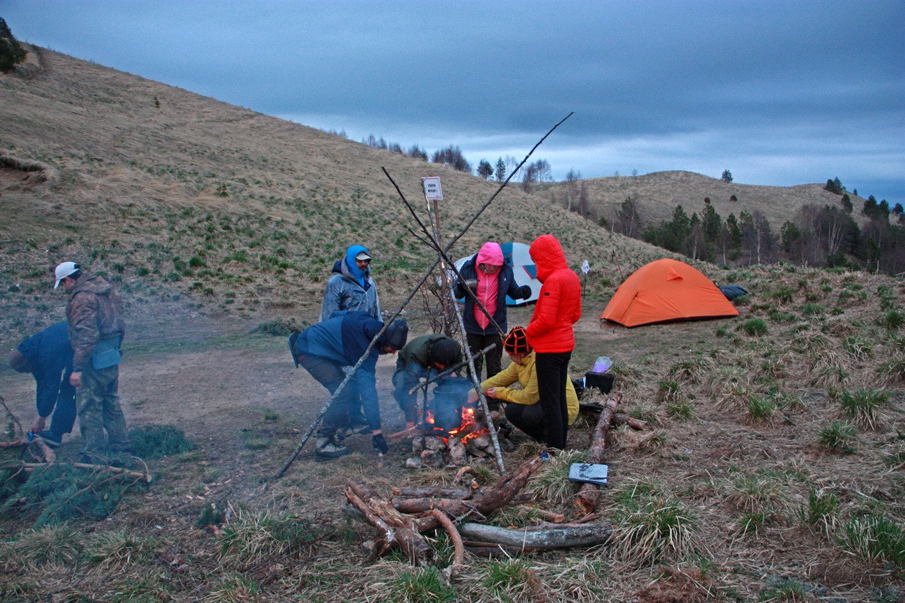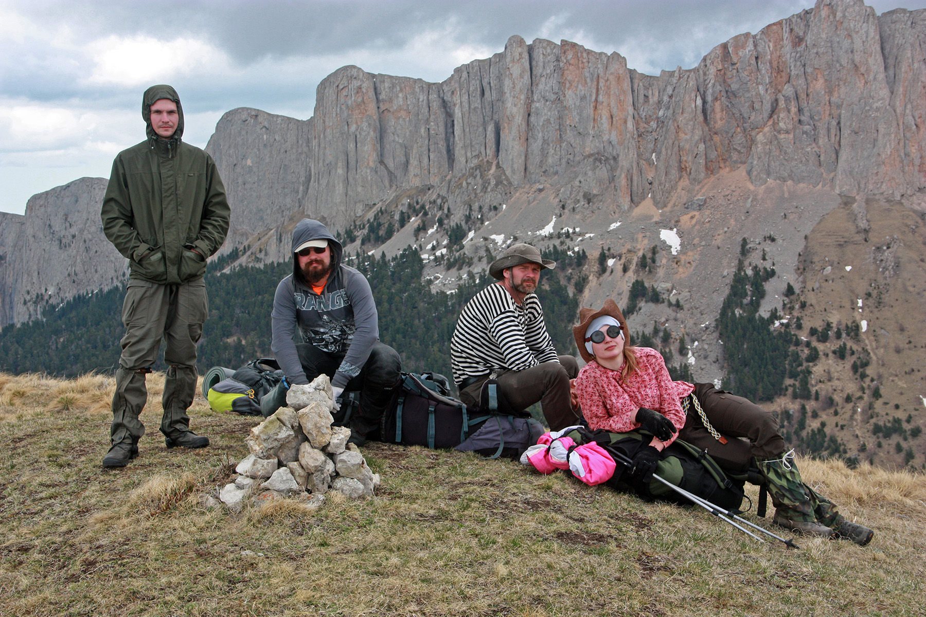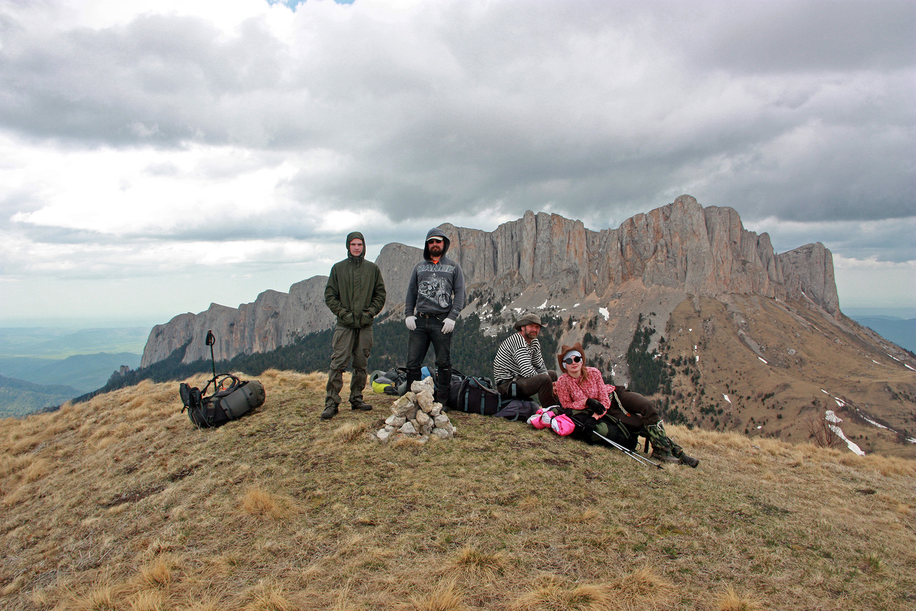 В 16-10 выходим на Тхачский перевал. Перевал-не перевал, плато. В центре вытоптана площадка под десяток-другой палаток. Более-менее ровно. Далее вокруг кочки, и другие «сопутствующие неровности». Мы пришли первые, это радует. Выбираем самые оптимальные места под свои палатки.