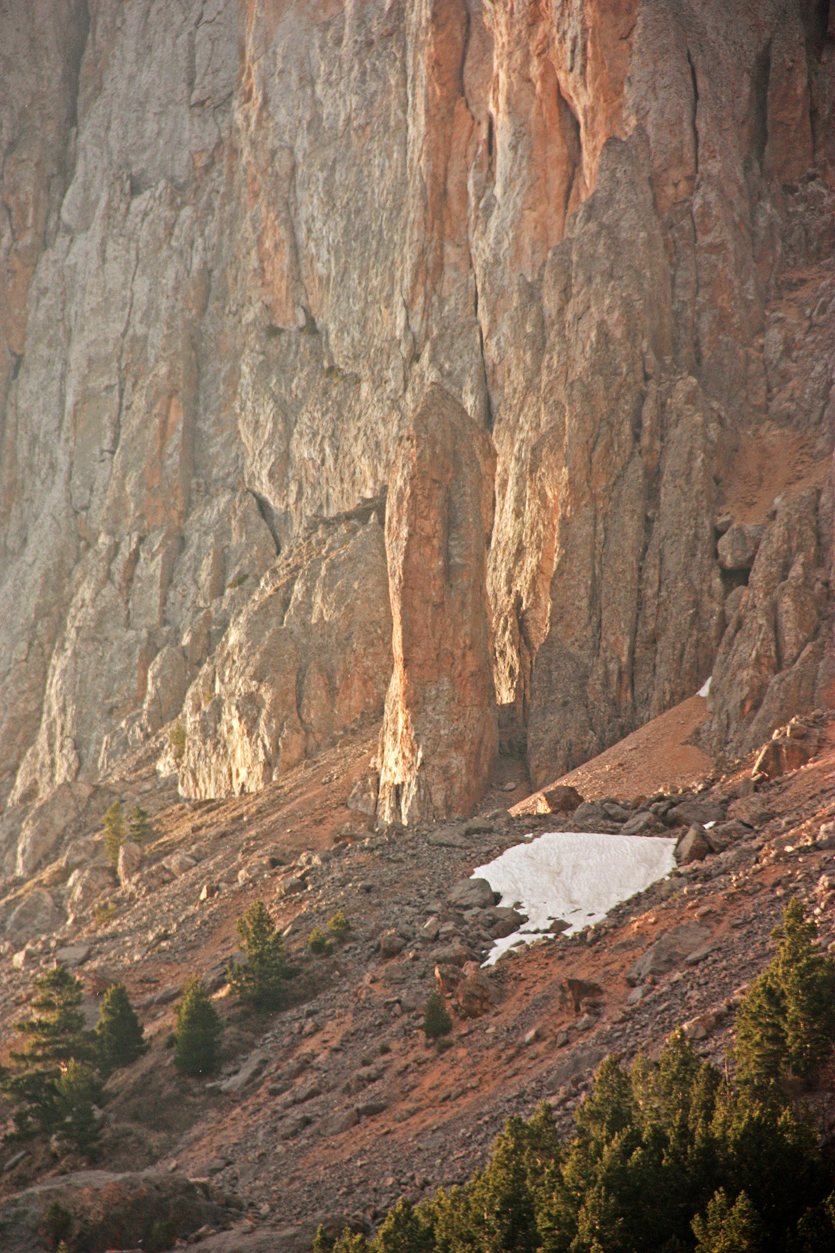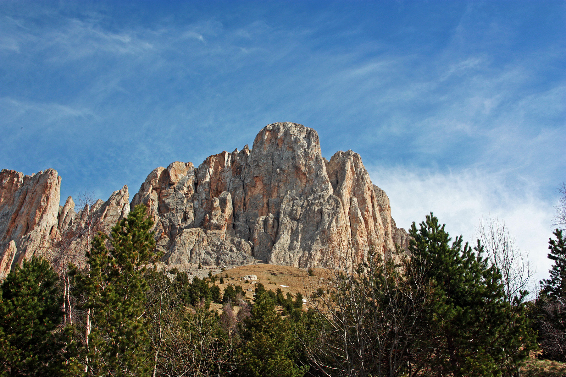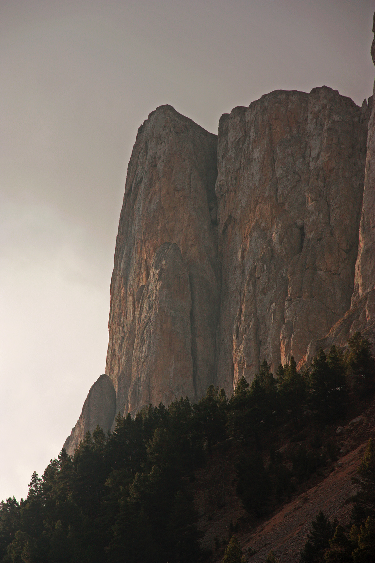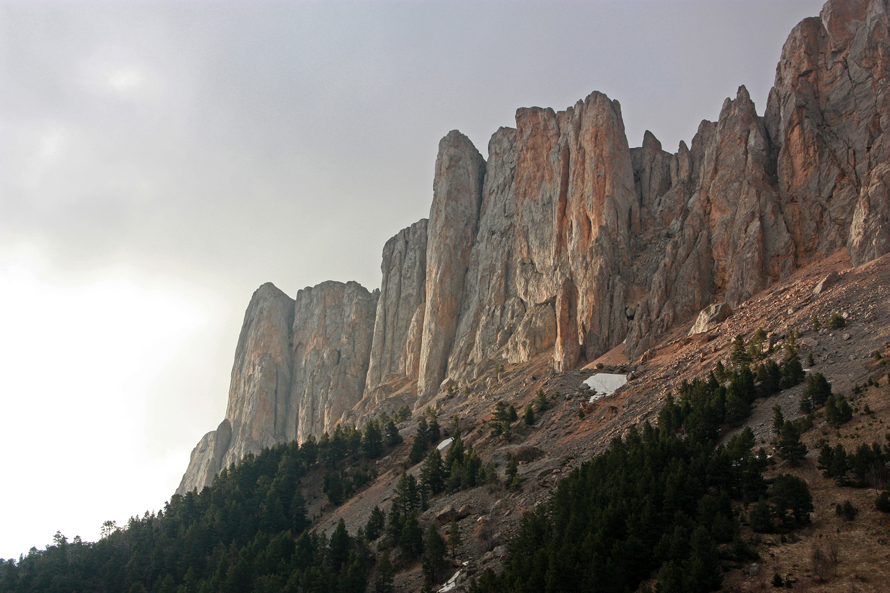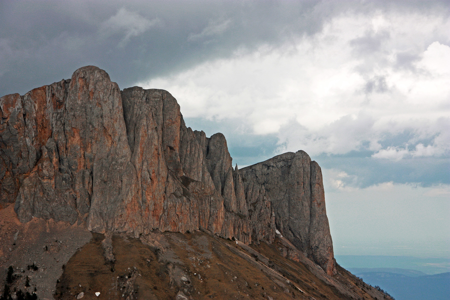 ...справа-южный торец массива. Длина юго-западной стены 6 км. Слева, на окончании стены видна скала Колокольня. Высотой 30 м. от основания.