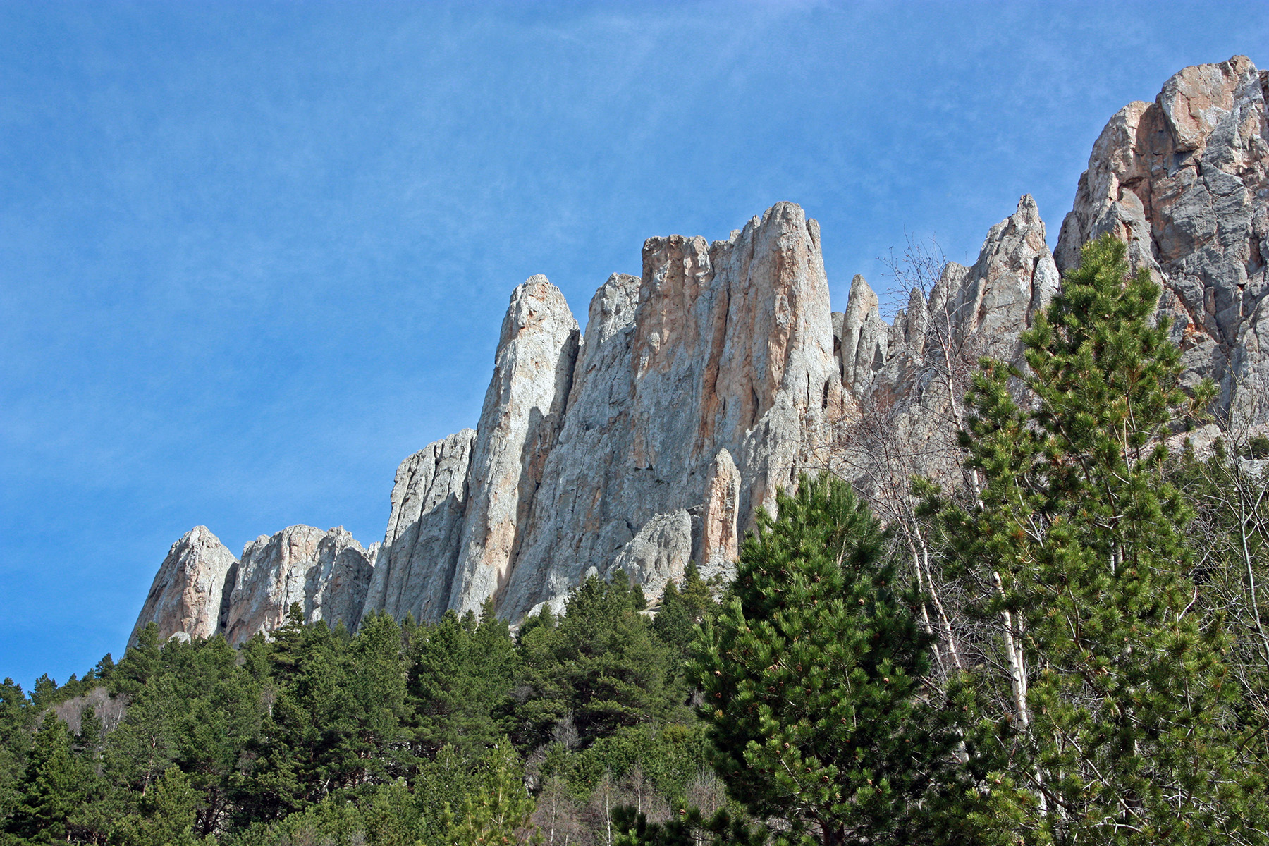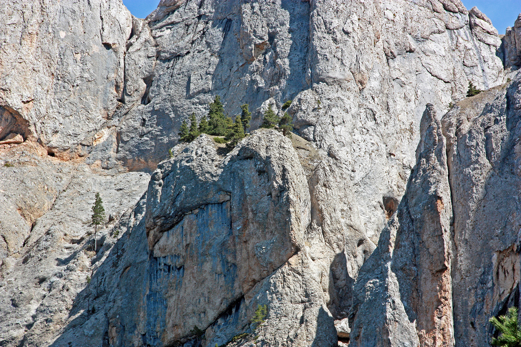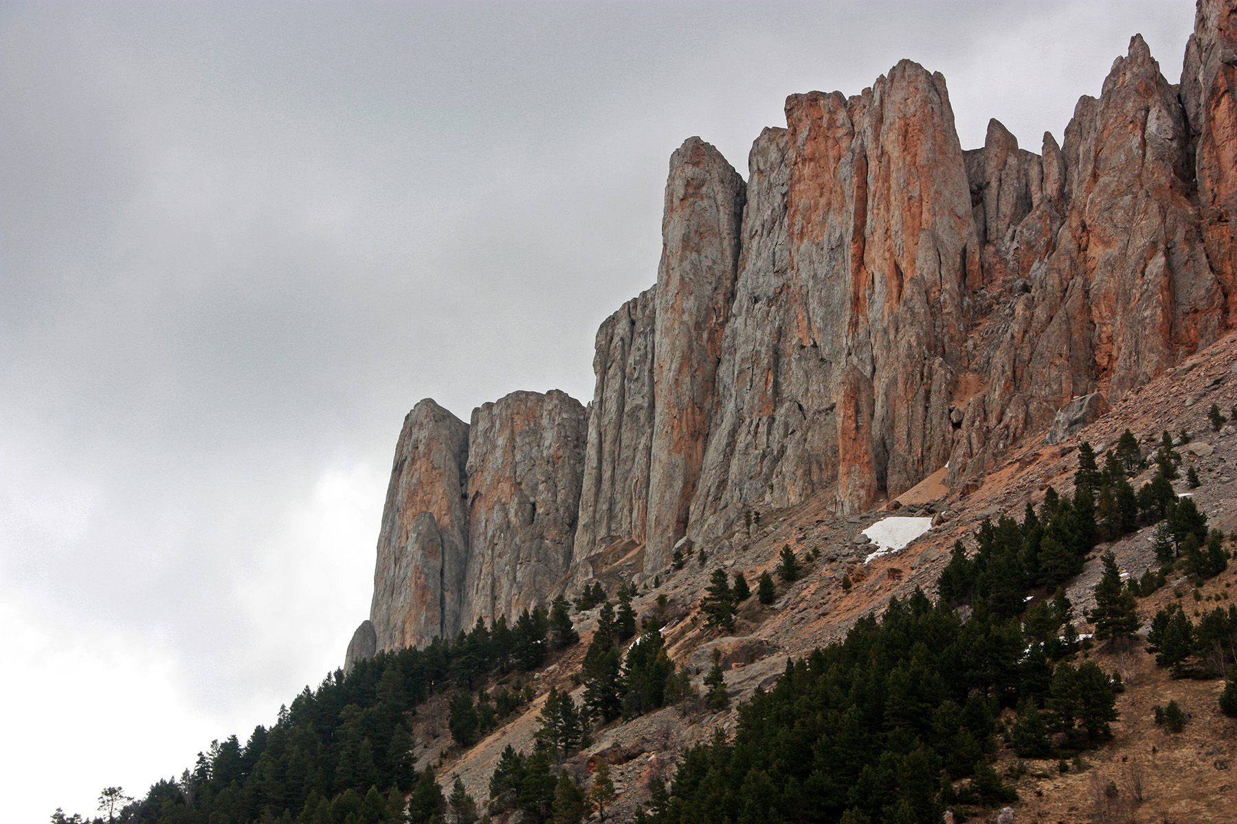 Не задерживаемся, проходим мимо. Тропа вновь петляет по сосновому лесу. А над головой нависают такие скалы… В 11-15 очередной привал. Отдыхали минут 15. Выходим, и опять стены над нами.