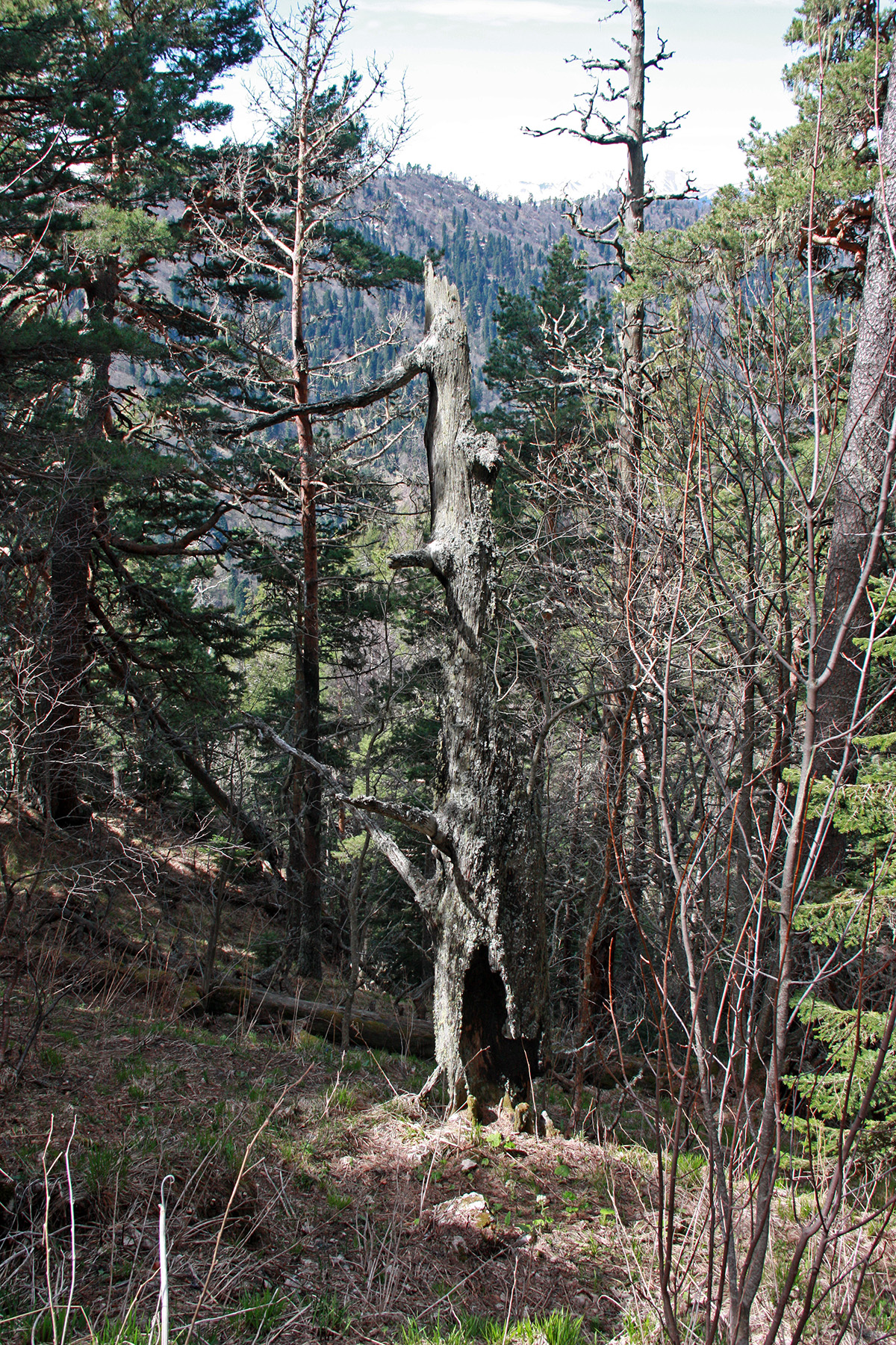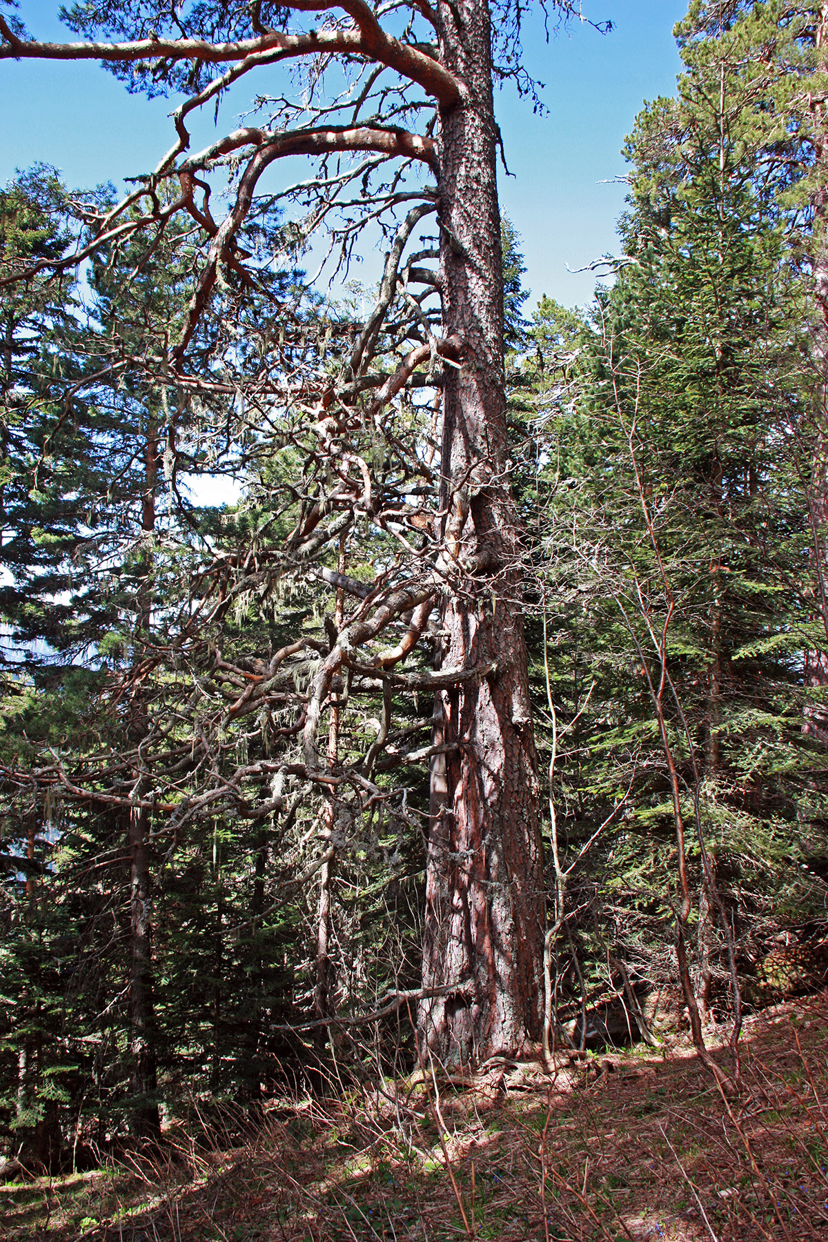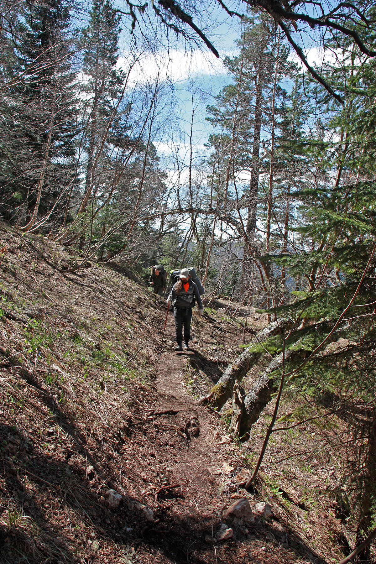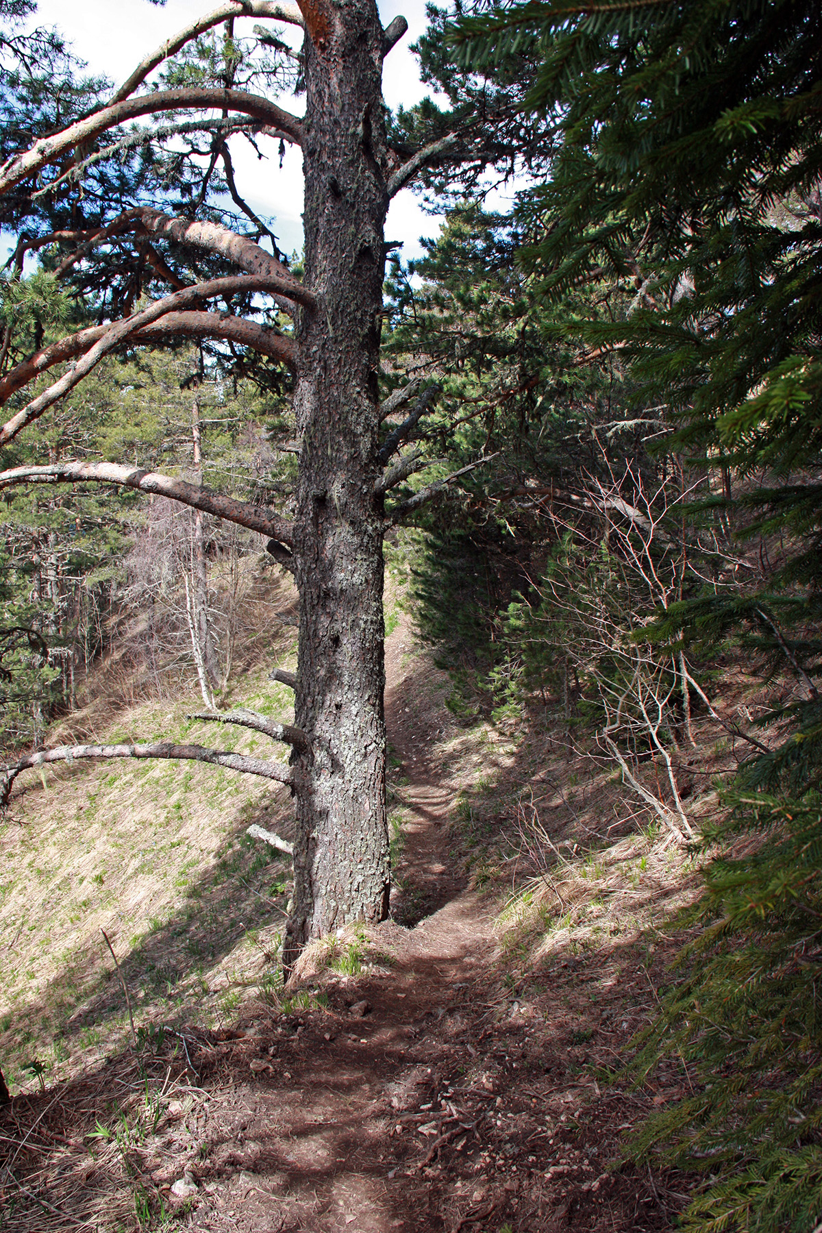 В 10-20 идём дальше. Под ногами устойчивая тропа. Петляет по склону, где с набором высоты, где со спуском. Огибаем выступы склона, проходим распадки. Идём в сосновом лесу. В старом сосновом лесу. Это красиво.