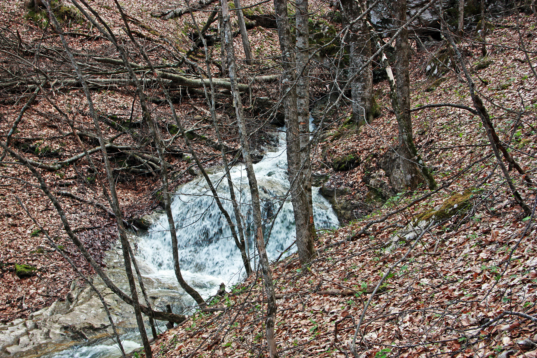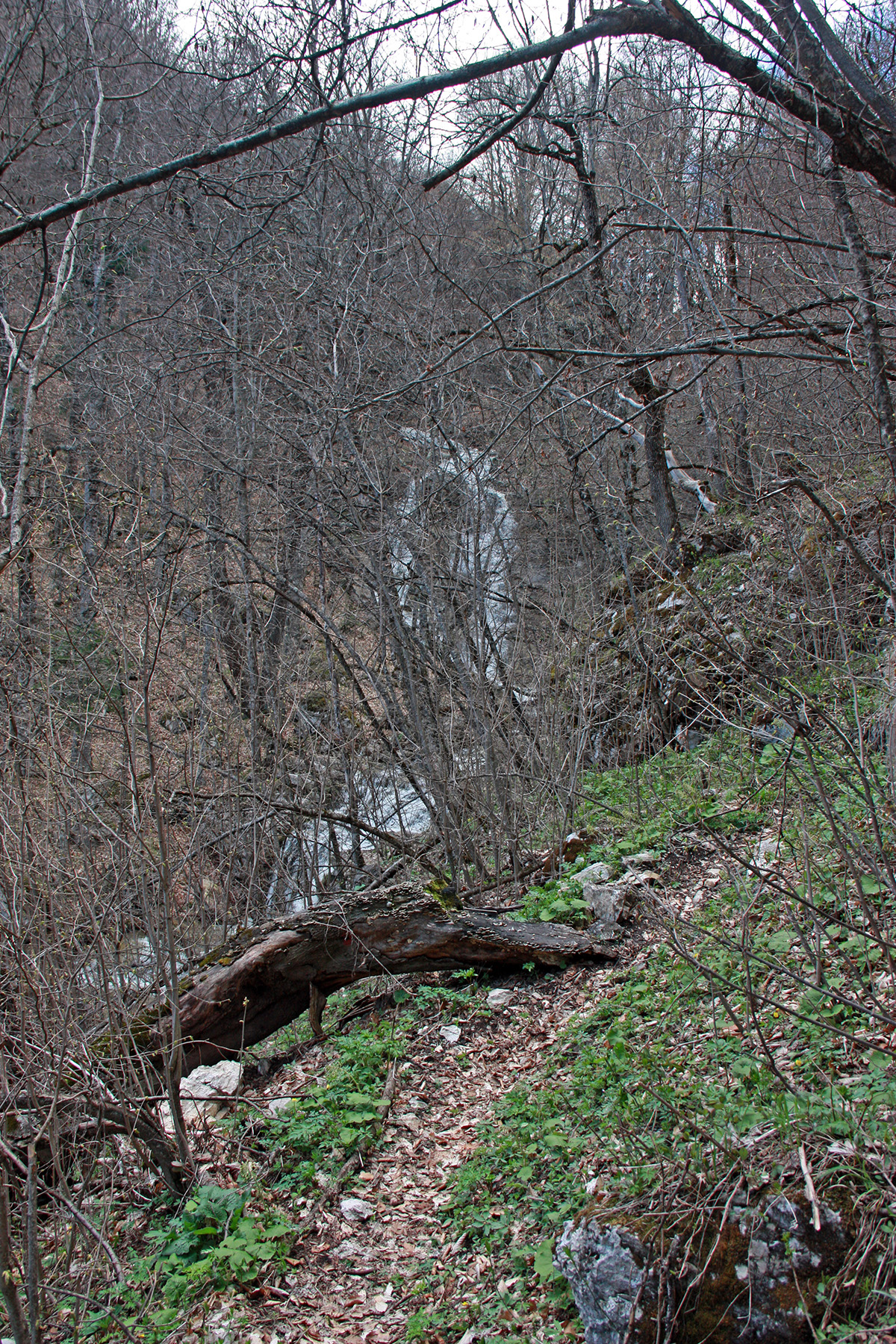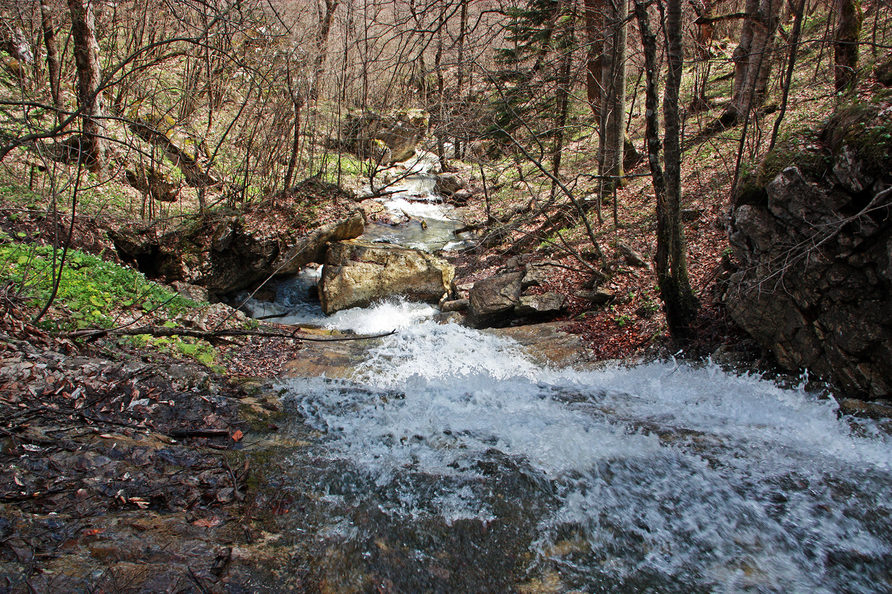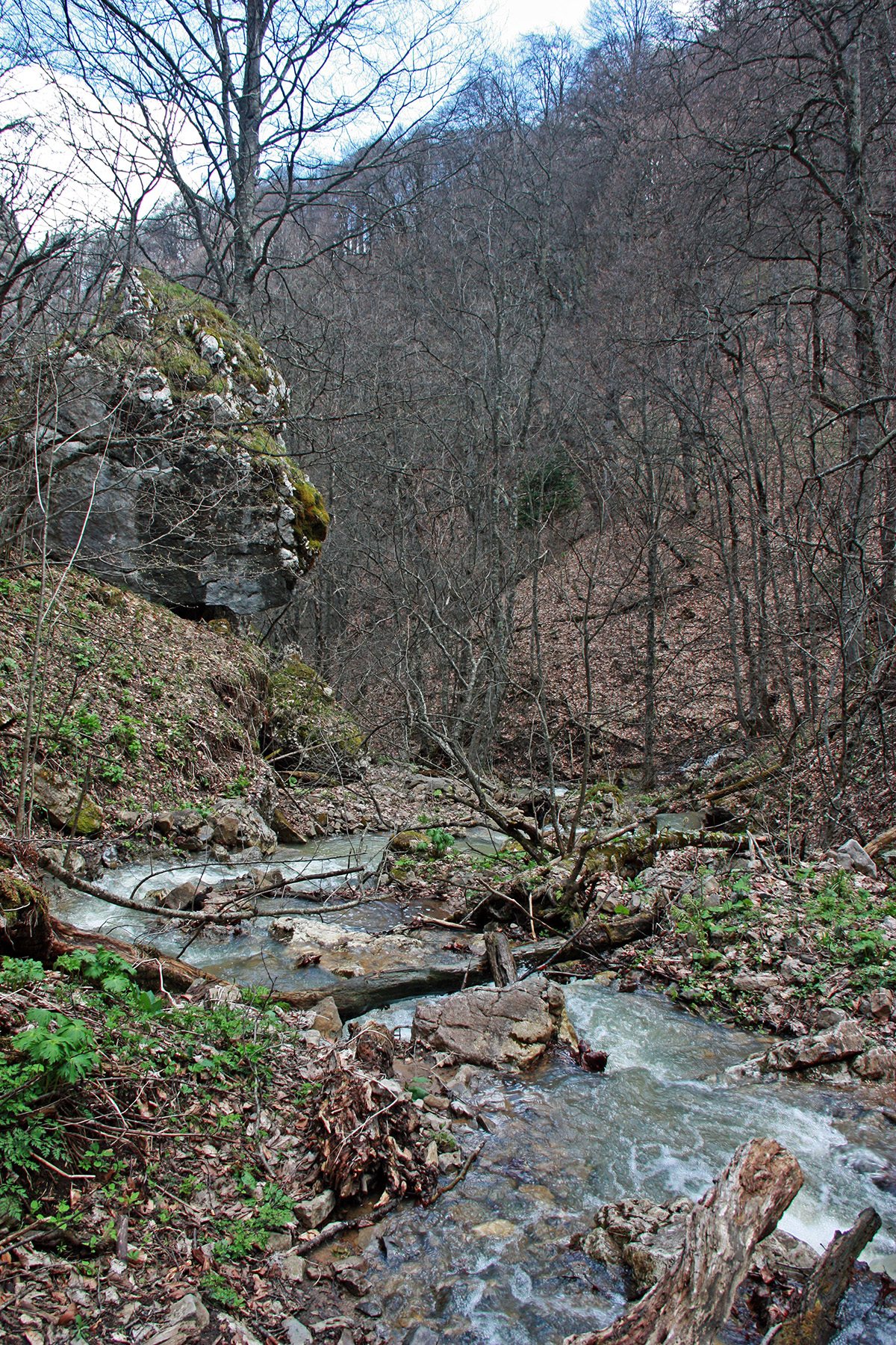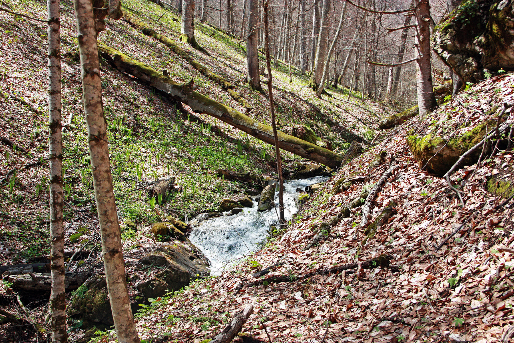 В 11-50 идём дальше. Теперь тропа «жмётся» к ручью. Вдоль ручья набираем высоту. В ручье видим длинные сливы по скальному ложу. Попадаются небольшие ступеньки.