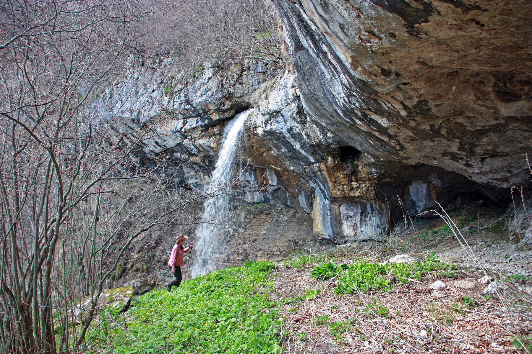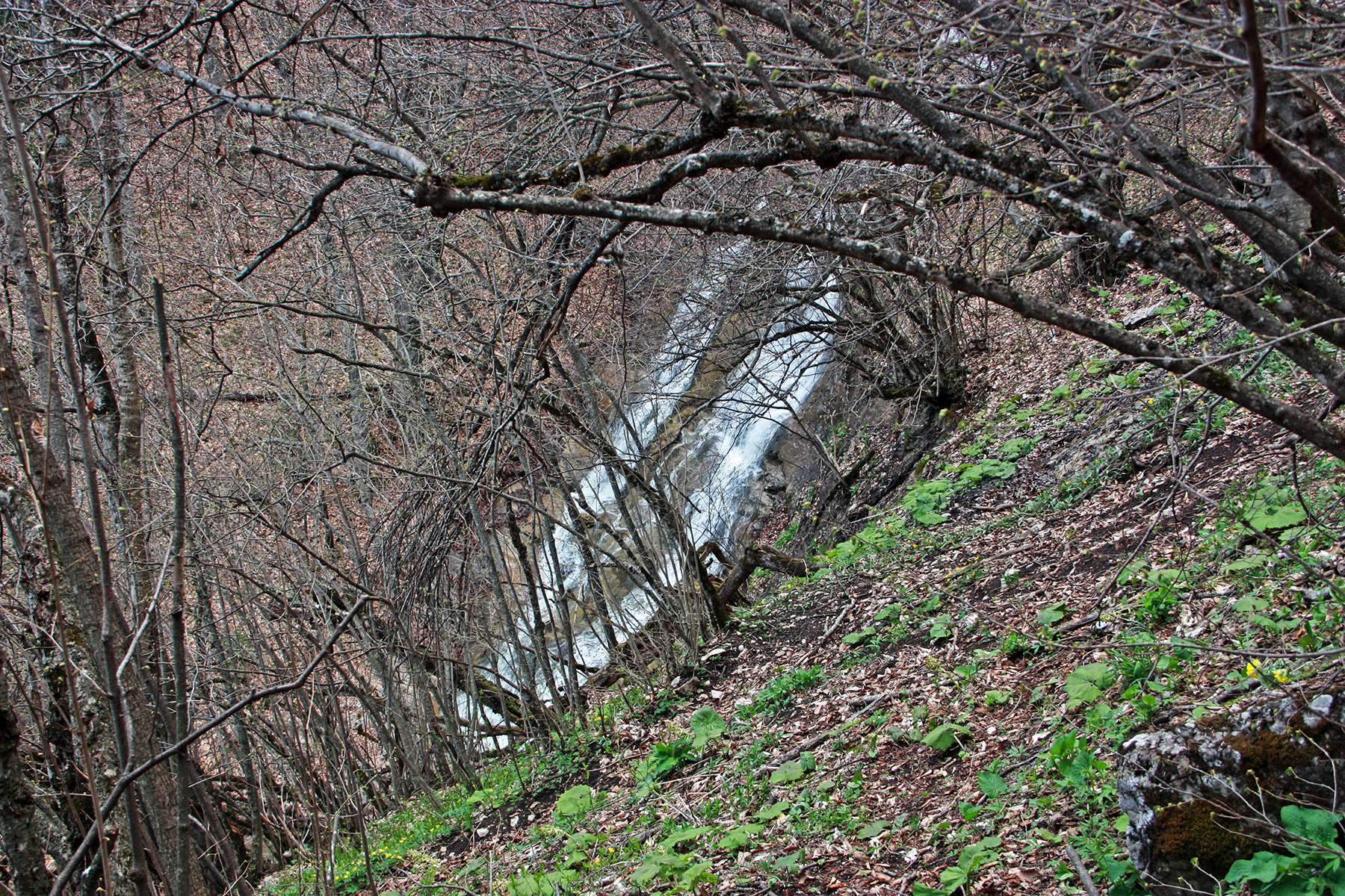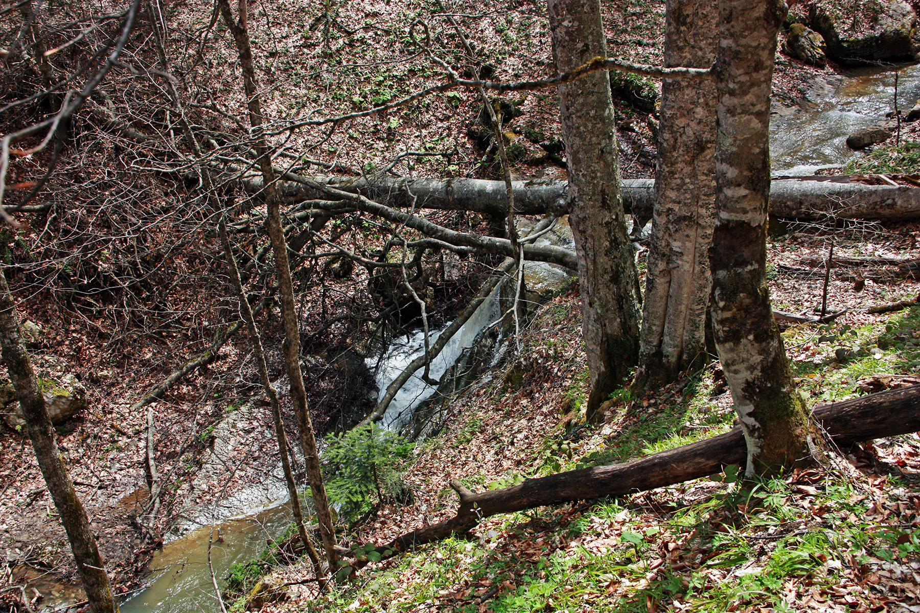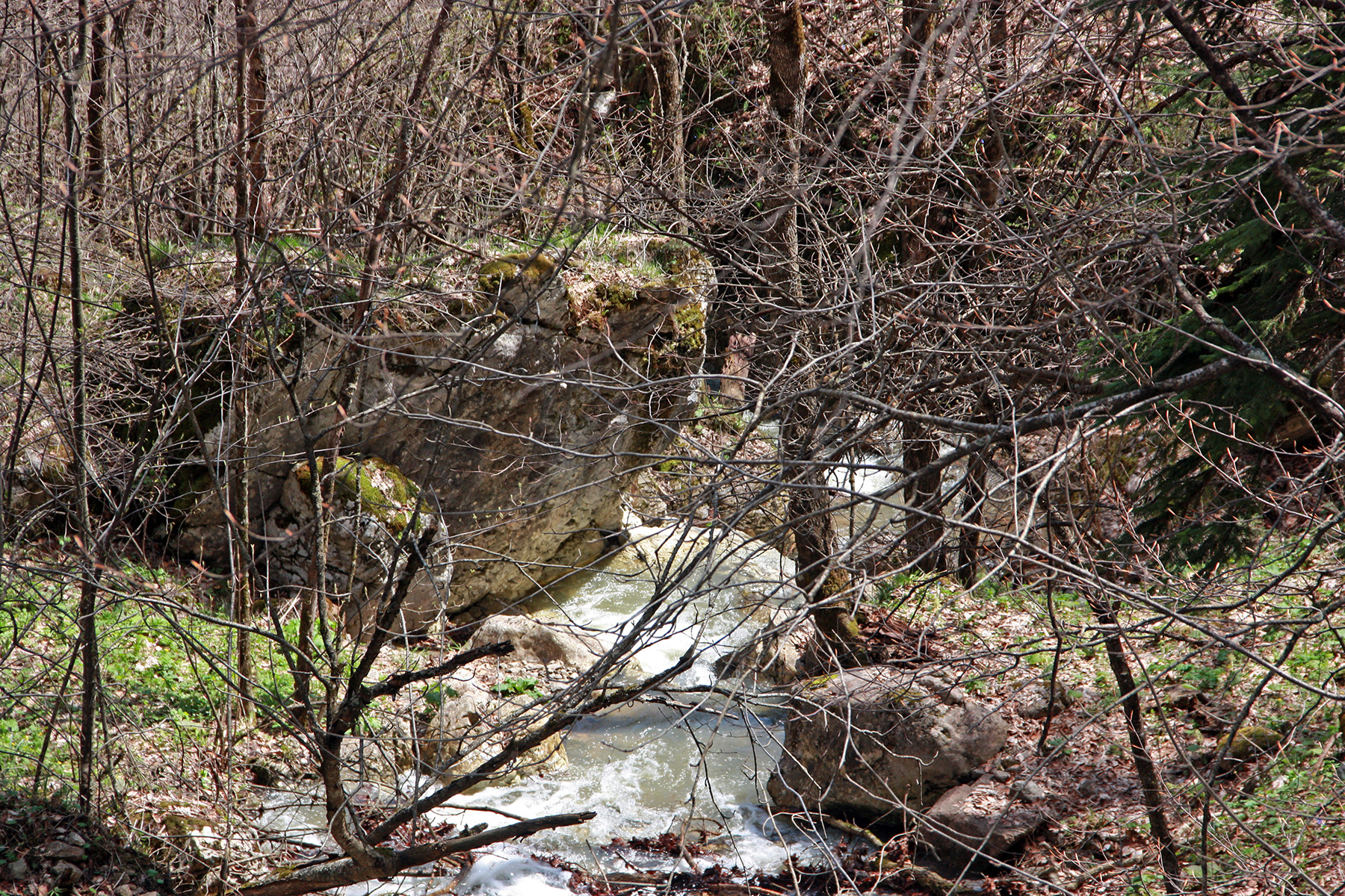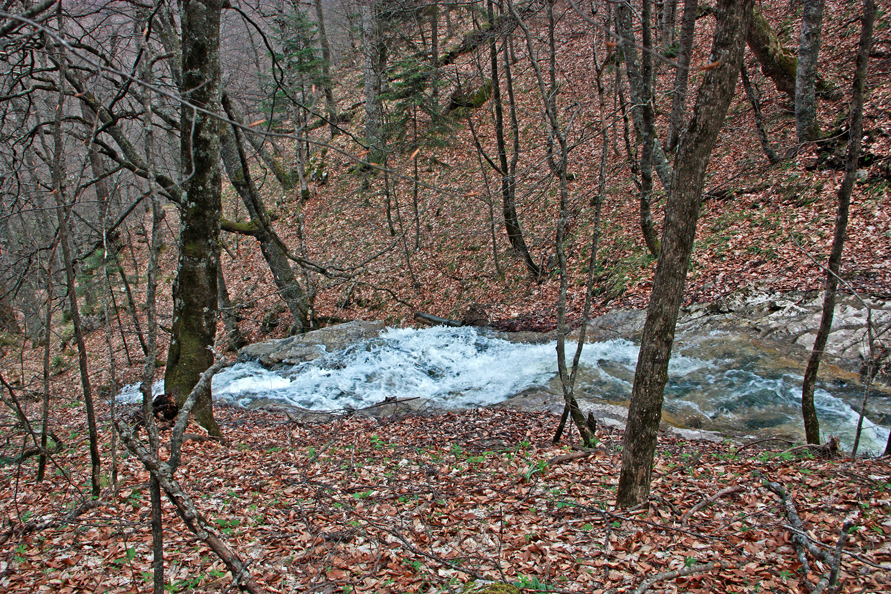 В 11-50 идём дальше. Теперь тропа «жмётся» к ручью. Вдоль ручья набираем высоту. В ручье видим длинные сливы по скальному ложу. Попадаются небольшие ступеньки.