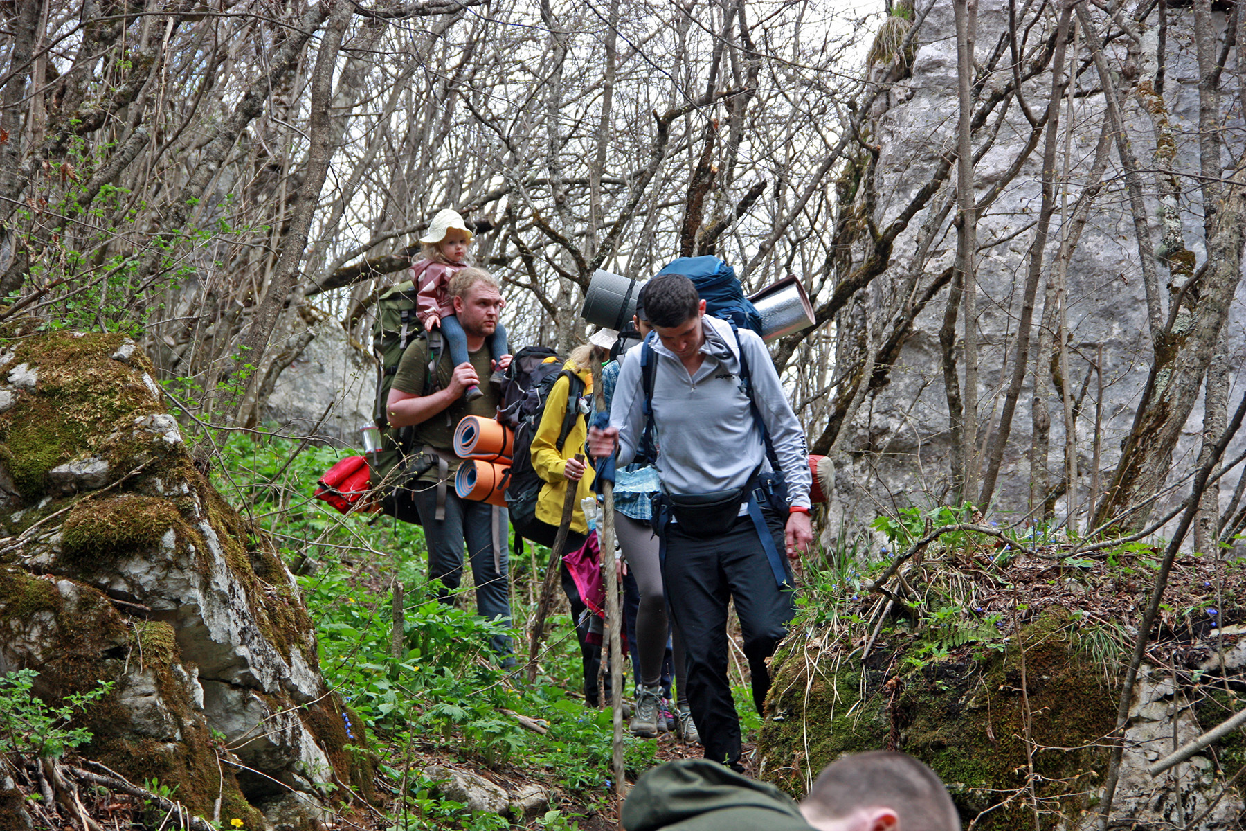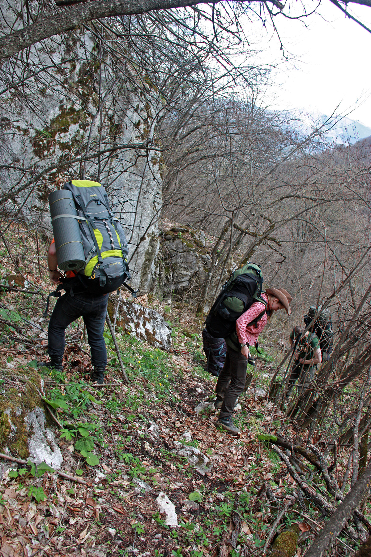 Резкие подъёмы чередуются с небольшими террасами. Переходы в пределах 30 минут, привалы 10-15. В 11-30 вышли к ручью и сели на 3-й привал. Относительно ровное место, можно найти места под палатки.
