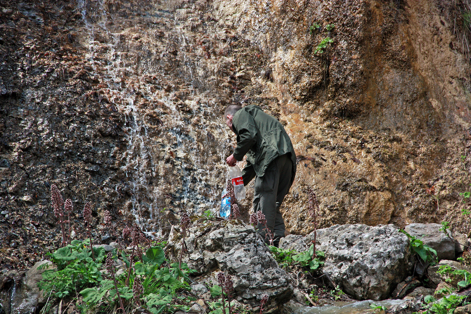 В 15-45, на зелёном склоне, падаем на привал. «Тянули» ходку целых 45 минут! До предполагаемого места стоянки осталось немного. Хотелось стать пораньше, и осмотреть окрестности. Несколько раз здесь «пробегал» с разными группами, и всегда что-то мешало заглянуть в каньон Уруштена сверху. Туман, темнота, дождь, недостаток времени. Сегодня буду решительно бороться с этим.