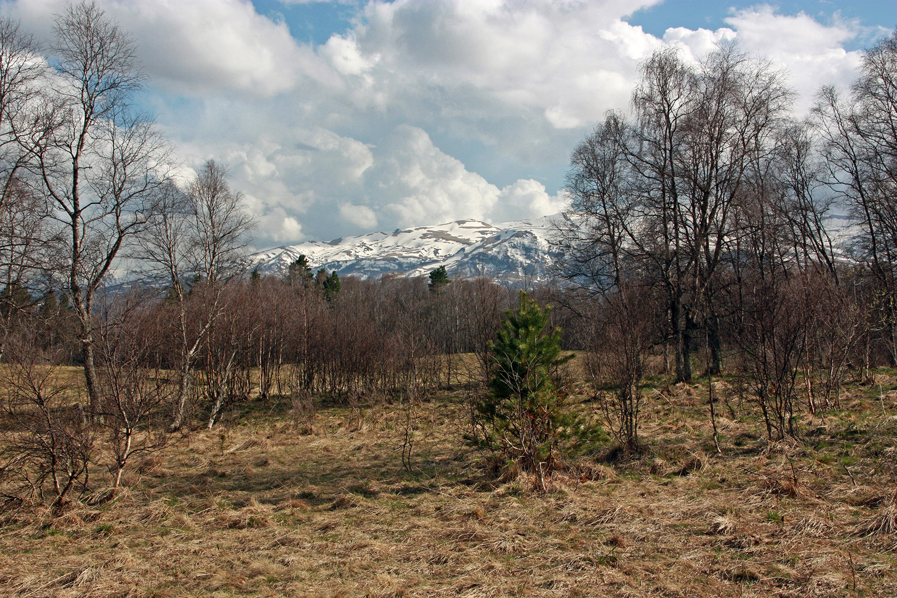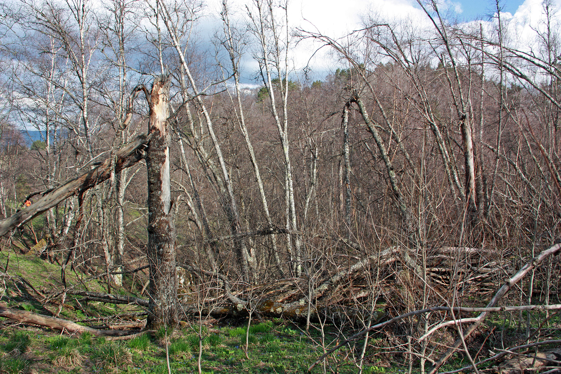 В 16-00 идём дальше. Следующие 10 минут обходим низинку с лесом. А лес в ней ломаный. Судя по всему, здесь какой-то осенью был «ледяной дождь». Он и ломает деревья пополам. Следующие 15-20 минут проходим серию полян и перелесков. Впереди узнаю вершину Шапка.