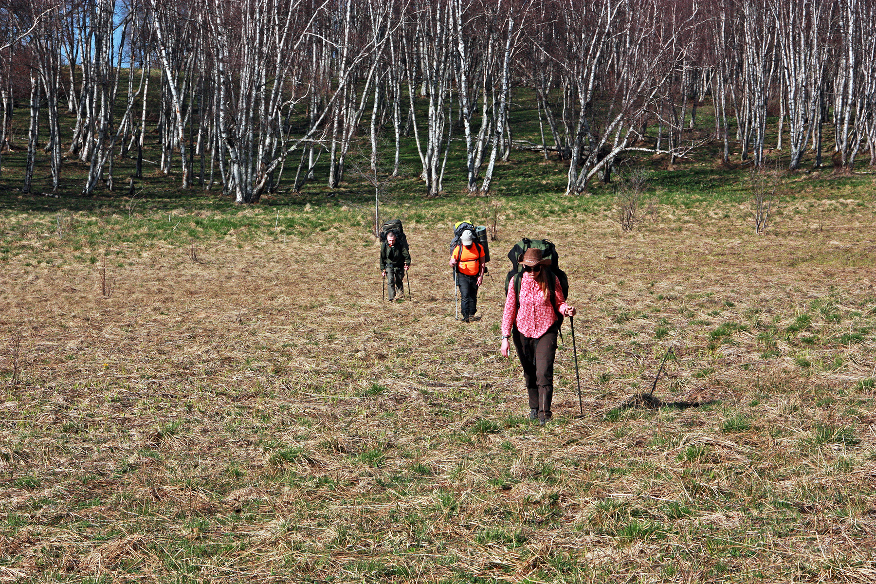 Теперь идём на юг. Ориентируемся на вершину Трю. Вроде и недалеко, но все устали. Идём медленно. Ориентируемся на небольшой лесочек, на краю плато. Ещё задачка, была бы там вода. Помнится, в первое моё посещение этого места, за водой ребята ходили куда-то вниз. Был сильный туман, и я не видел, куда. А сам «не сподобился» сходить до воды. А если воды не будет, придётся идти под Шапку. Там родник, но и 2 хороших перехода.