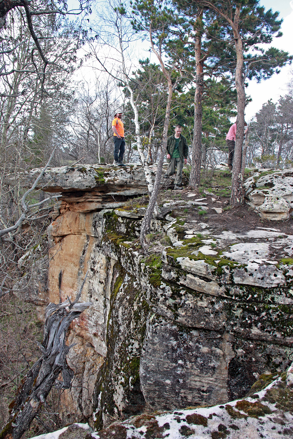 Осматривались долго, очень долго. Около часа. С километр, по краю плато. Сначала туда, после-обратно. Посмотрели стены, «балкон», всякие скальные образования под нами. Сам каньон Уруштена, и не каньон, в классическом понимании. Широкая долина реки, с крутыми берегами. В верхней части склонов имеются протяжённые скальные пояса.