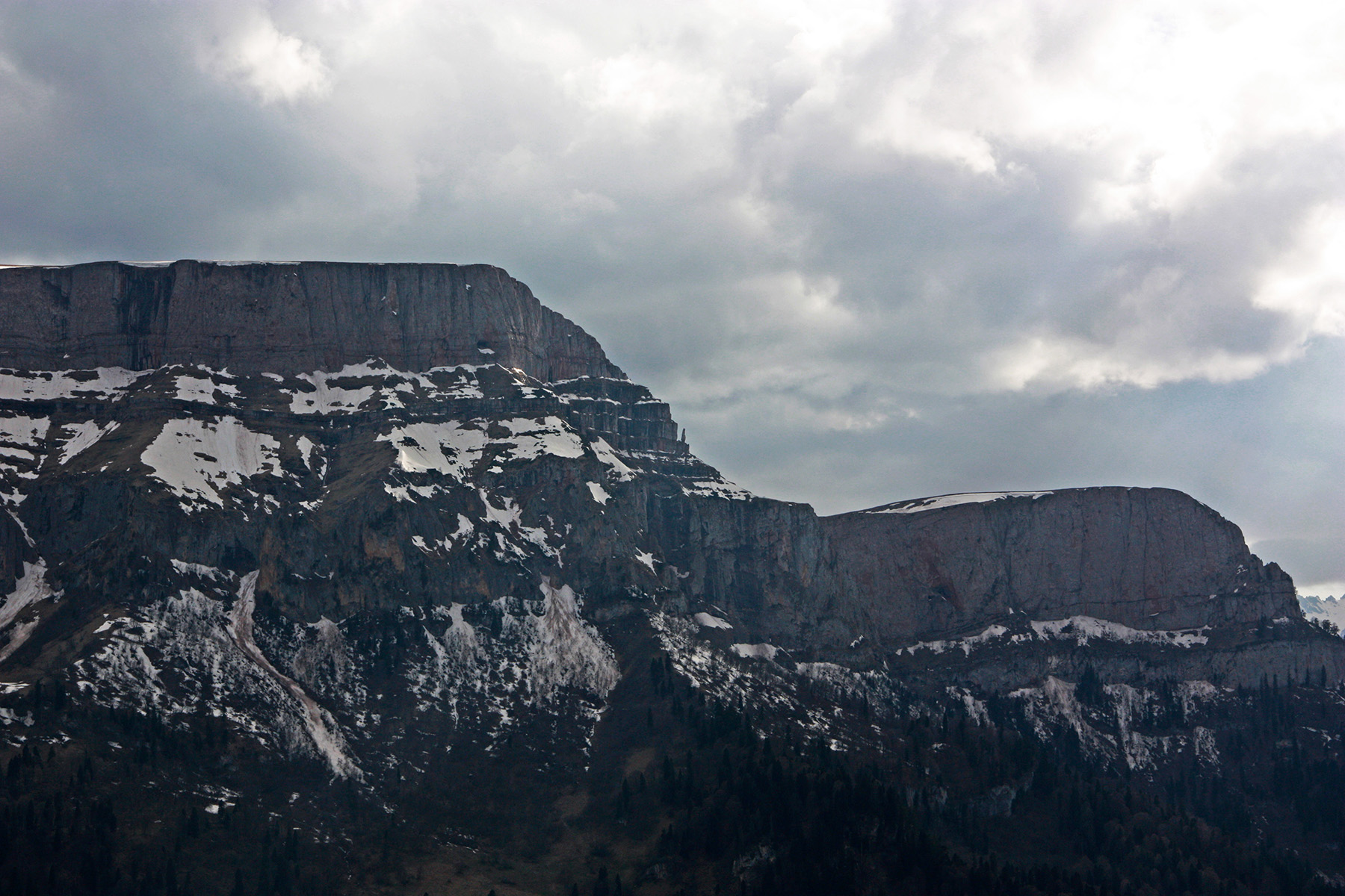 Мы находимся на краю плато Малый Бамбак. Высота где-то 1670. Напротив массив г. Трю (2388). Столовая гора, с поясами скал. Отсюда она смотрится как слоёный пирог. Справа пика скального останца. «Скала Часовая», как написано на карте. Без оптики плохо различима, но при увеличении-впечатляет. В общем, всё это хребет «Скирда».