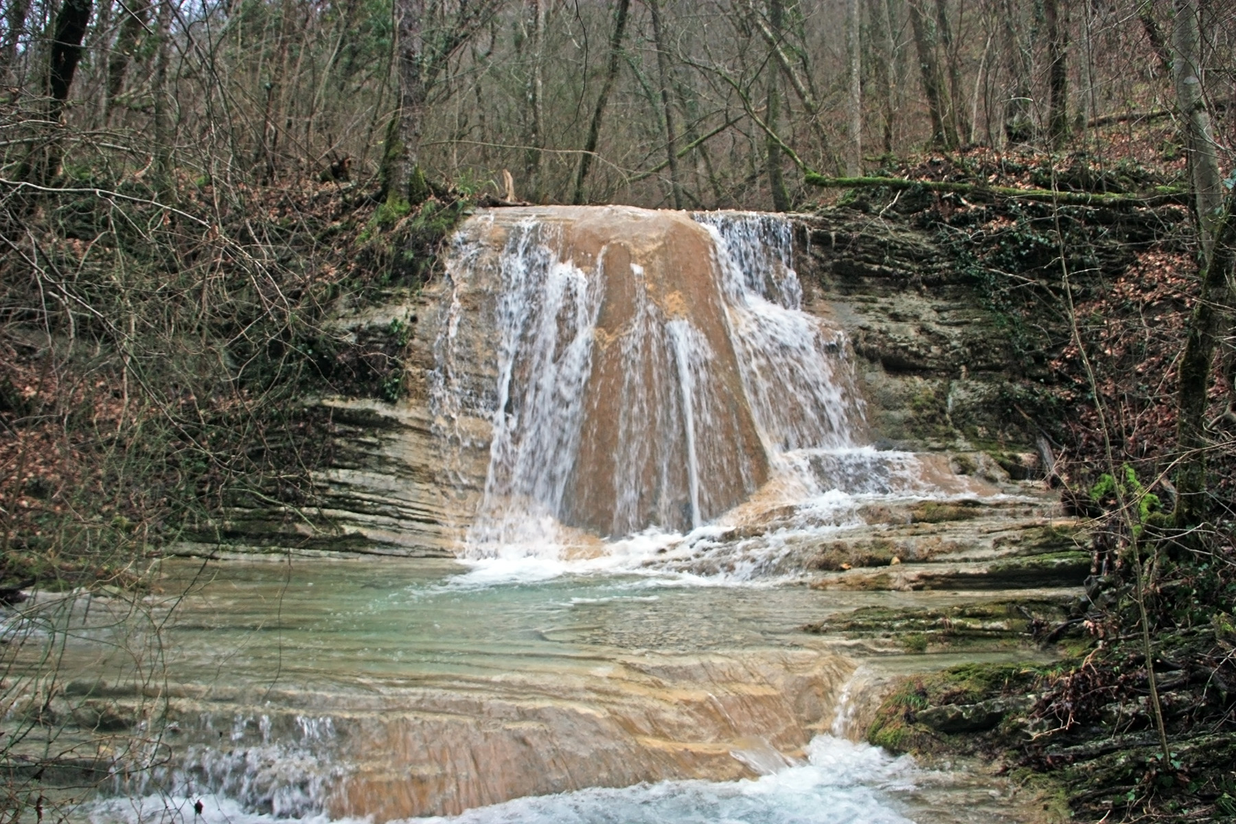 Следующая ступень высотой 2-3 метра. Поднимаемся по правому краю водопада. Следующая ступень сама состоит из 3-х покатых ступеней. Высота 2 метра.
