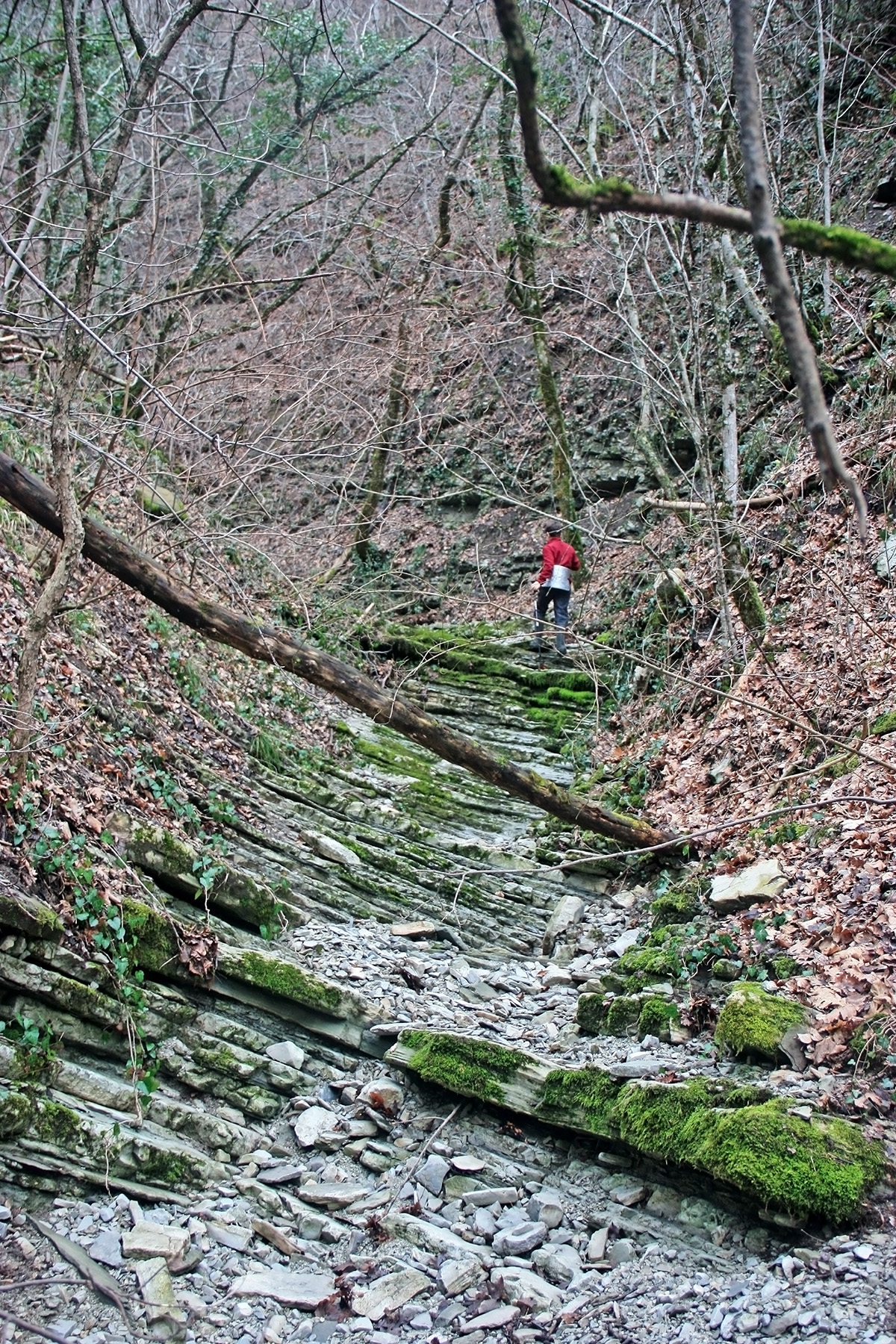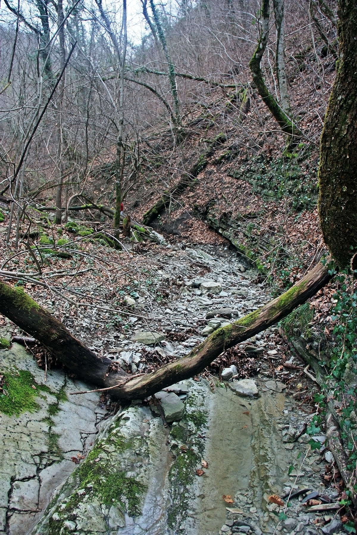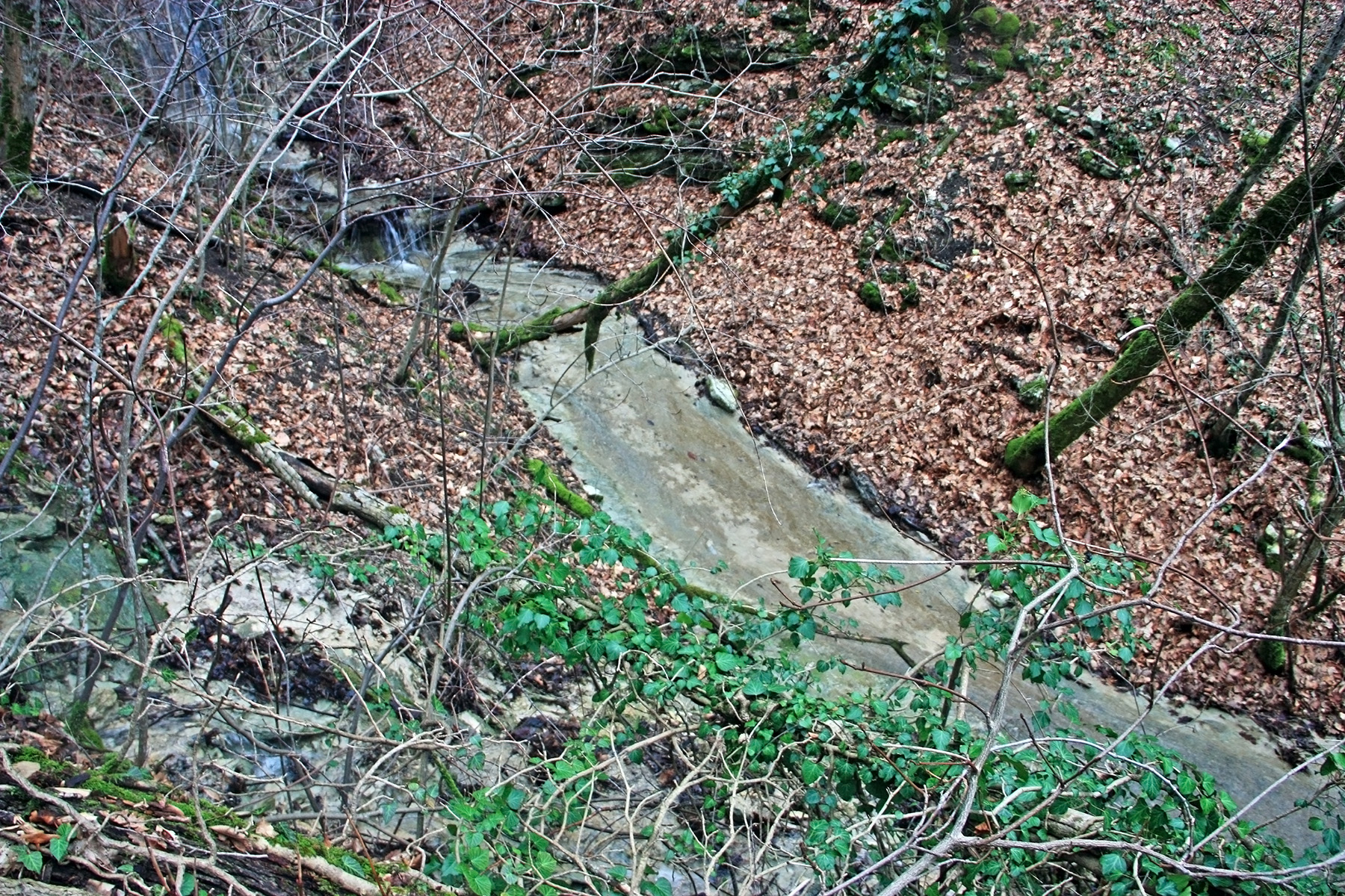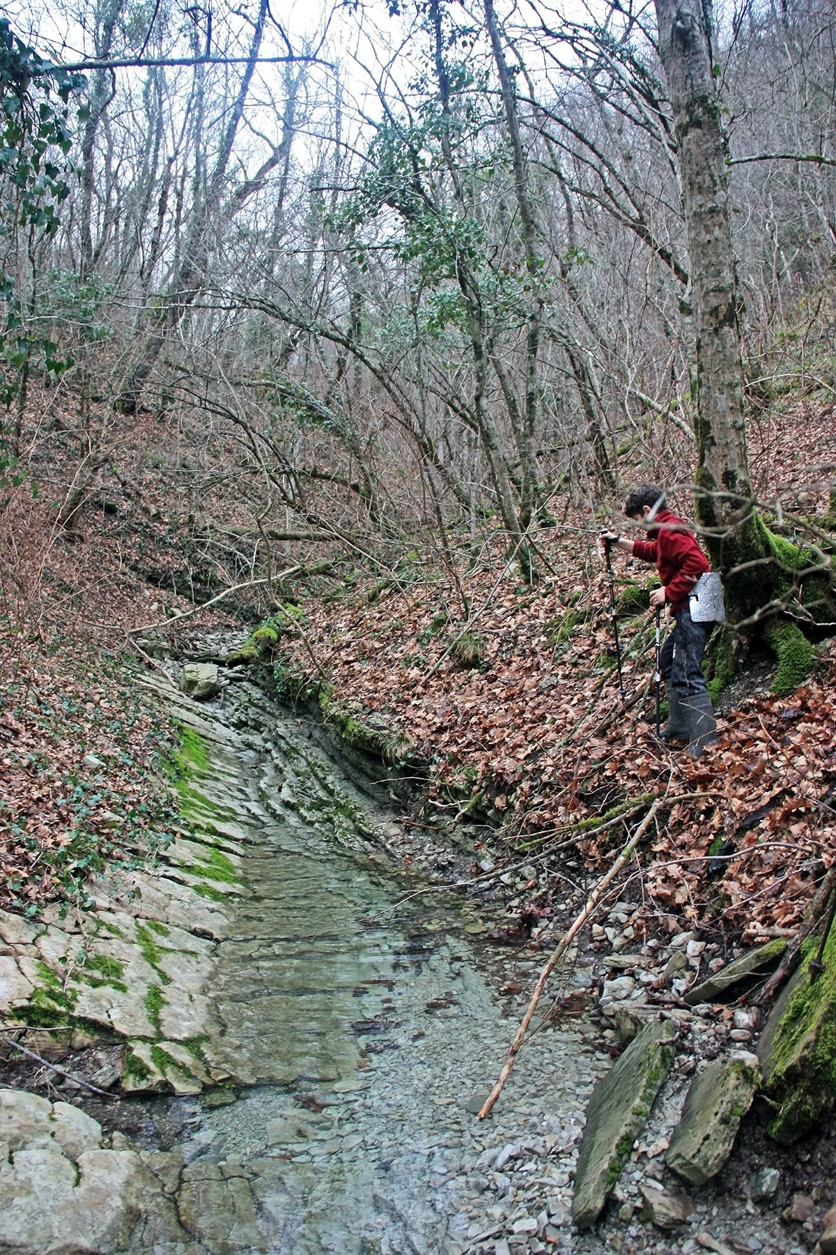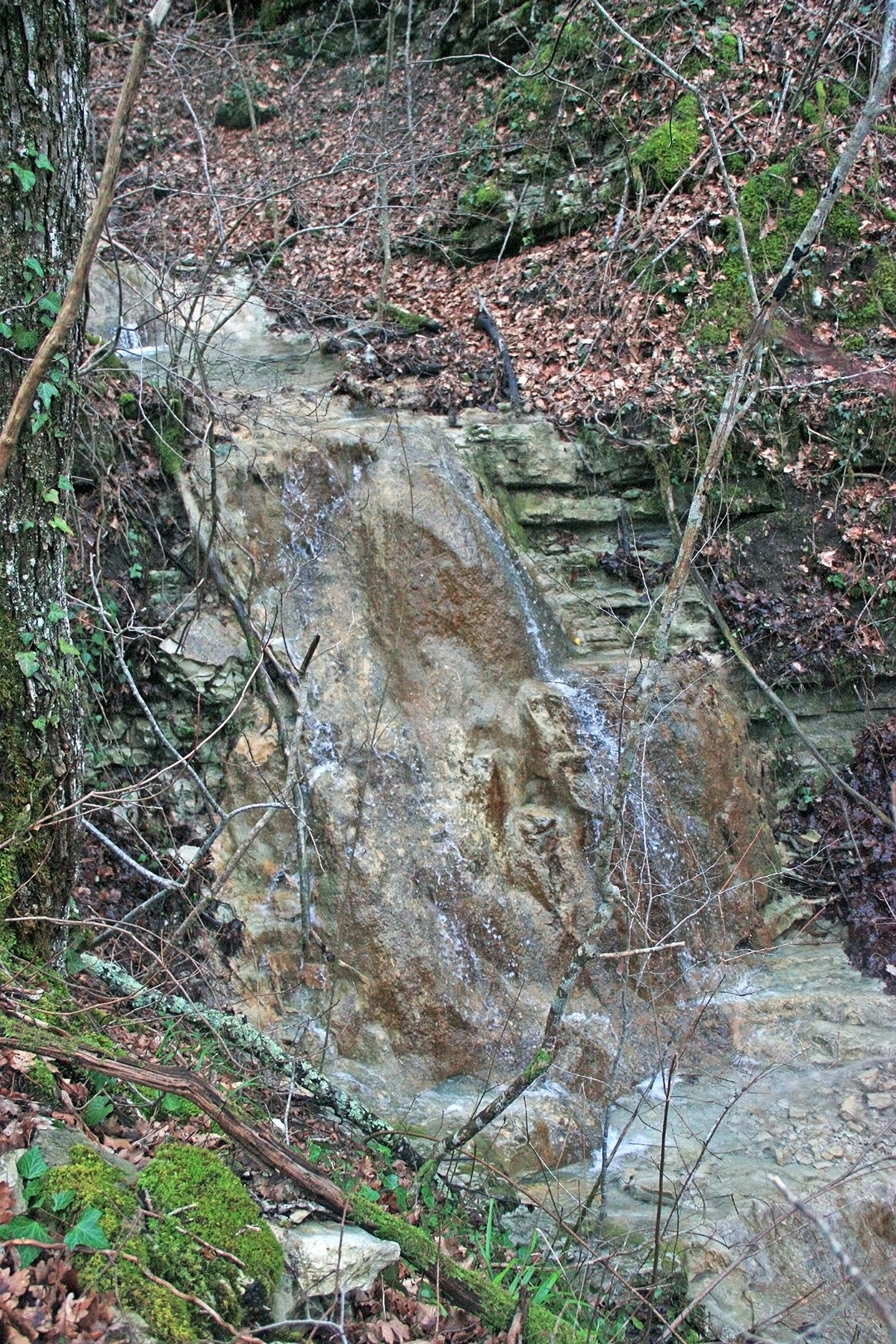 В 12-28 прошли место впадения правого притока. Такого же сухого, как и основное русло. Через пару минут выходим на участок, где слева (правый борт ущелья) сплошная скальная плита, с наклоном 30-35 градусов. Присыпана осенними листьями и поросла мхом. На удивление, на плите растут деревья. Русло под ногами становится «ребристым». Приходиться идти по рёбрам скальных плит, которые сточила вода.