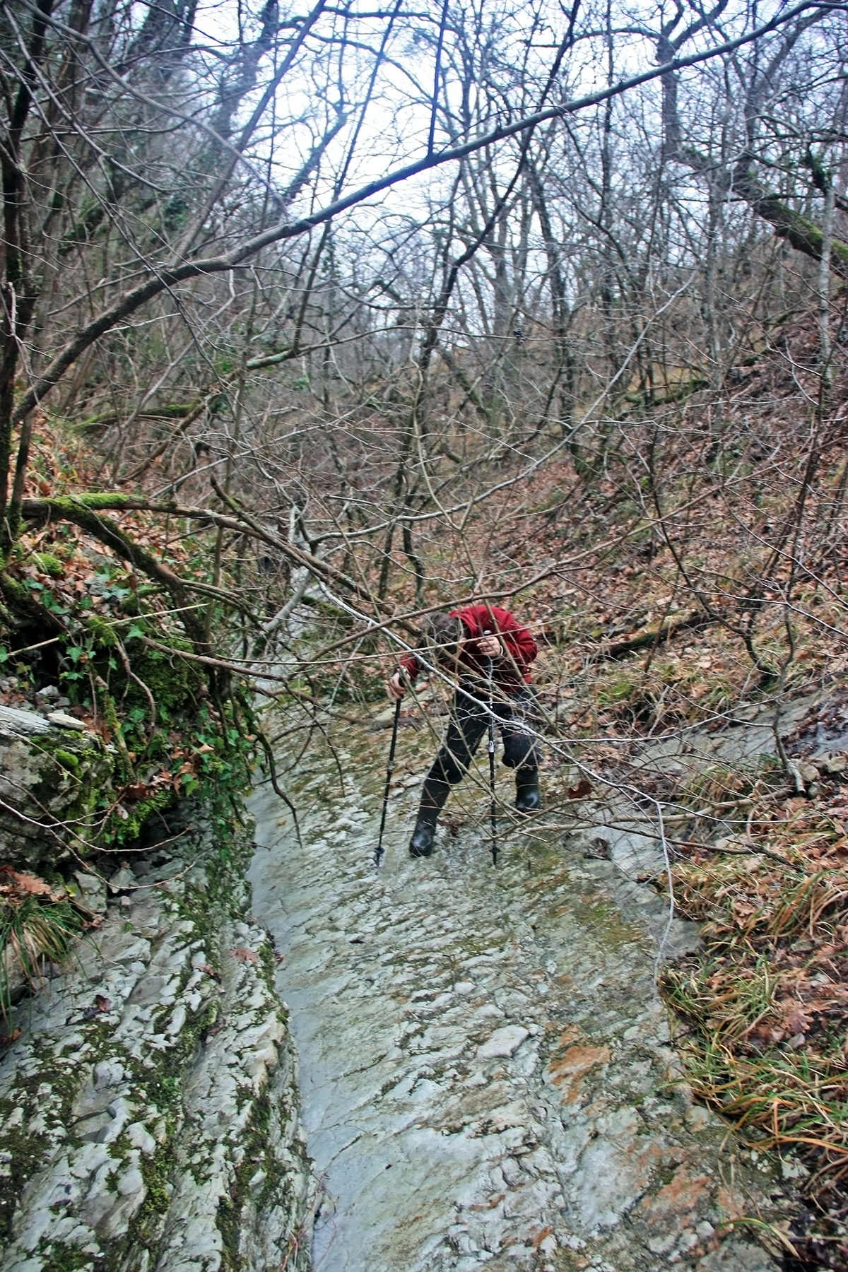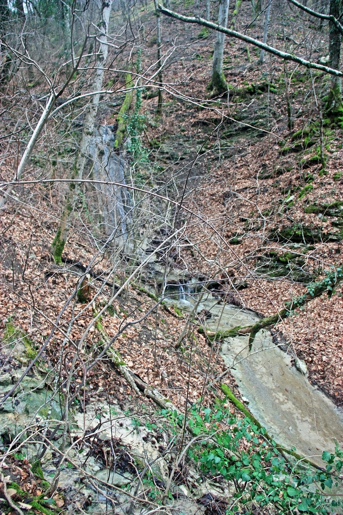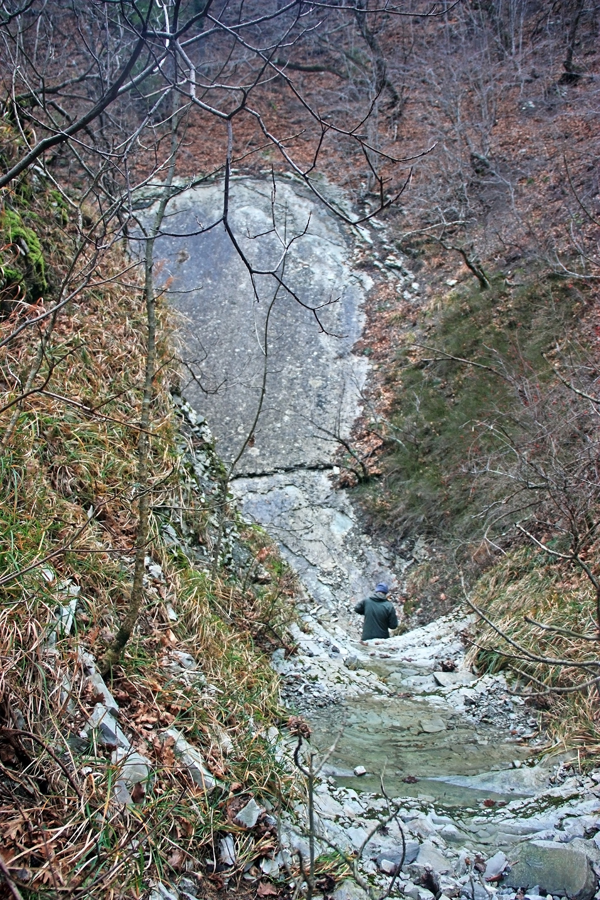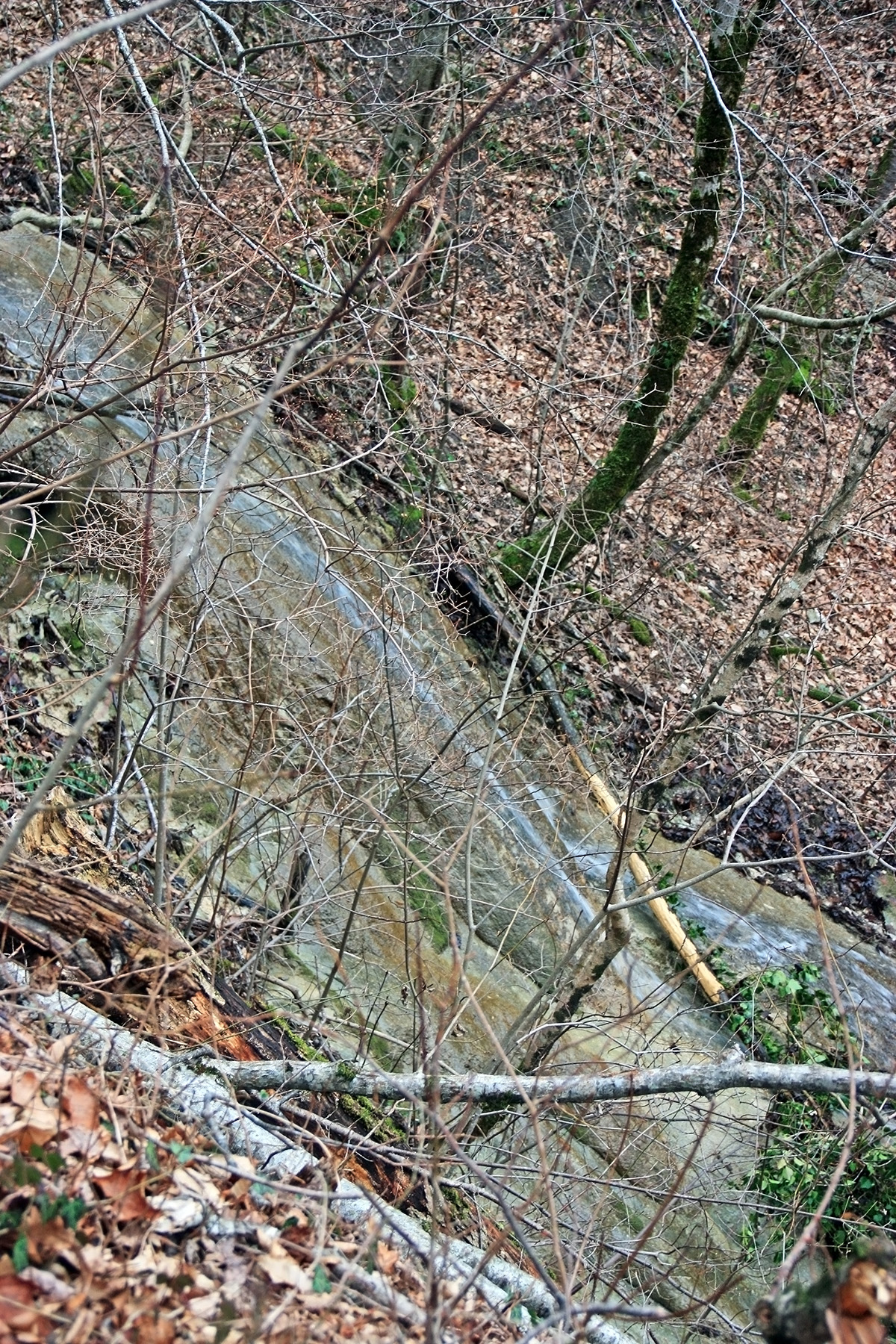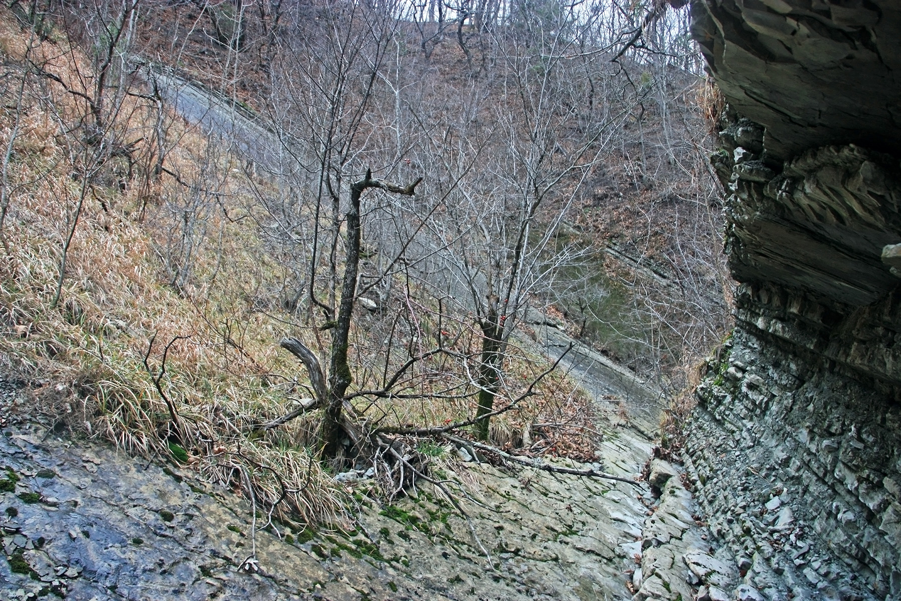 В 12-28 прошли место впадения правого притока. Такого же сухого, как и основное русло. Через пару минут выходим на участок, где слева (правый борт ущелья) сплошная скальная плита, с наклоном 30-35 градусов. Присыпана осенними листьями и поросла мхом. На удивление, на плите растут деревья. Русло под ногами становится «ребристым». Приходиться идти по рёбрам скальных плит, которые сточила вода.