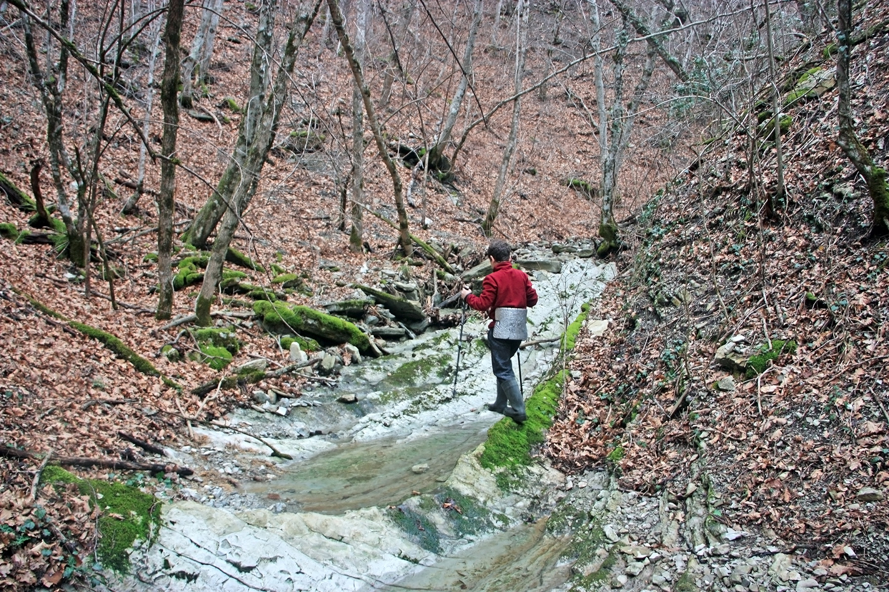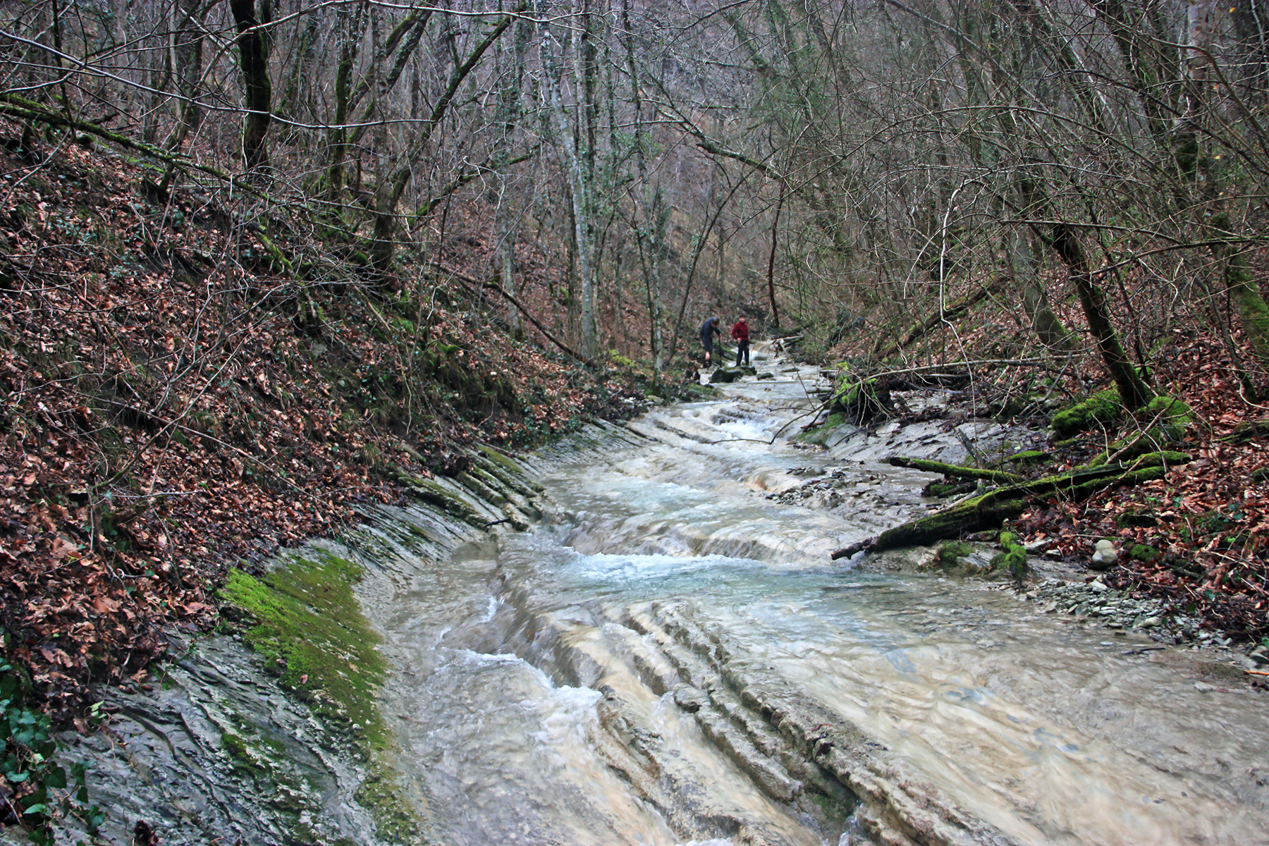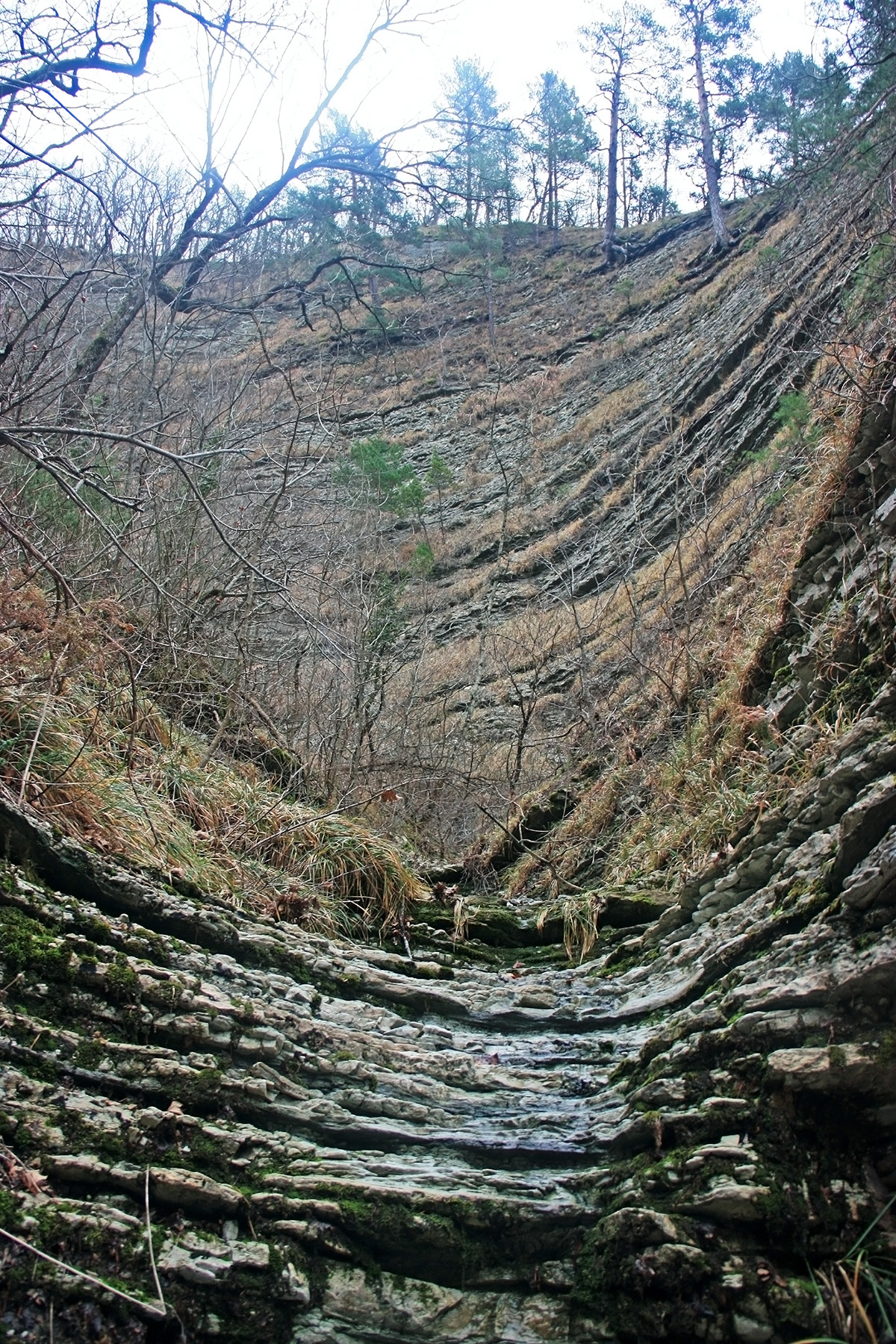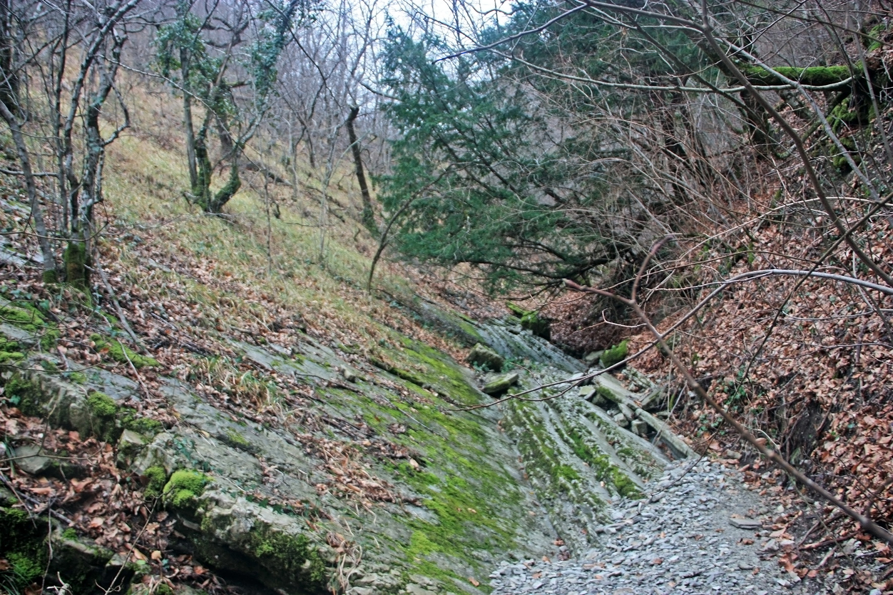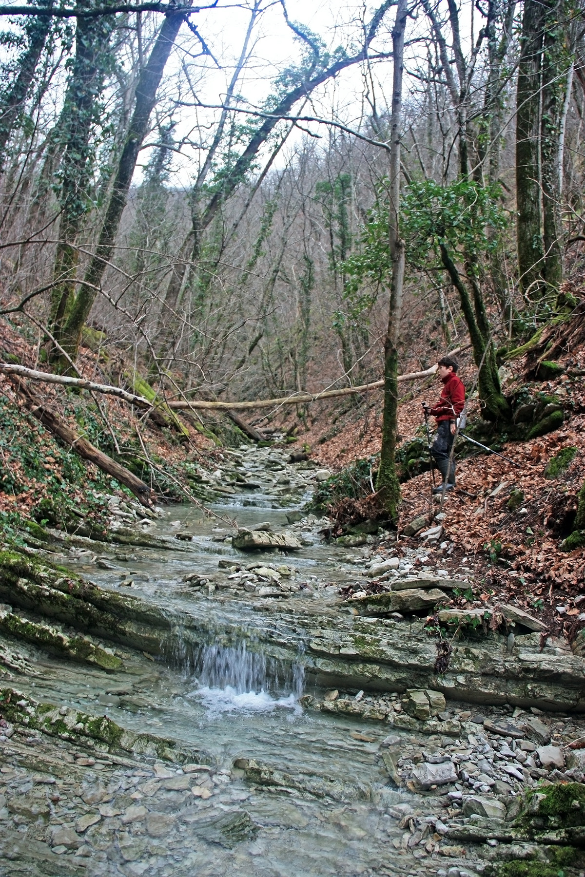 В 12-28 прошли место впадения правого притока. Такого же сухого, как и основное русло. Через пару минут выходим на участок, где слева (правый борт ущелья) сплошная скальная плита, с наклоном 30-35 градусов. Присыпана осенними листьями и поросла мхом. На удивление, на плите растут деревья. Русло под ногами становится «ребристым». Приходиться идти по рёбрам скальных плит, которые сточила вода.