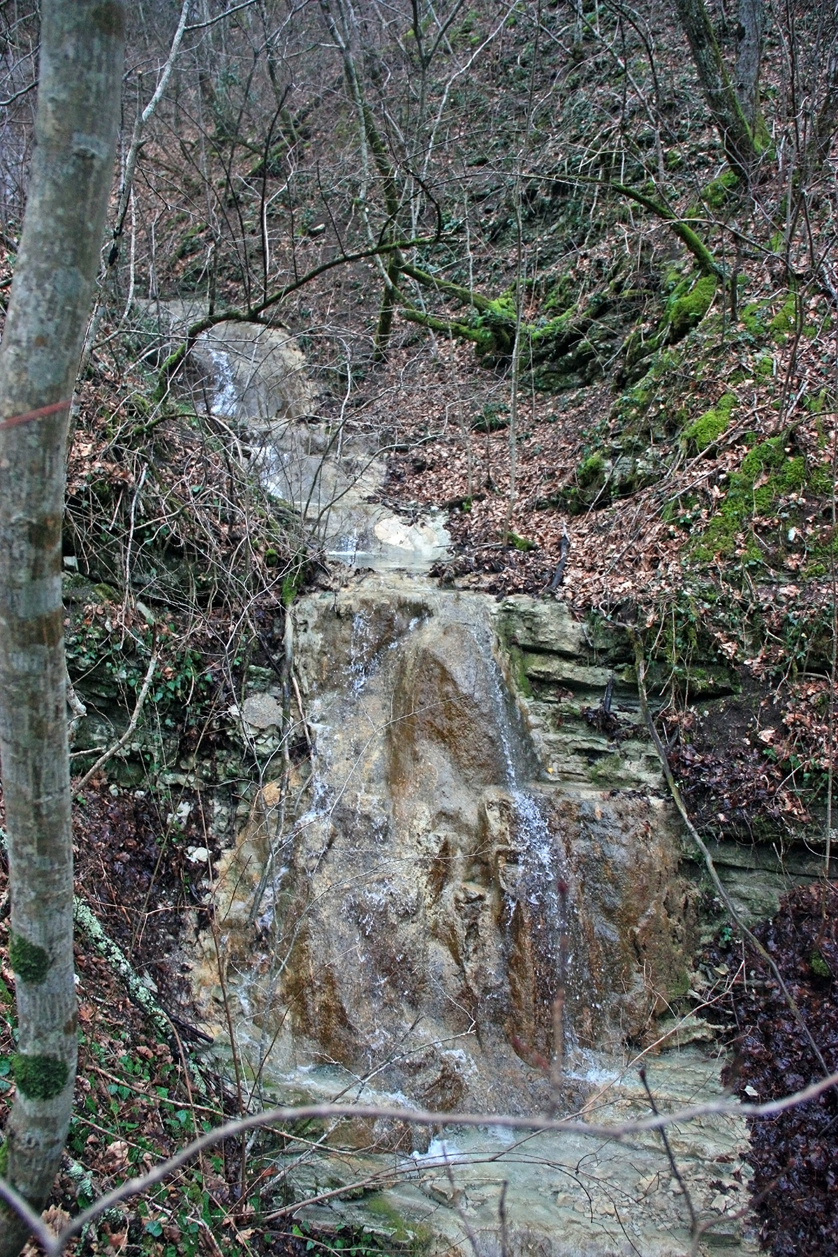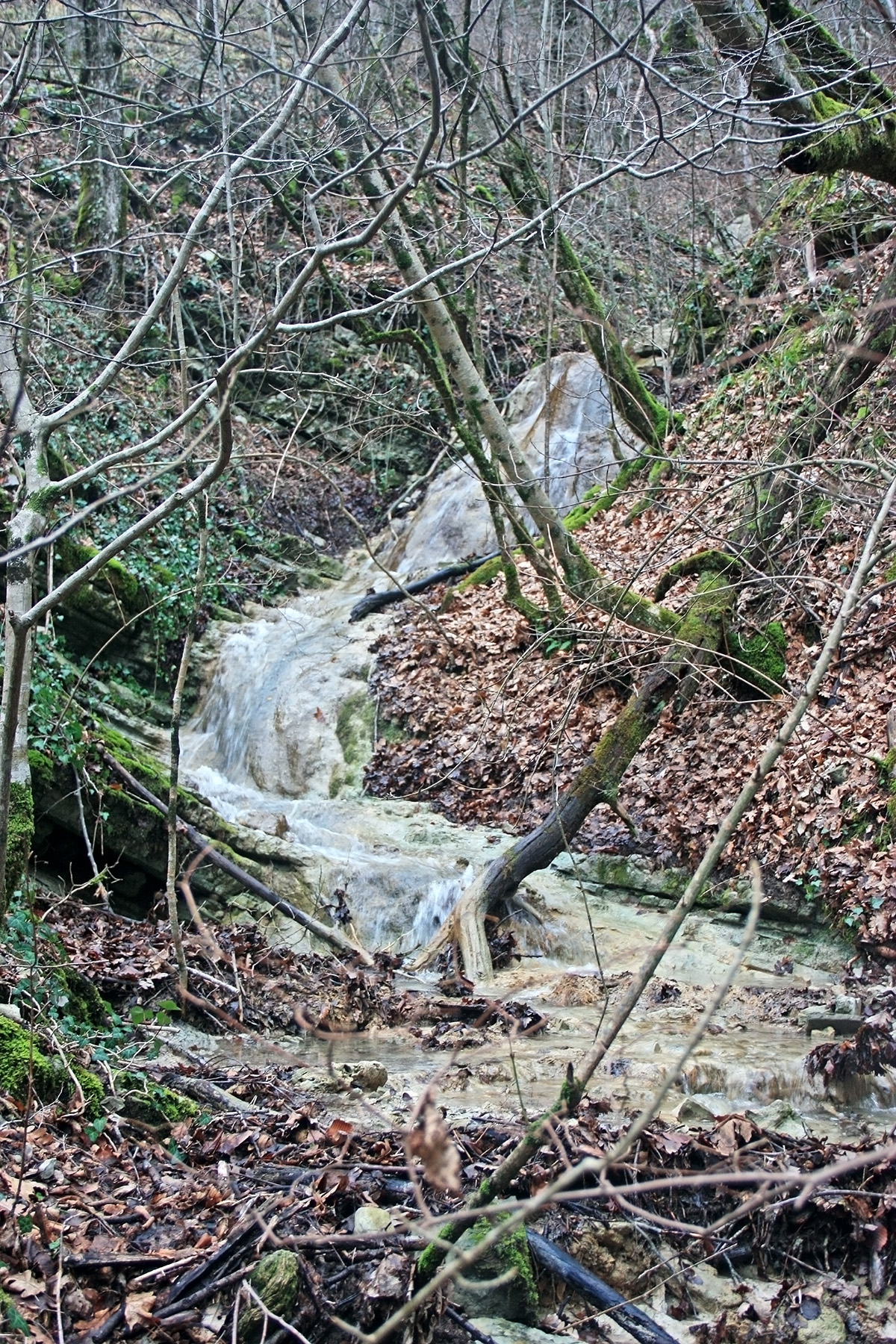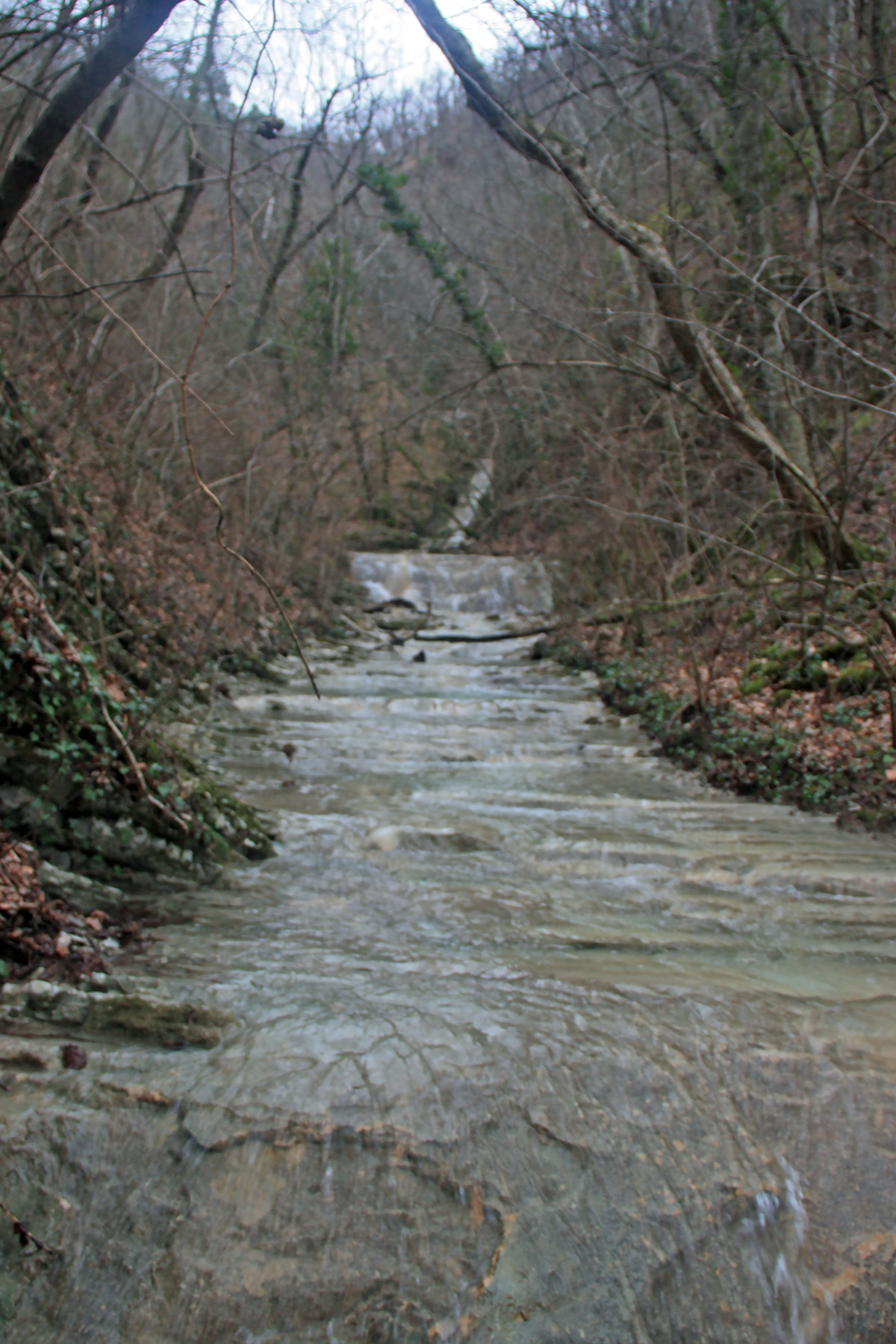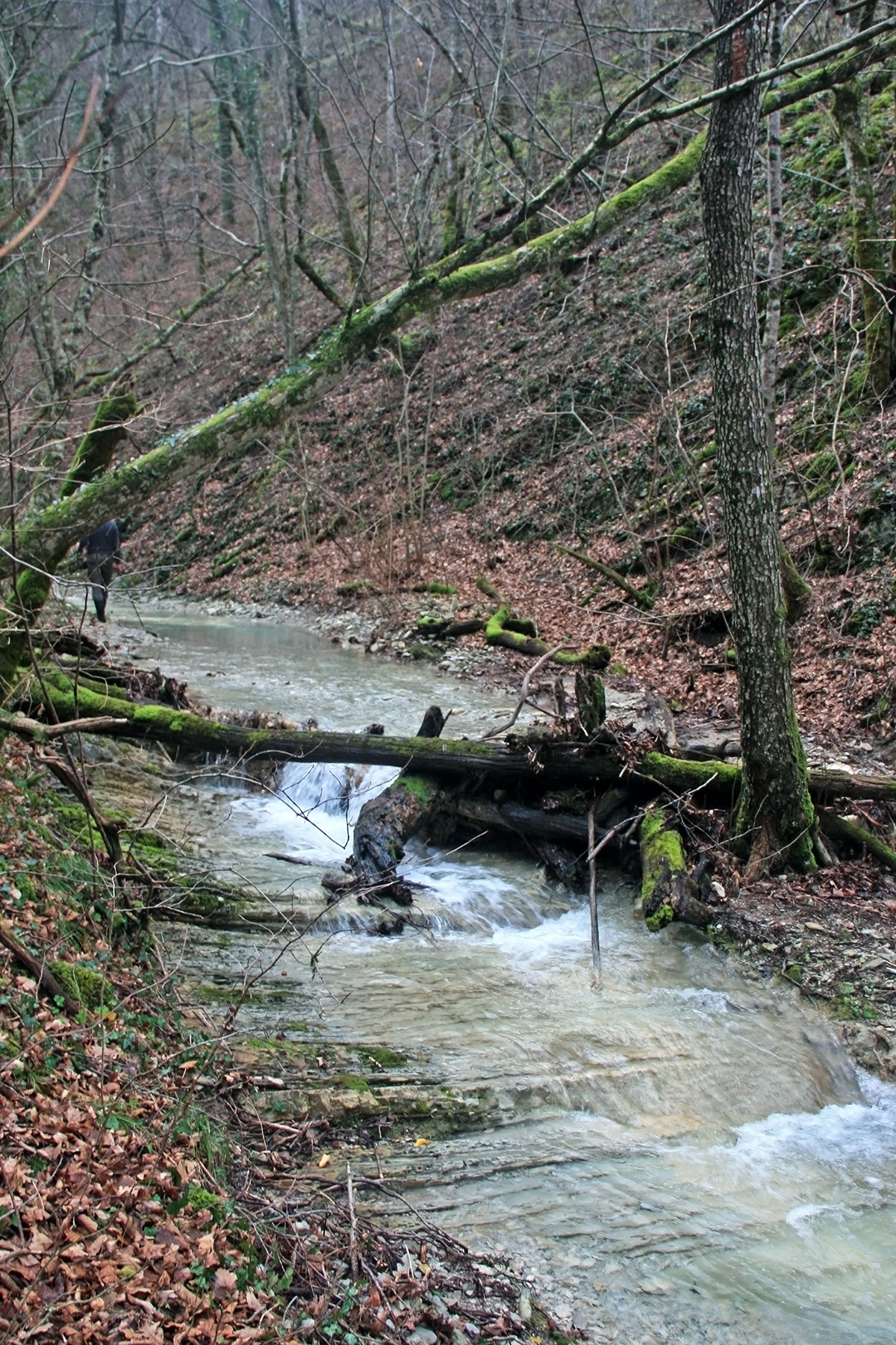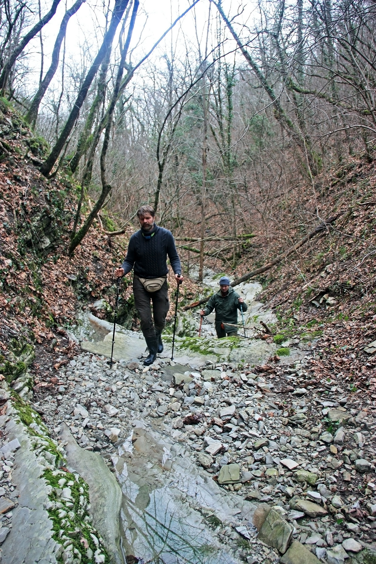 В 12-28 прошли место впадения правого притока. Такого же сухого, как и основное русло. Через пару минут выходим на участок, где слева (правый борт ущелья) сплошная скальная плита, с наклоном 30-35 градусов. Присыпана осенними листьями и поросла мхом. На удивление, на плите растут деревья. Русло под ногами становится «ребристым». Приходиться идти по рёбрам скальных плит, которые сточила вода.