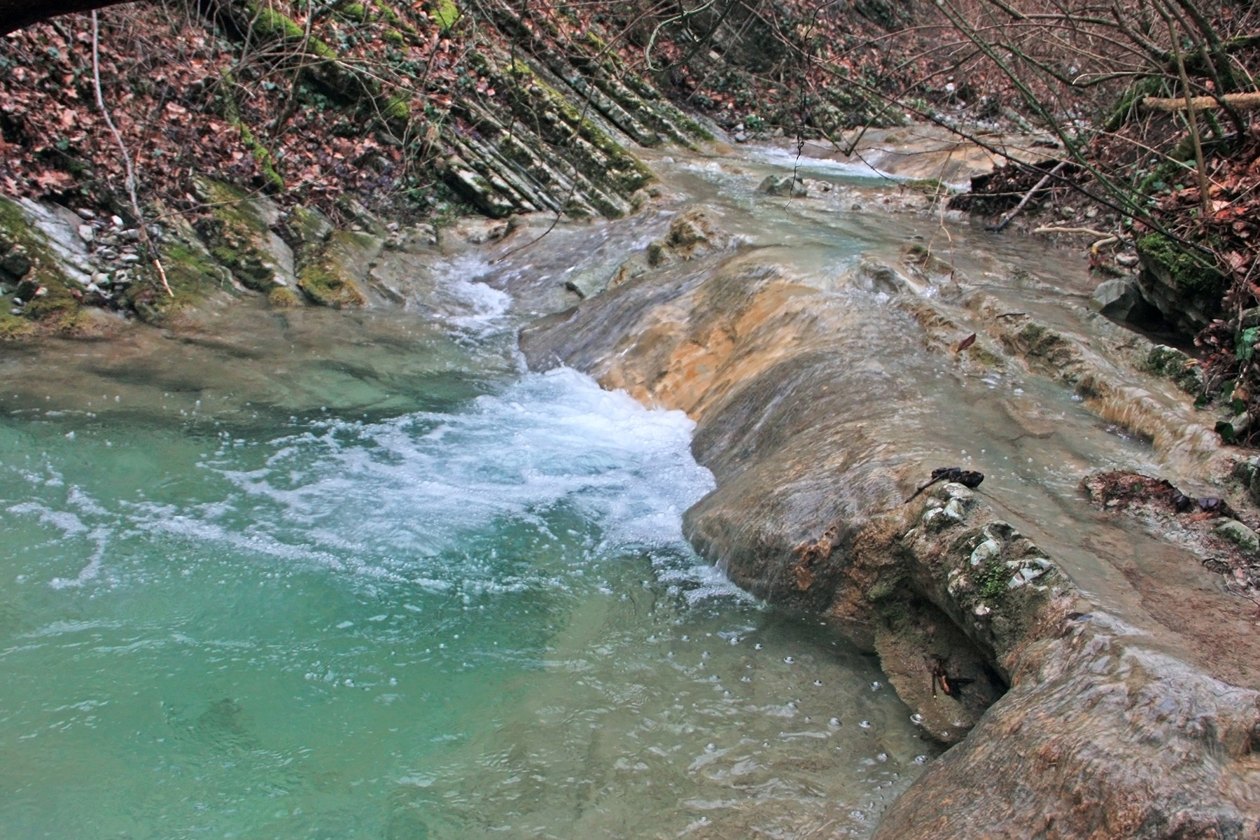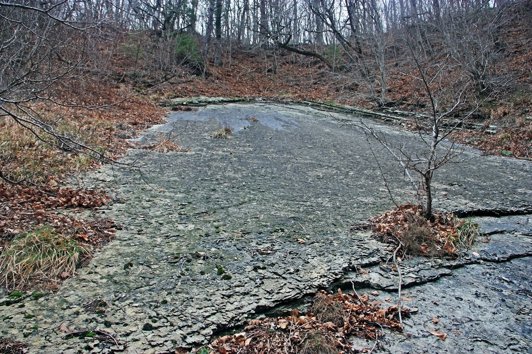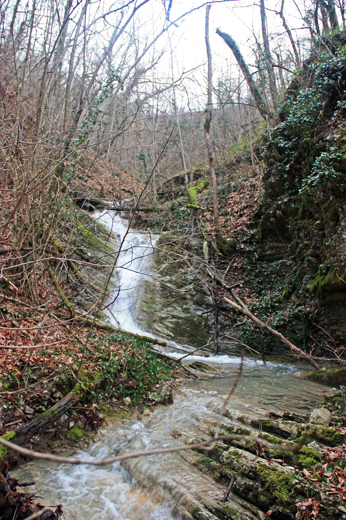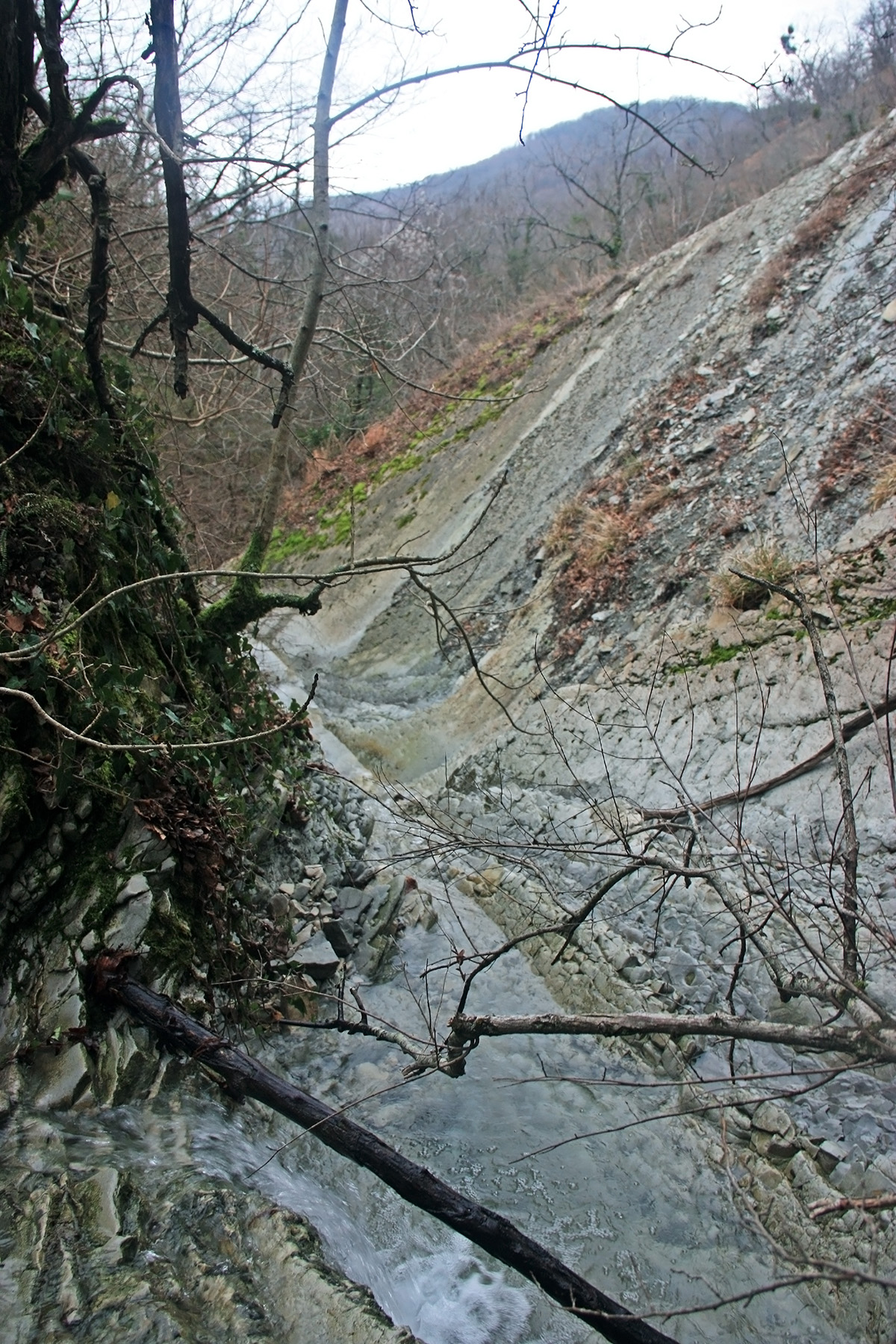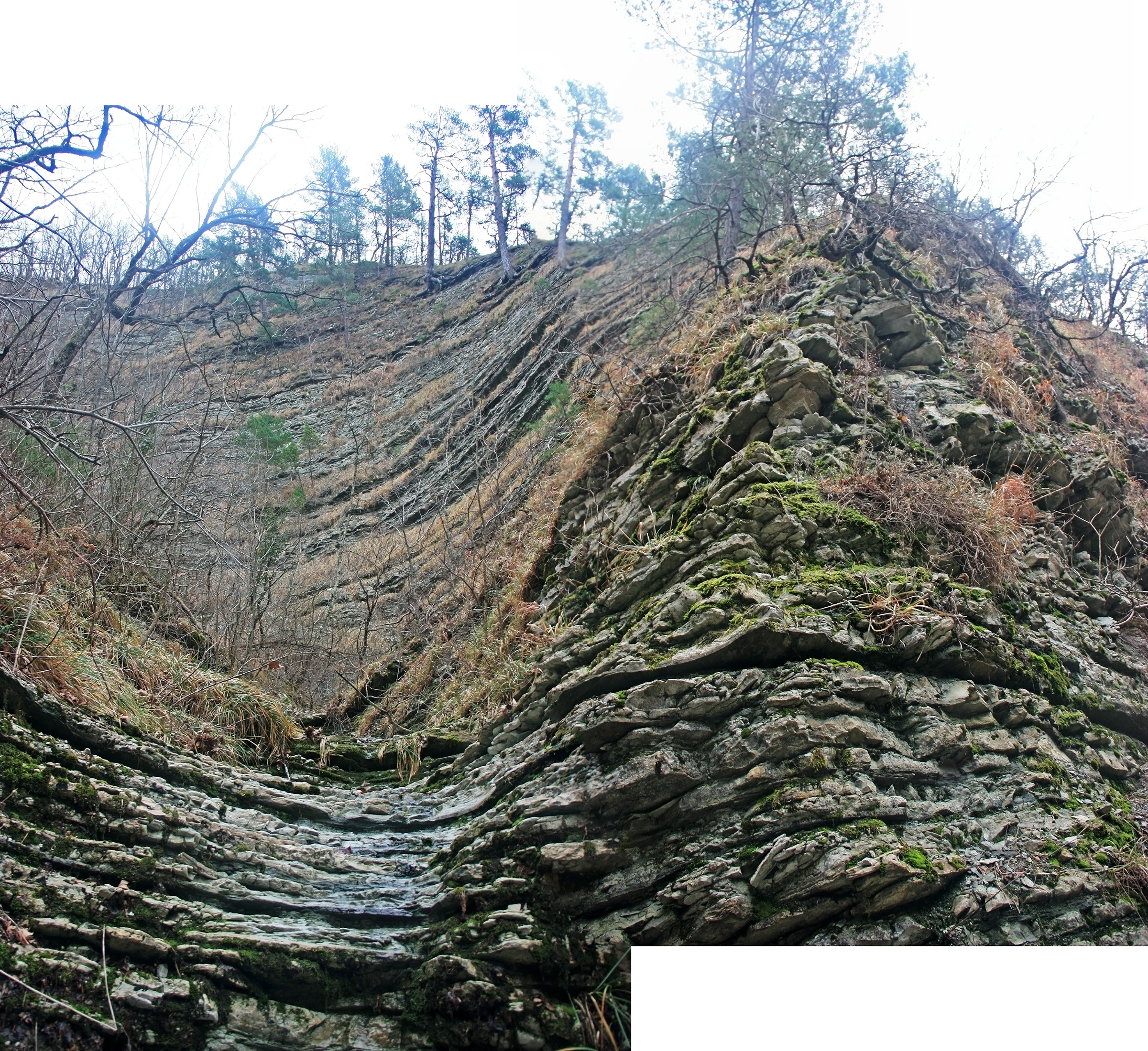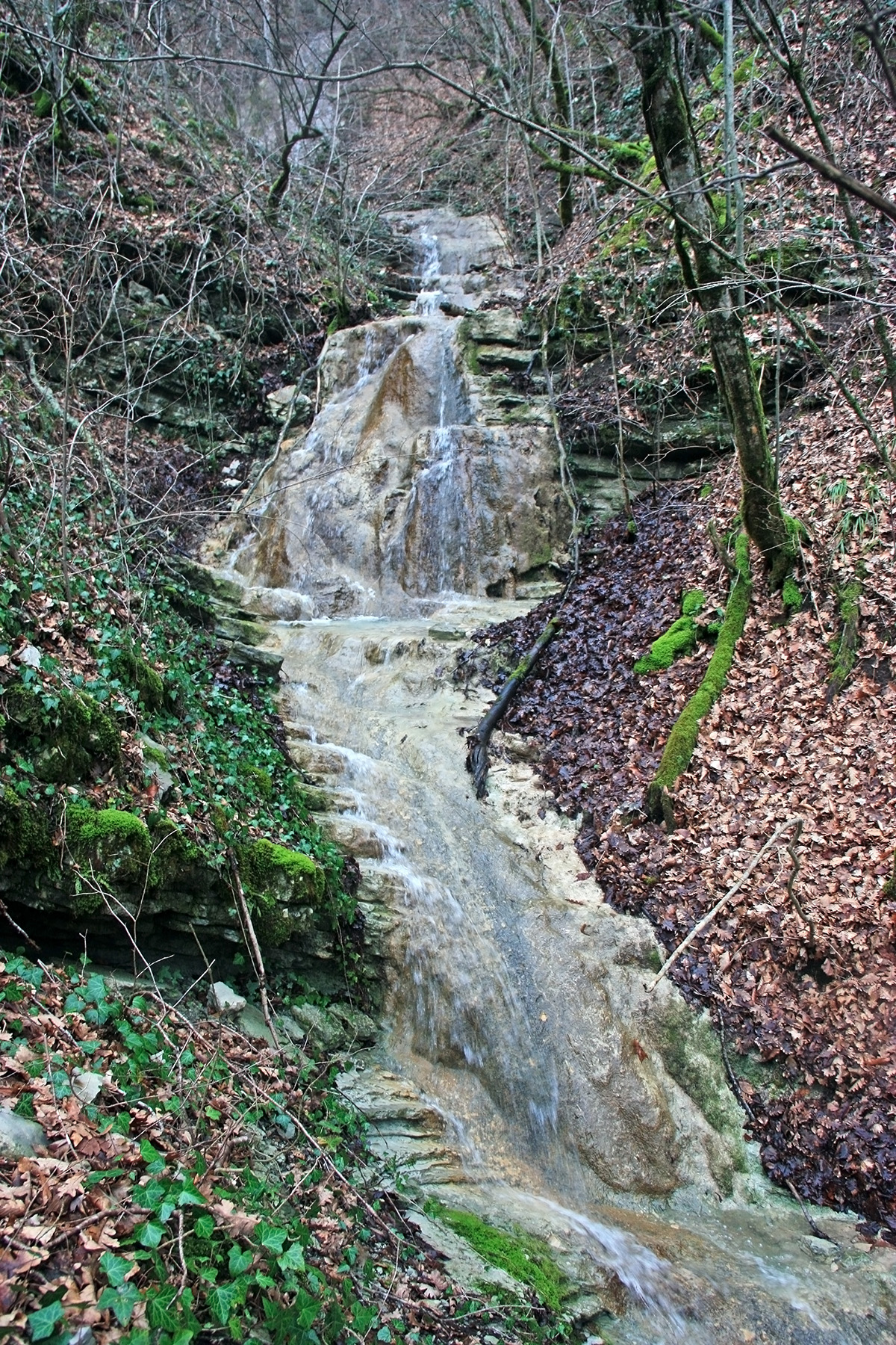 В 12-28 прошли место впадения правого притока. Такого же сухого, как и основное русло. Через пару минут выходим на участок, где слева (правый борт ущелья) сплошная скальная плита, с наклоном 30-35 градусов. Присыпана осенними листьями и поросла мхом. На удивление, на плите растут деревья. Русло под ногами становится «ребристым». Приходиться идти по рёбрам скальных плит, которые сточила вода.