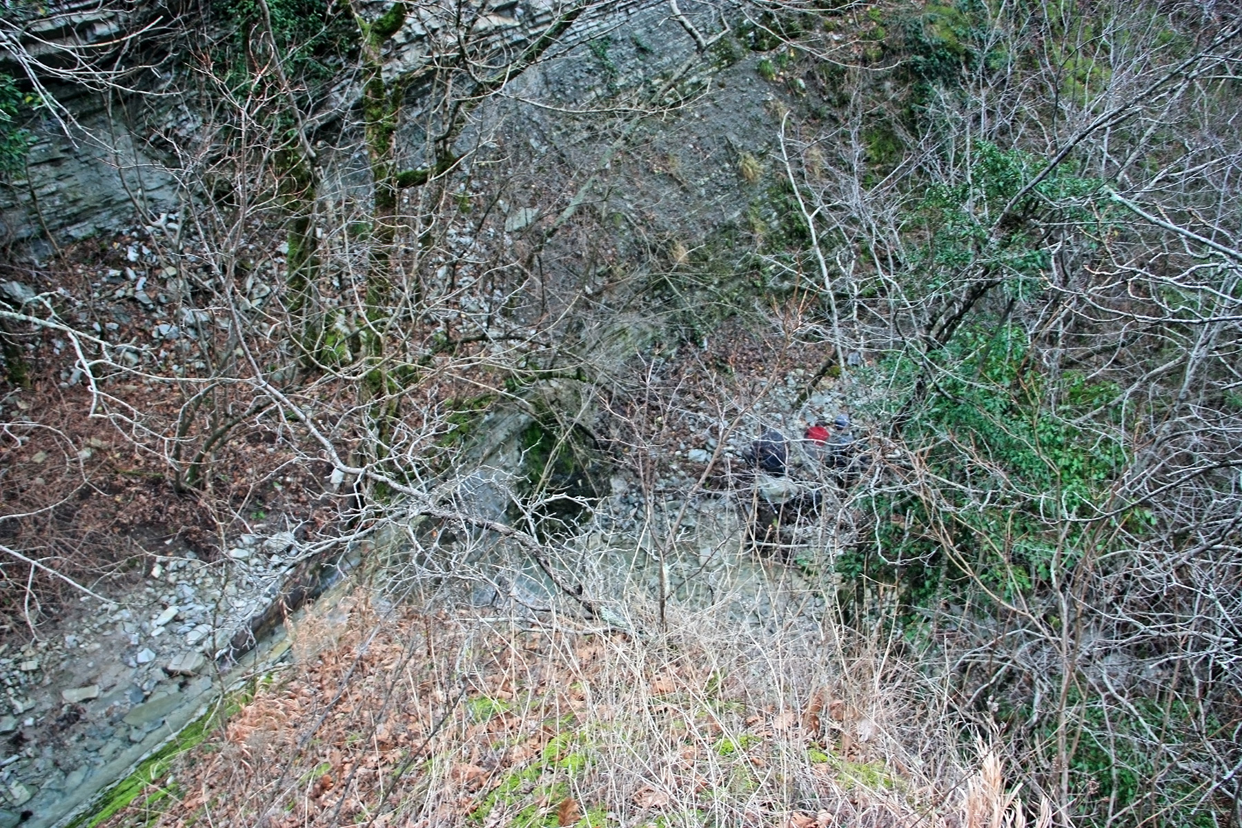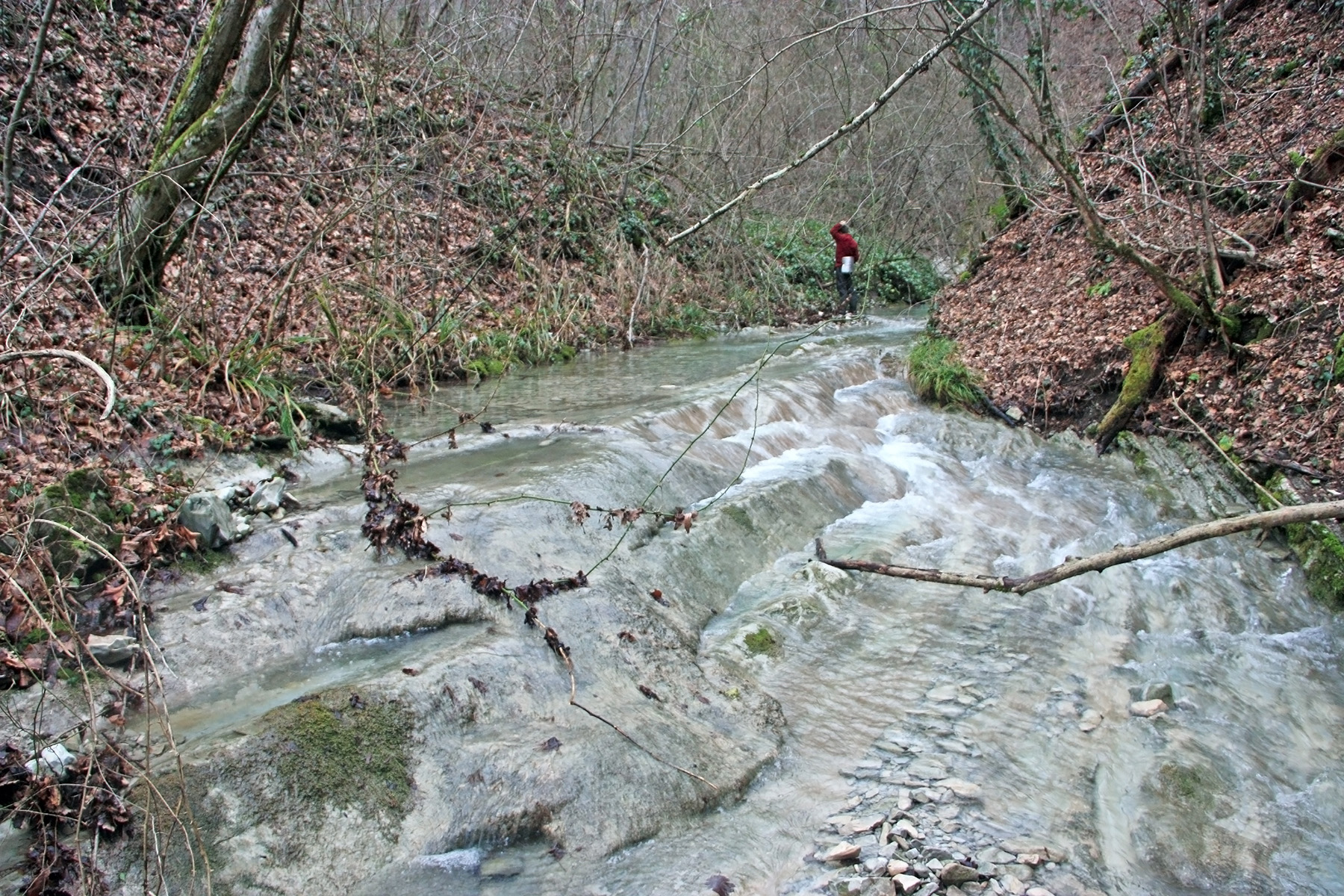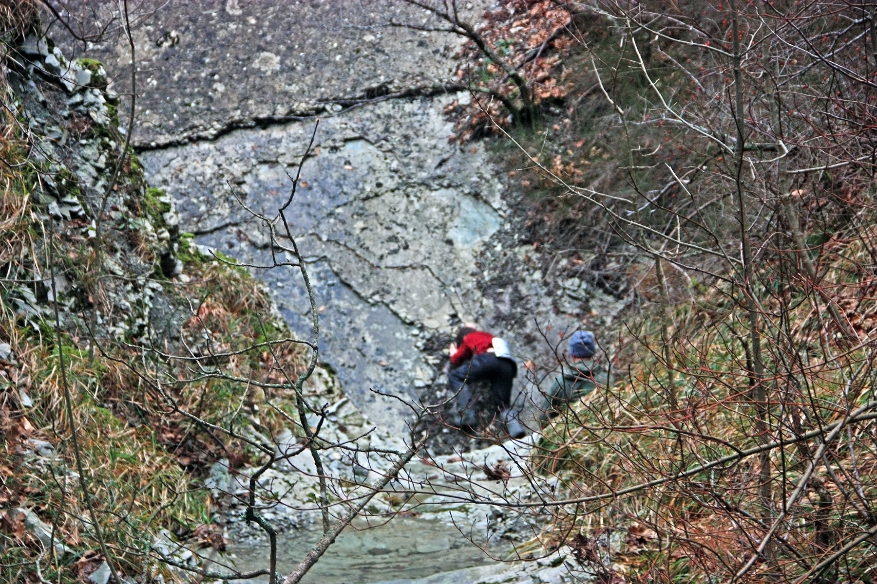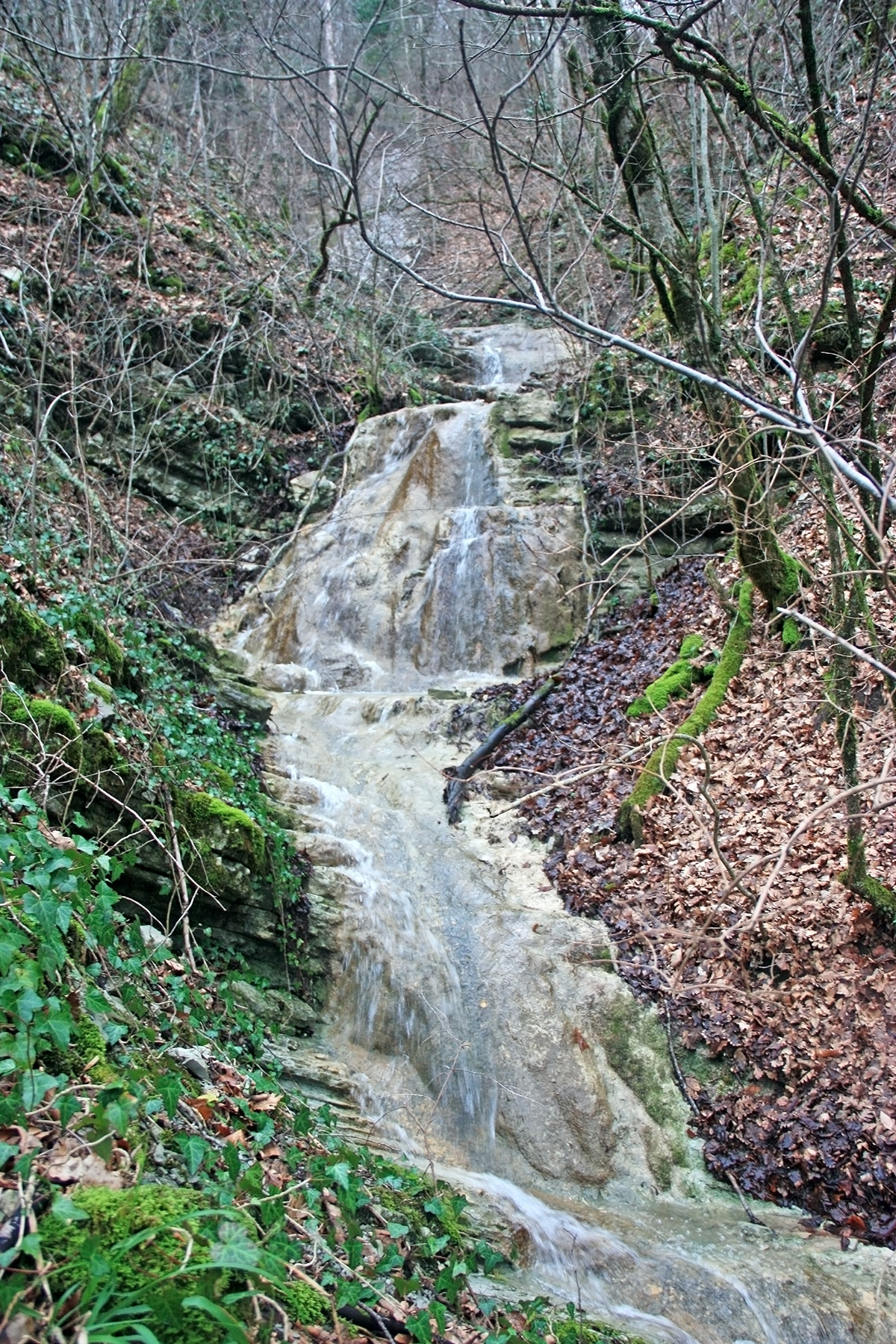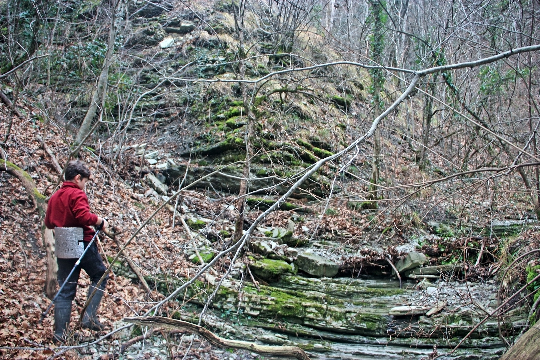 В 12-28 прошли место впадения правого притока. Такого же сухого, как и основное русло. Через пару минут выходим на участок, где слева (правый борт ущелья) сплошная скальная плита, с наклоном 30-35 градусов. Присыпана осенними листьями и поросла мхом. На удивление, на плите растут деревья. Русло под ногами становится «ребристым». Приходиться идти по рёбрам скальных плит, которые сточила вода.