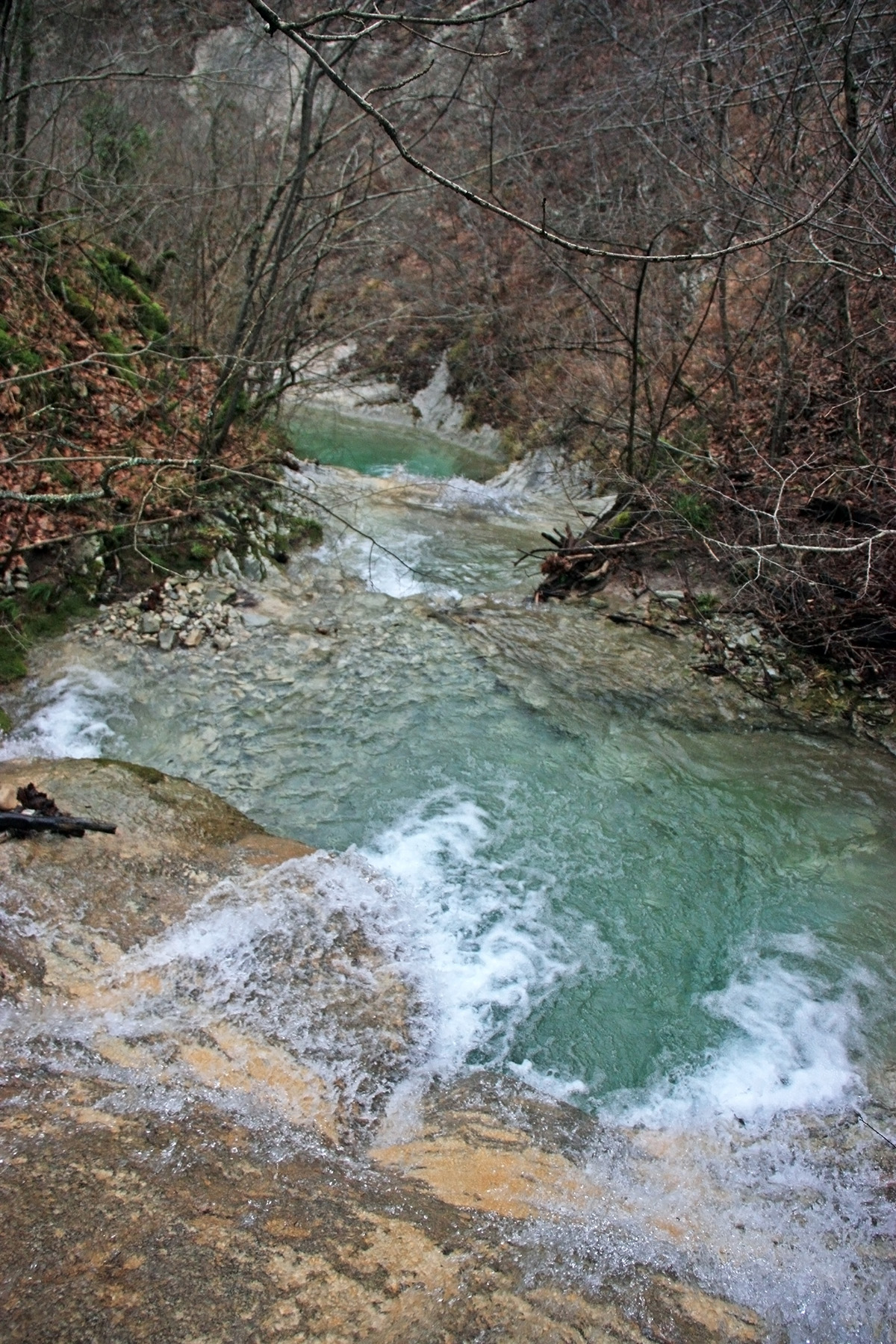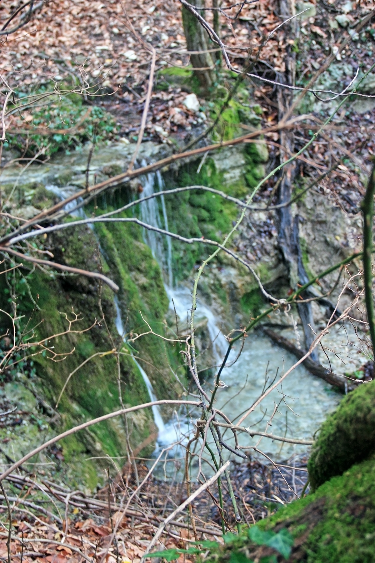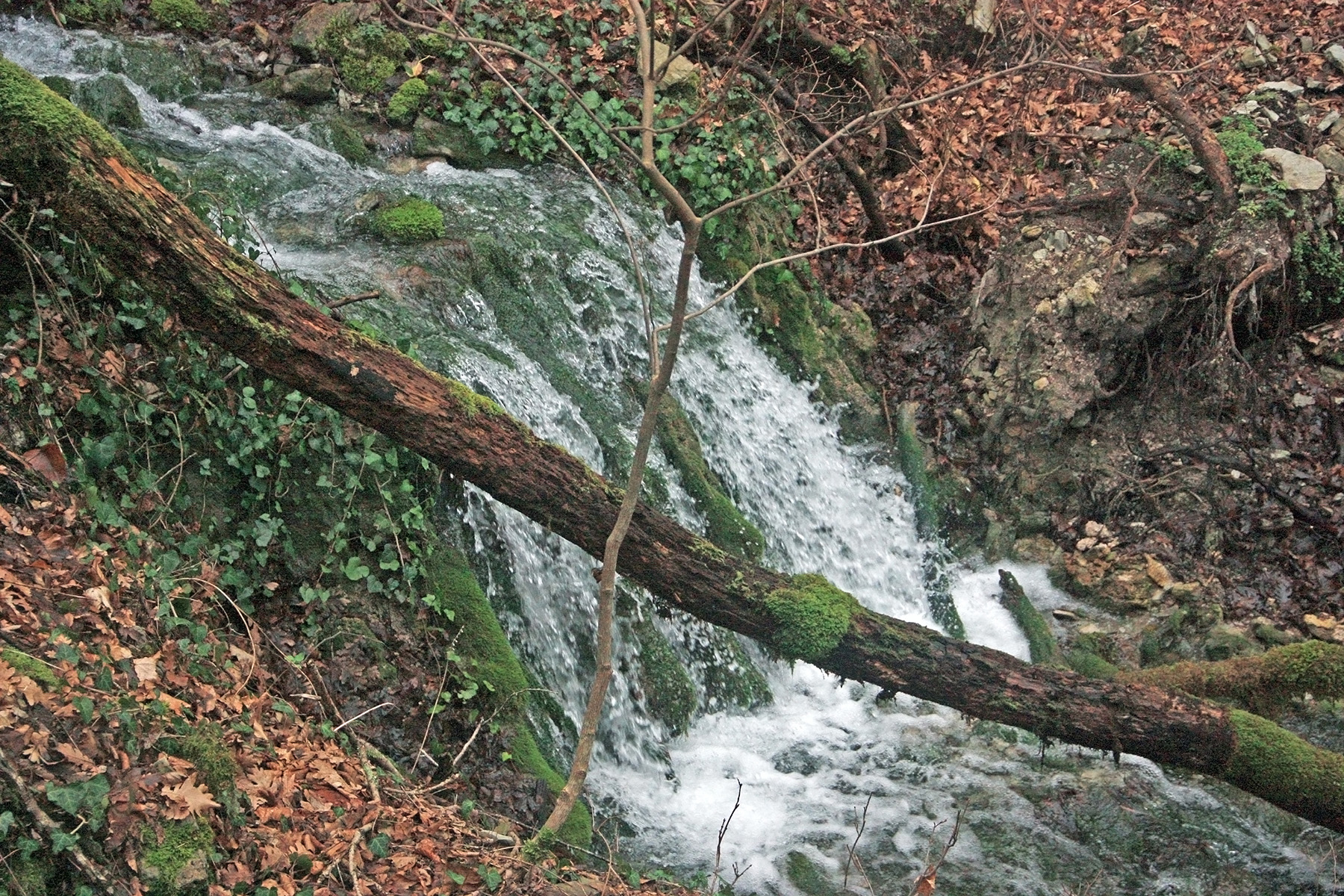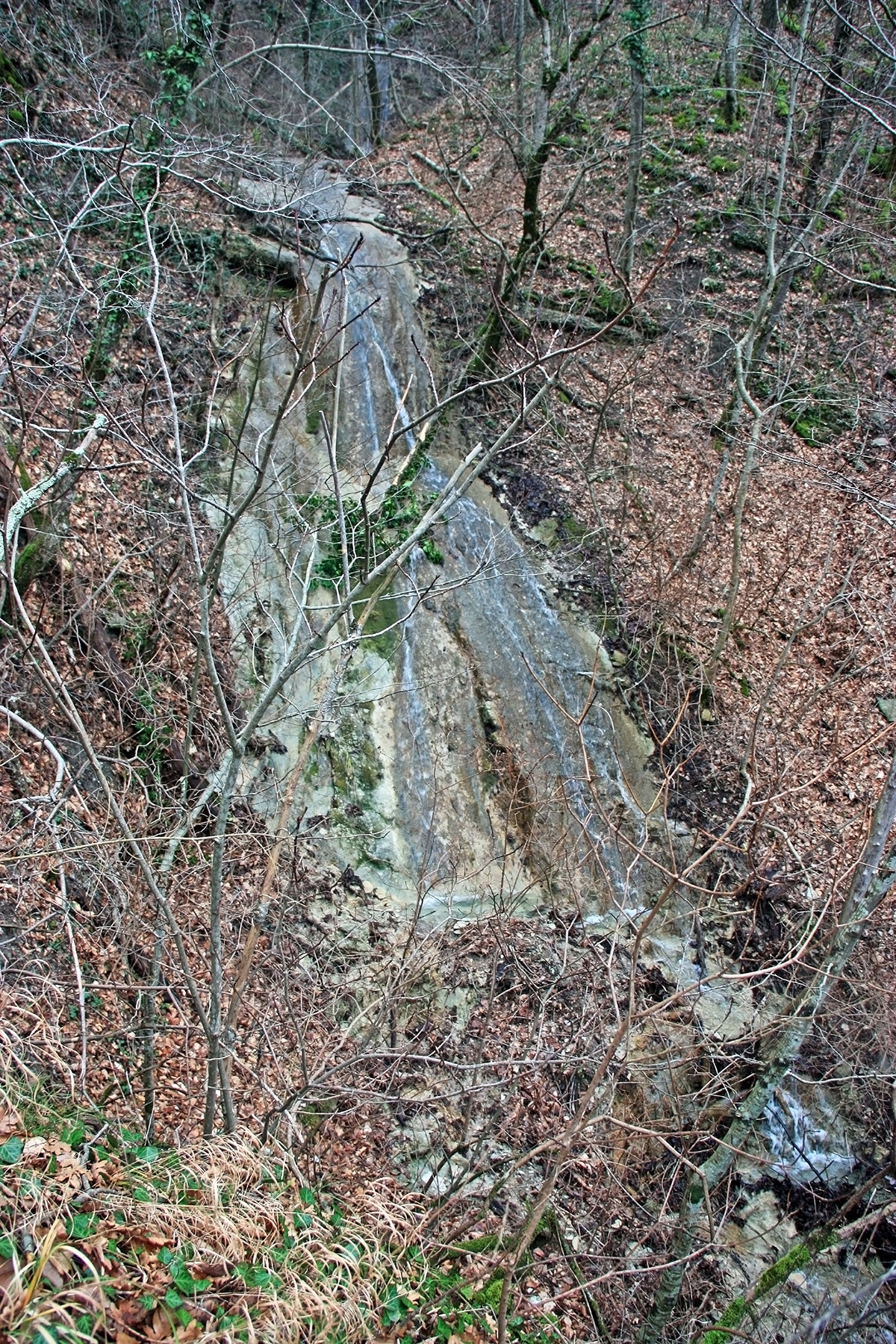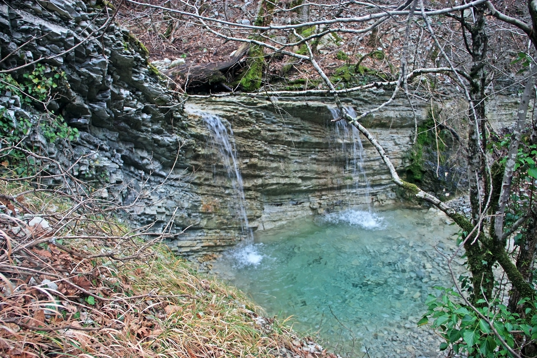 В 12-28 прошли место впадения правого притока. Такого же сухого, как и основное русло. Через пару минут выходим на участок, где слева (правый борт ущелья) сплошная скальная плита, с наклоном 30-35 градусов. Присыпана осенними листьями и поросла мхом. На удивление, на плите растут деревья. Русло под ногами становится «ребристым». Приходиться идти по рёбрам скальных плит, которые сточила вода.