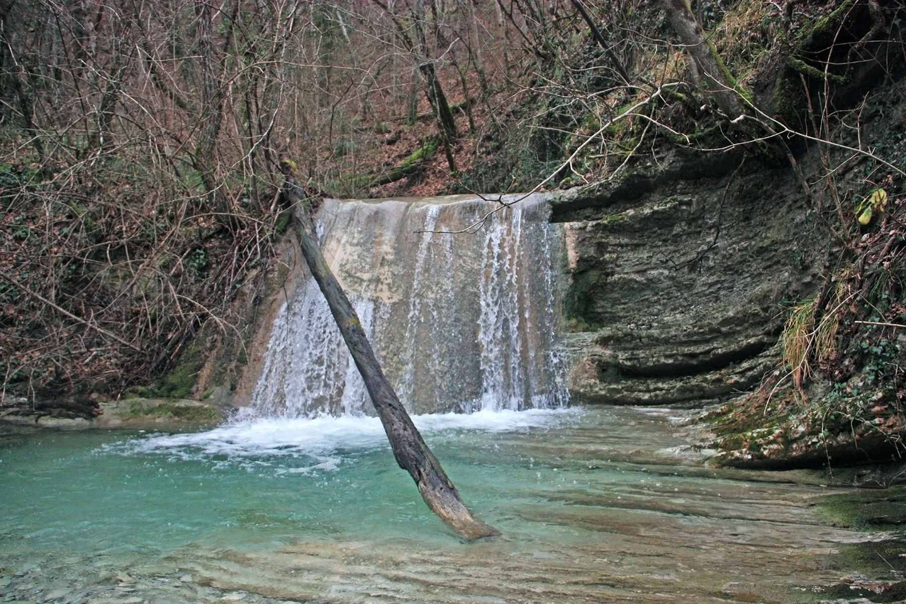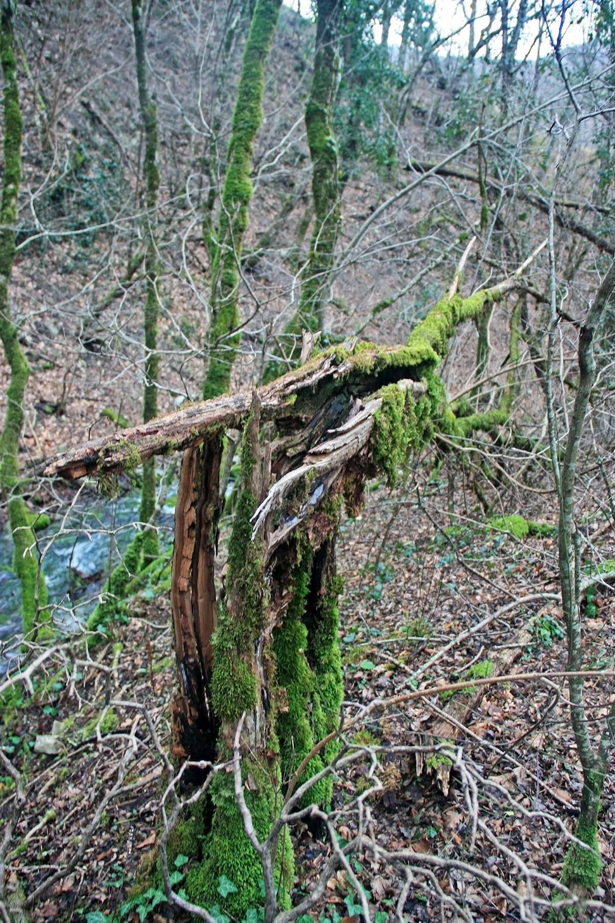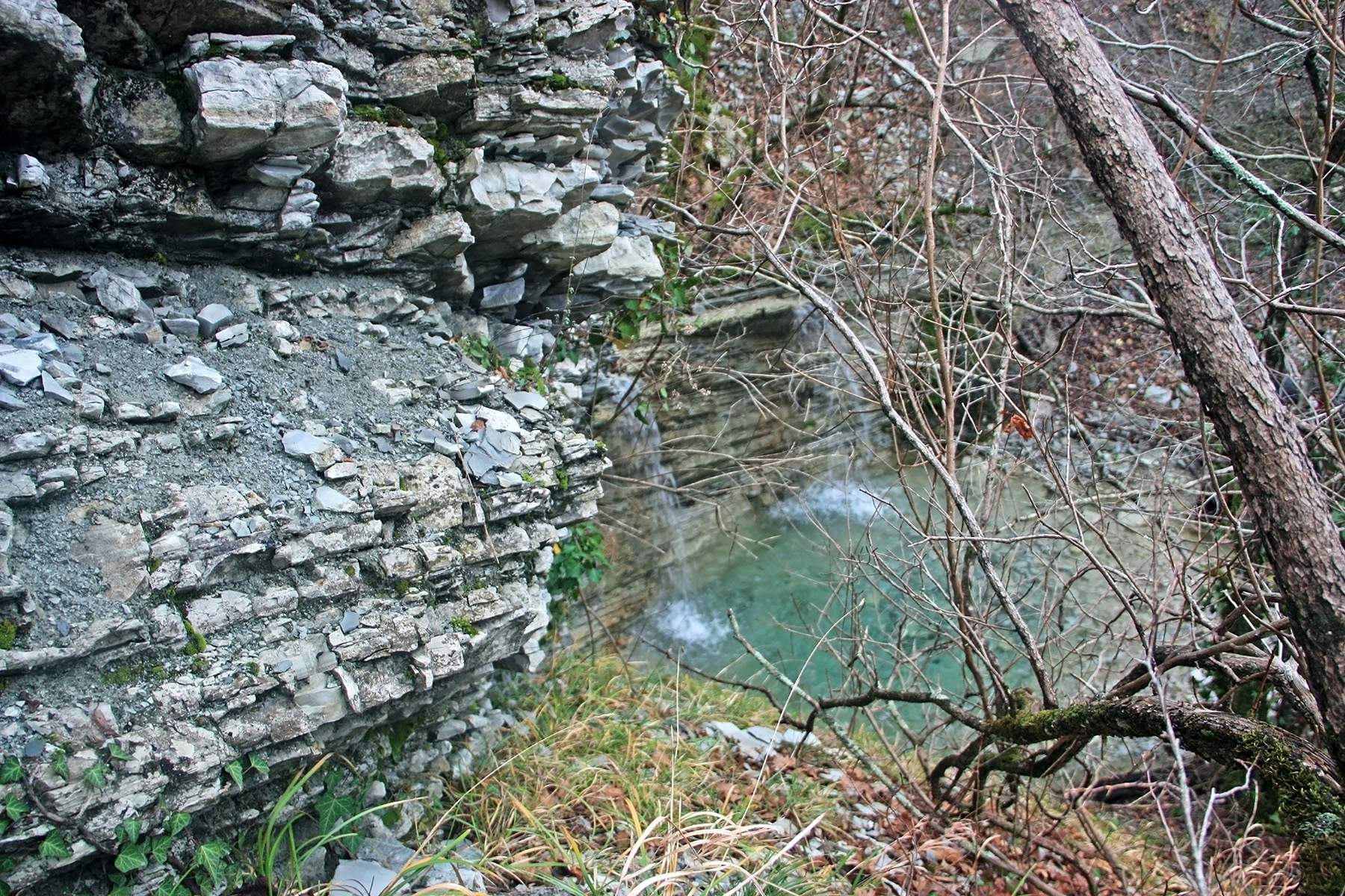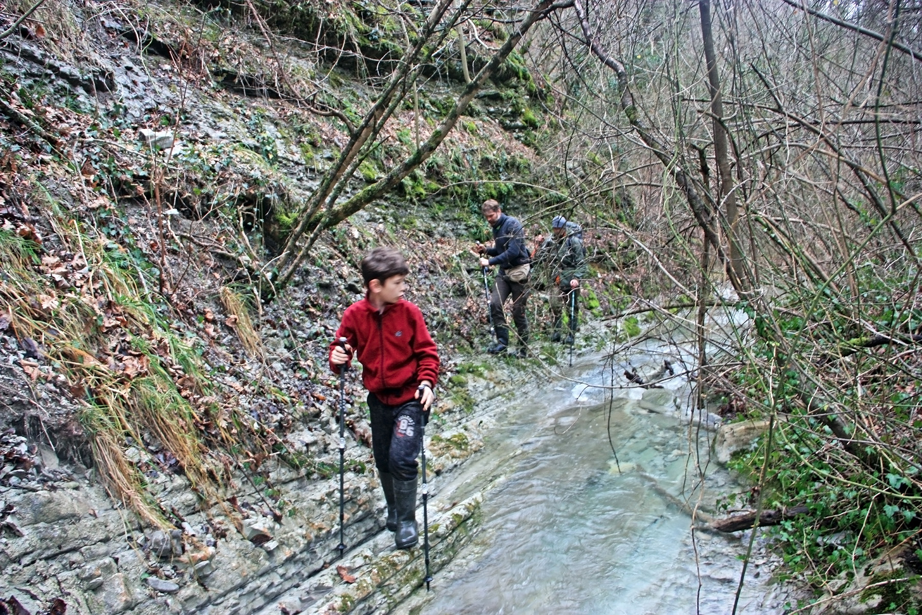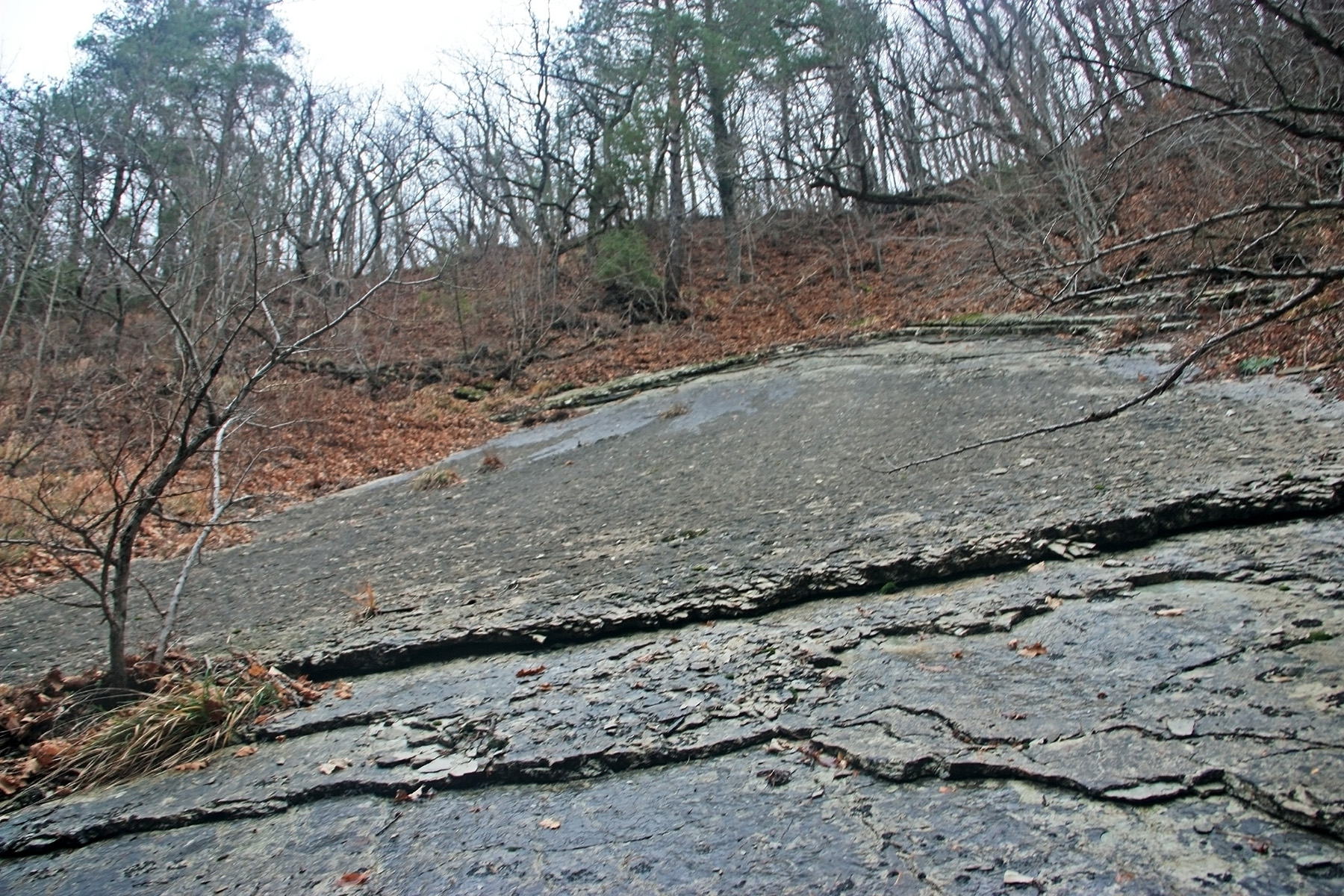 В 12-28 прошли место впадения правого притока. Такого же сухого, как и основное русло. Через пару минут выходим на участок, где слева (правый борт ущелья) сплошная скальная плита, с наклоном 30-35 градусов. Присыпана осенними листьями и поросла мхом. На удивление, на плите растут деревья. Русло под ногами становится «ребристым». Приходиться идти по рёбрам скальных плит, которые сточила вода.