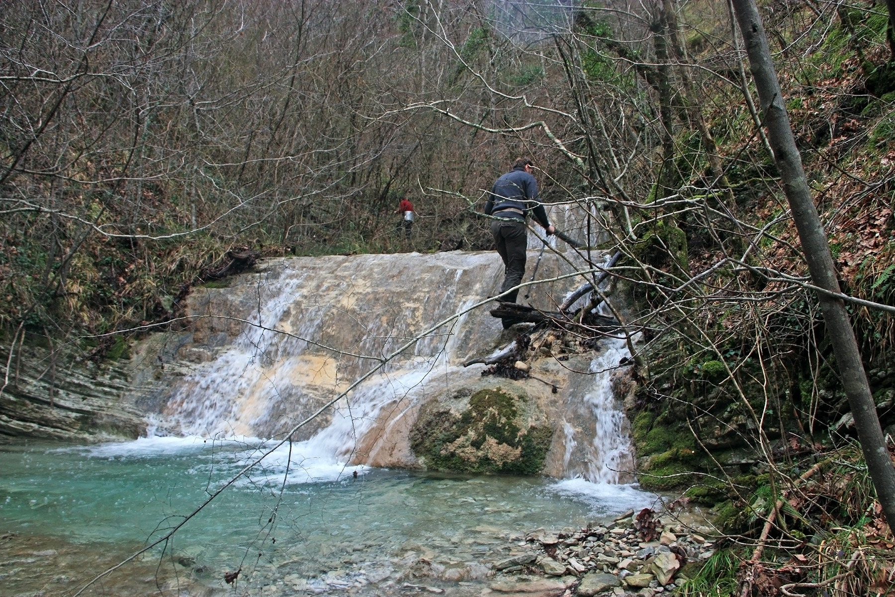 В 10-43 выходим к каскаду водопадов. Видим 4 ступени. Перед нижним водопадом обширная ванна. Высота ступени 3-4 метра. Ступень обходим справа по склону. Выходим в русло. Я пытаюсь заглянуть на ступень сверху.