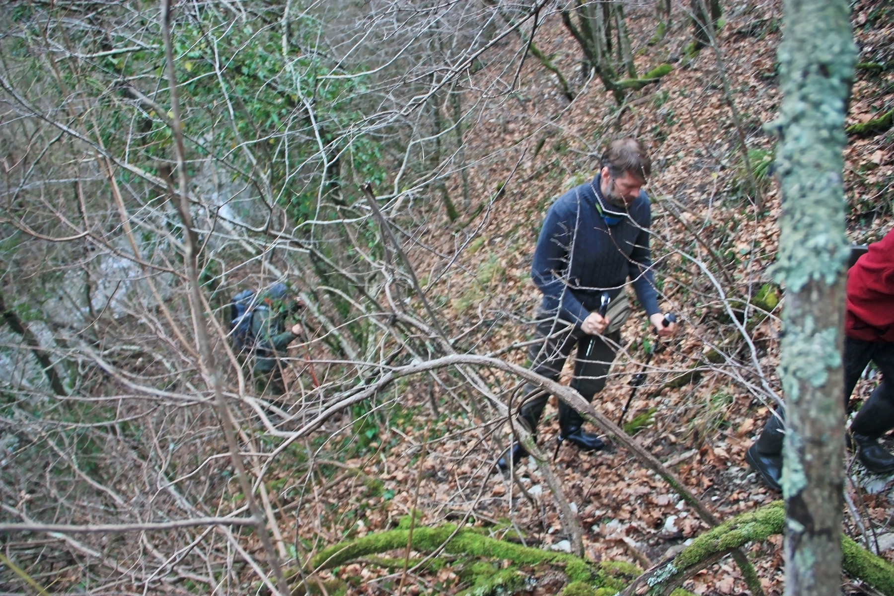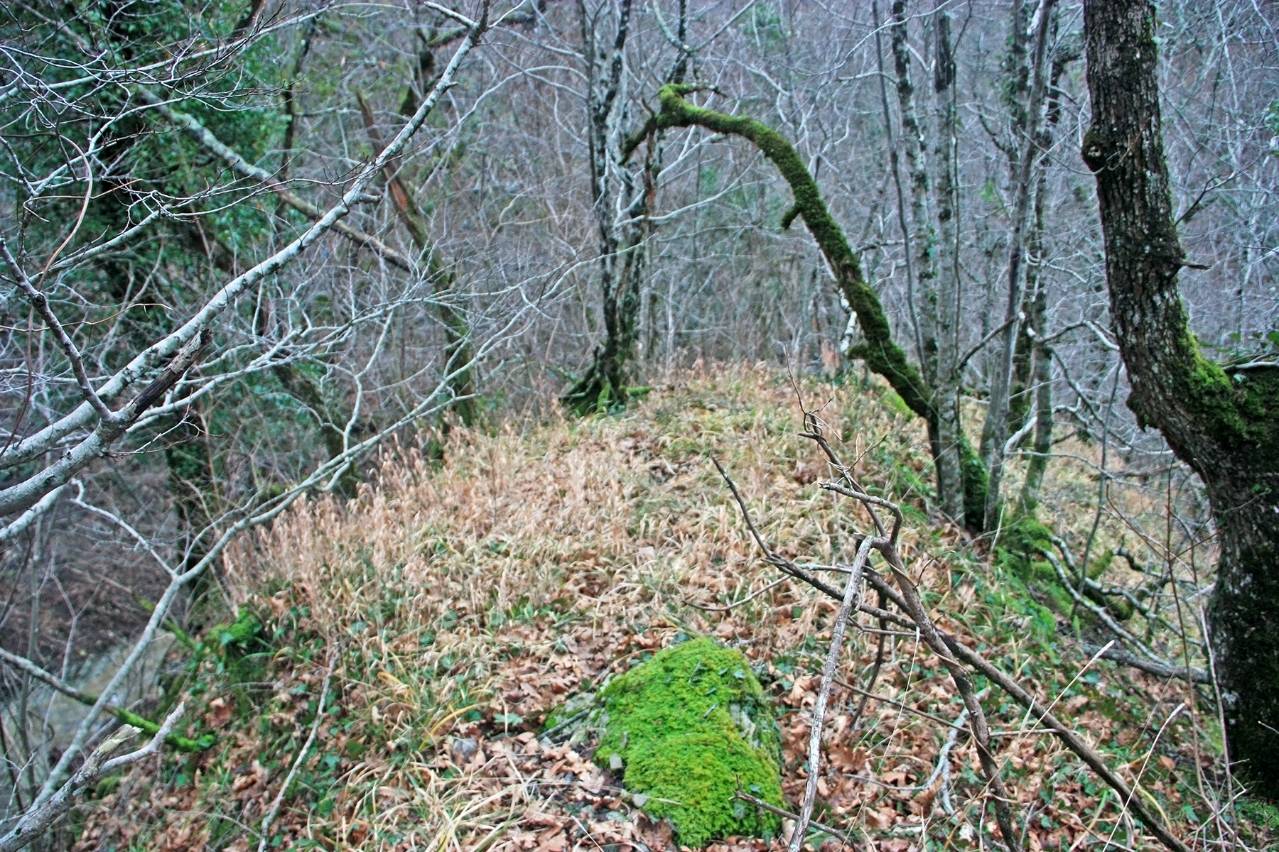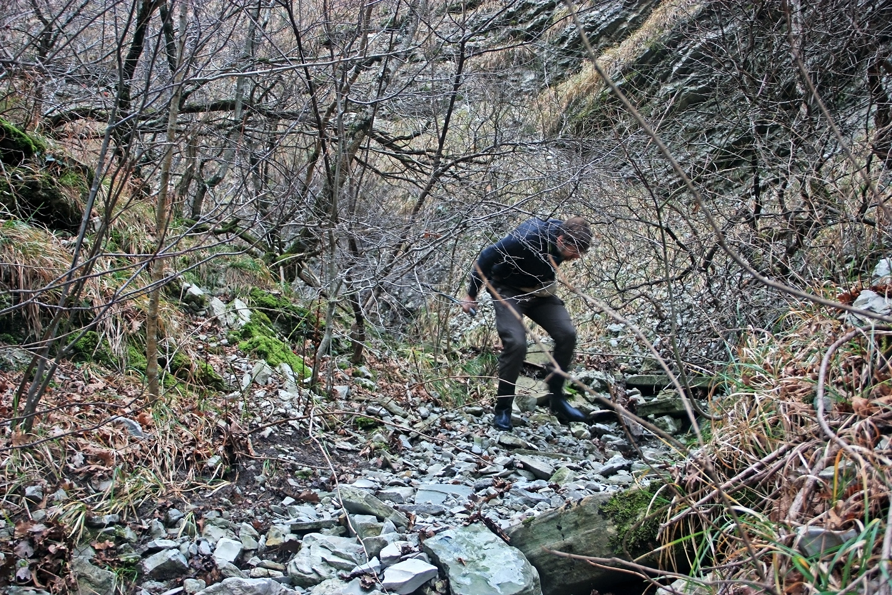 Подъём «в лоб» будет крайне затруднителен. Слева вновь замечаем «натоптыш» по склону. Идём туда. Поднявшись на 15-20 метров над дном русла, выходим на прогалину на склоне. Она заполнена прошлогодней травой и низкорослым, колючим кустарником.