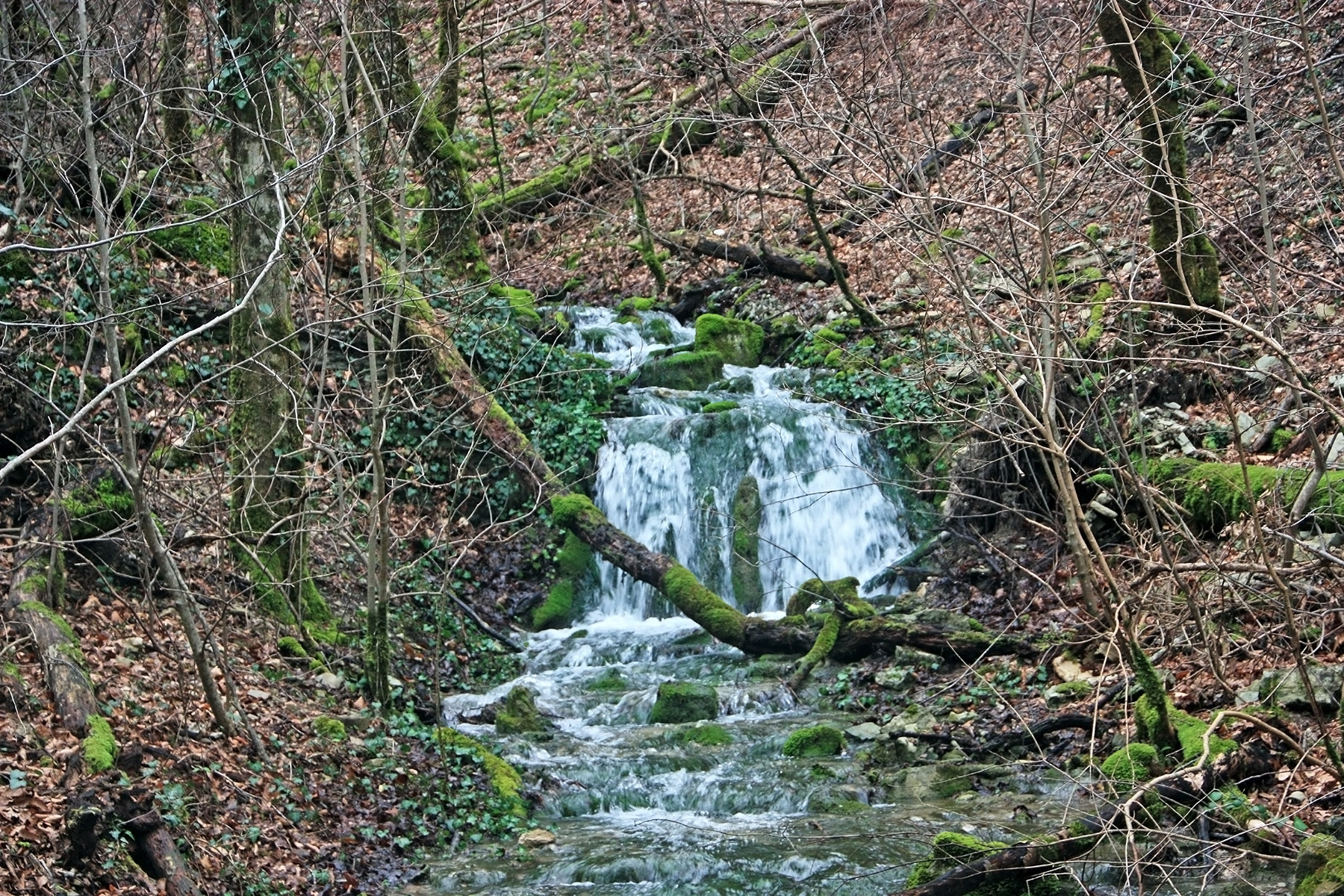 Русло живописное, радует нас сливами, ступеньками, ваннами. Упавшими деревьями. В 10-38 подходим к небольшому водопадику, в пределах 2-х метров высотой. Мы с Гришей поднялись слева от потока, прямо по ступени. А Егор пошёл искать «свой путь» на склон.