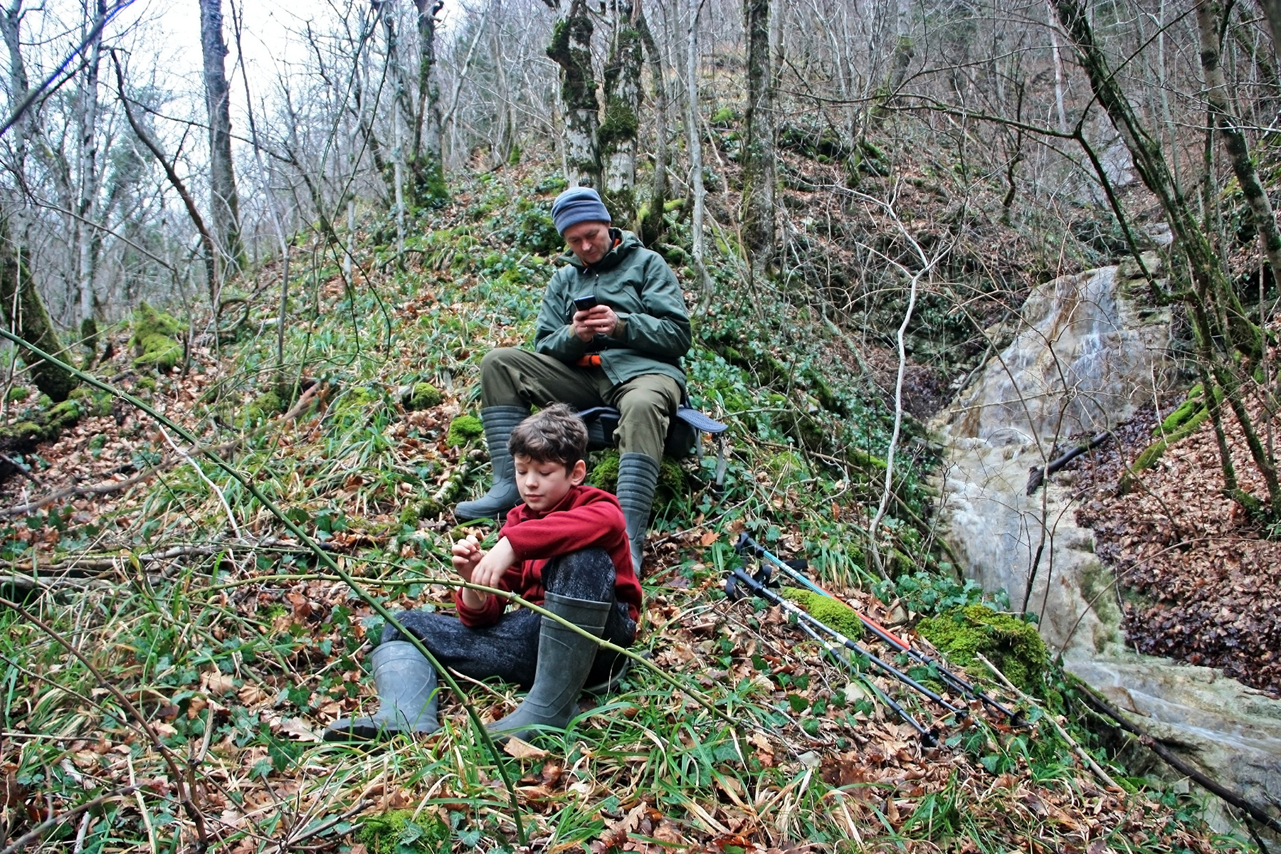 Водопад полноводный, смотрится. Высота 5-6 метров. Прошу ребят подождать, а сам иду по руслу правого притока «заглянуть за угол», за поворот русла. За поворотом нахожу небольшой водопад. Метра 3-4 высотой. От него решаю подняться по левому берегу к предыдущему водопаду. Берег зарос густым подлеском, в котором много колючих плетей. Сильно выручает секатор.