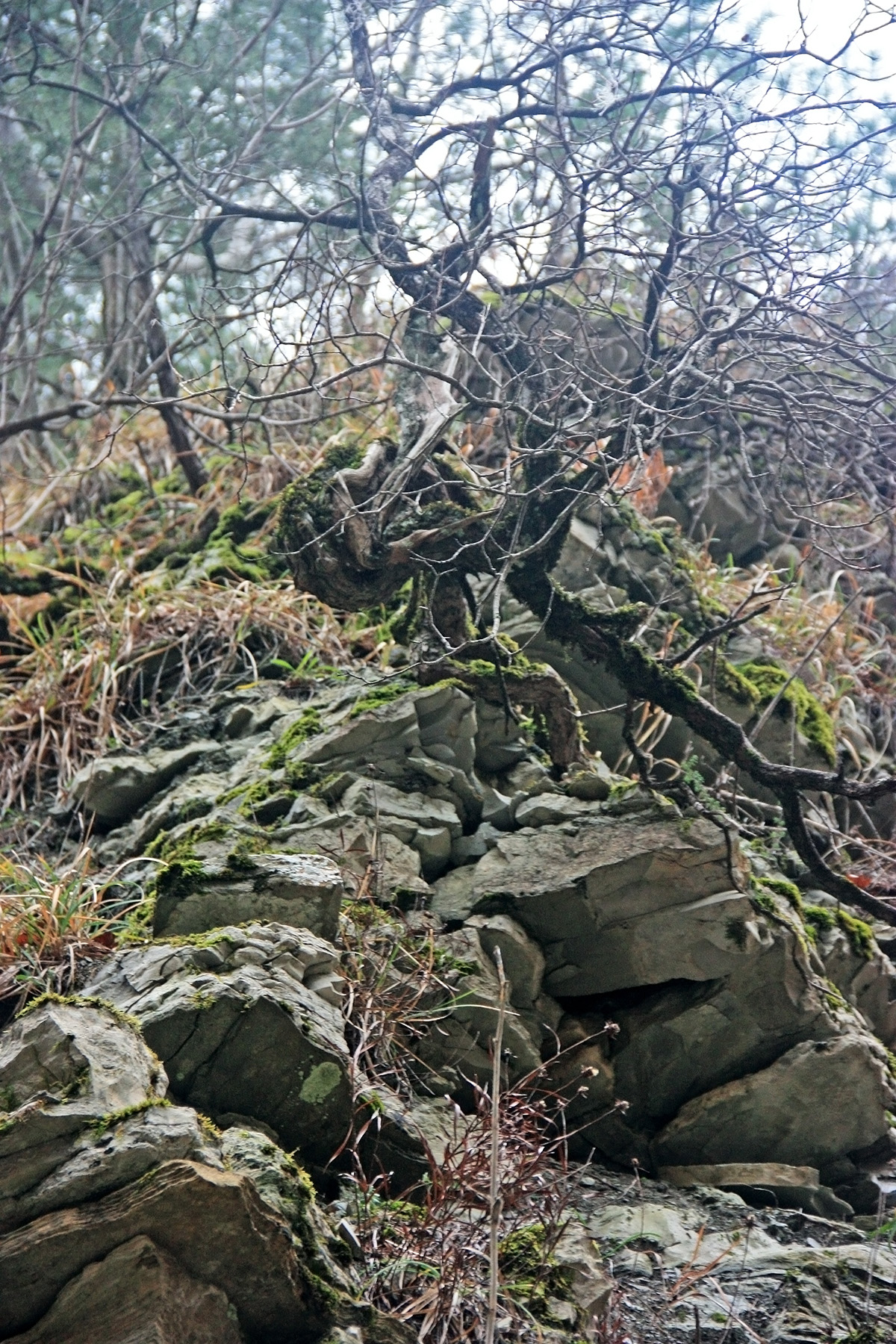 ...слева сплошная скальная плита. Но на ней растут и трава, и деревца.