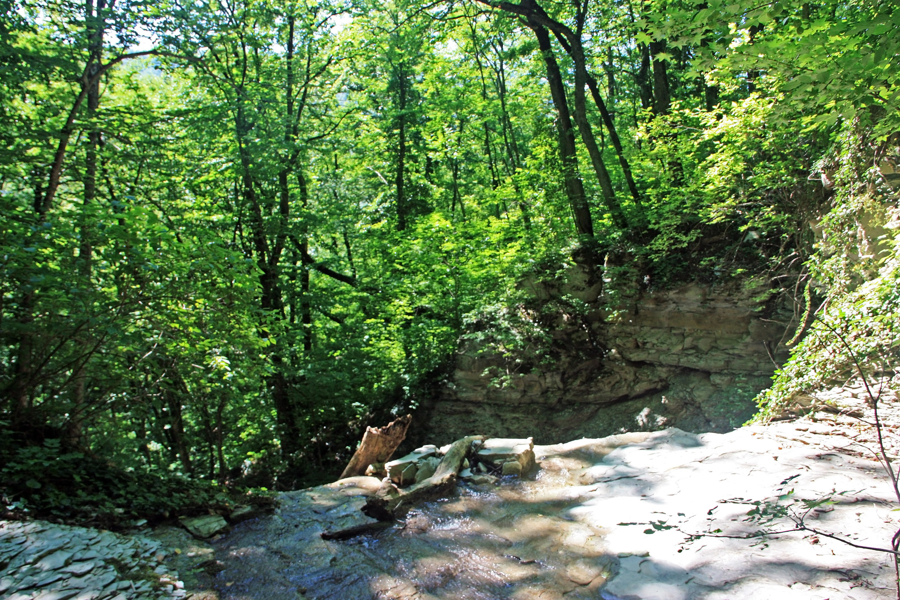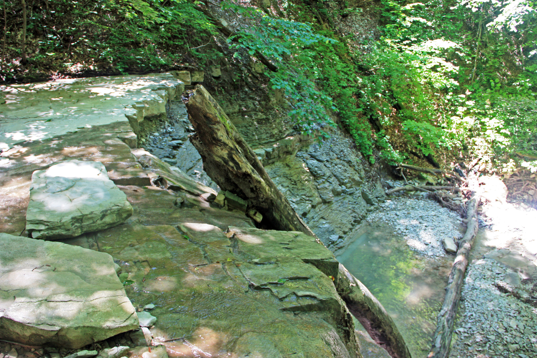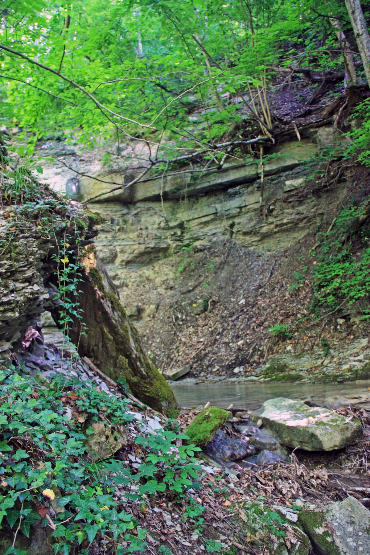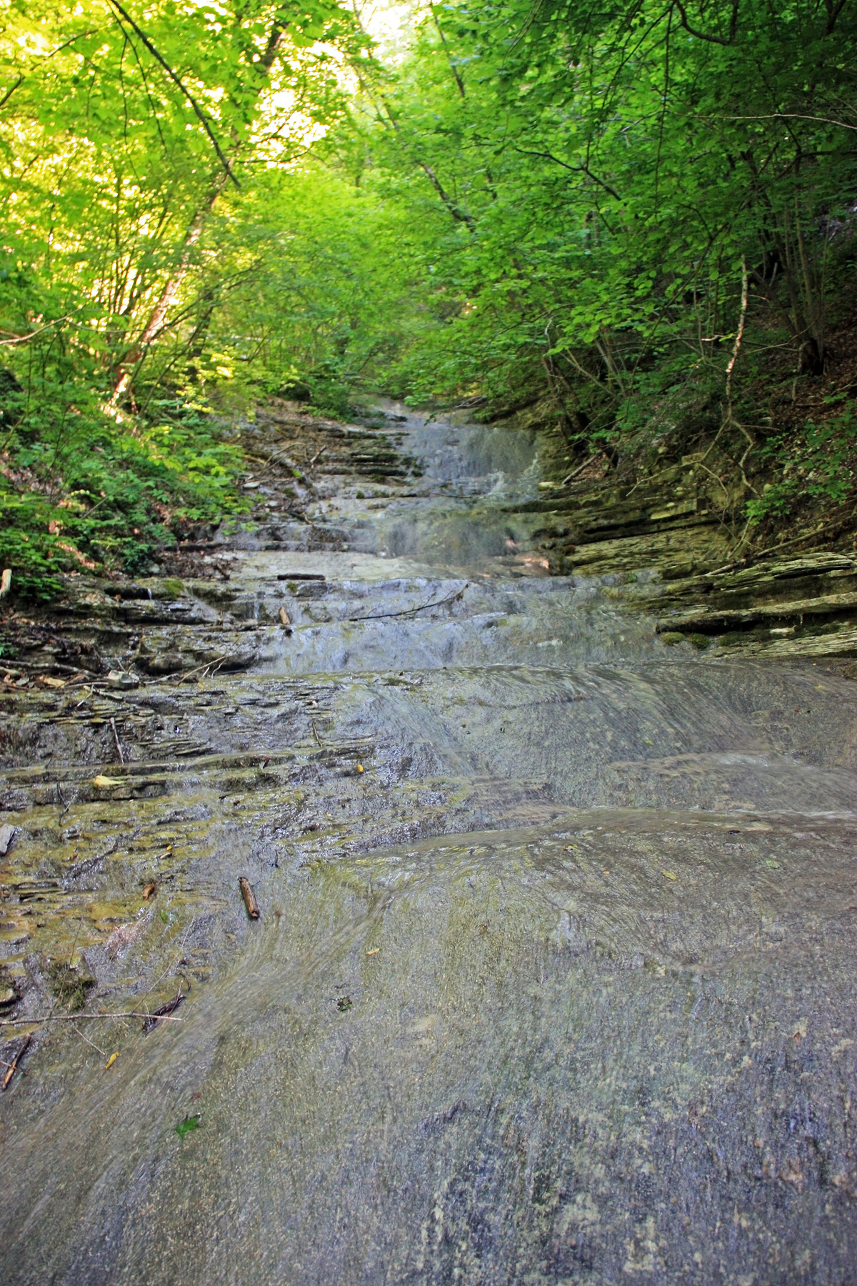 Подхожу ближе, справа вижу русло притока (левого притока). Узкий поток воды смыл грунт со скальной основы. Основа состоит из ступенчатых плит. Воды в русле сейчас нет, только сырость.