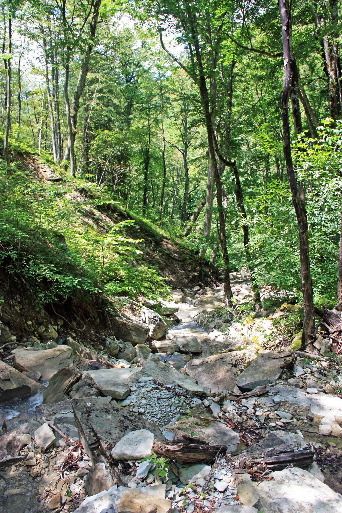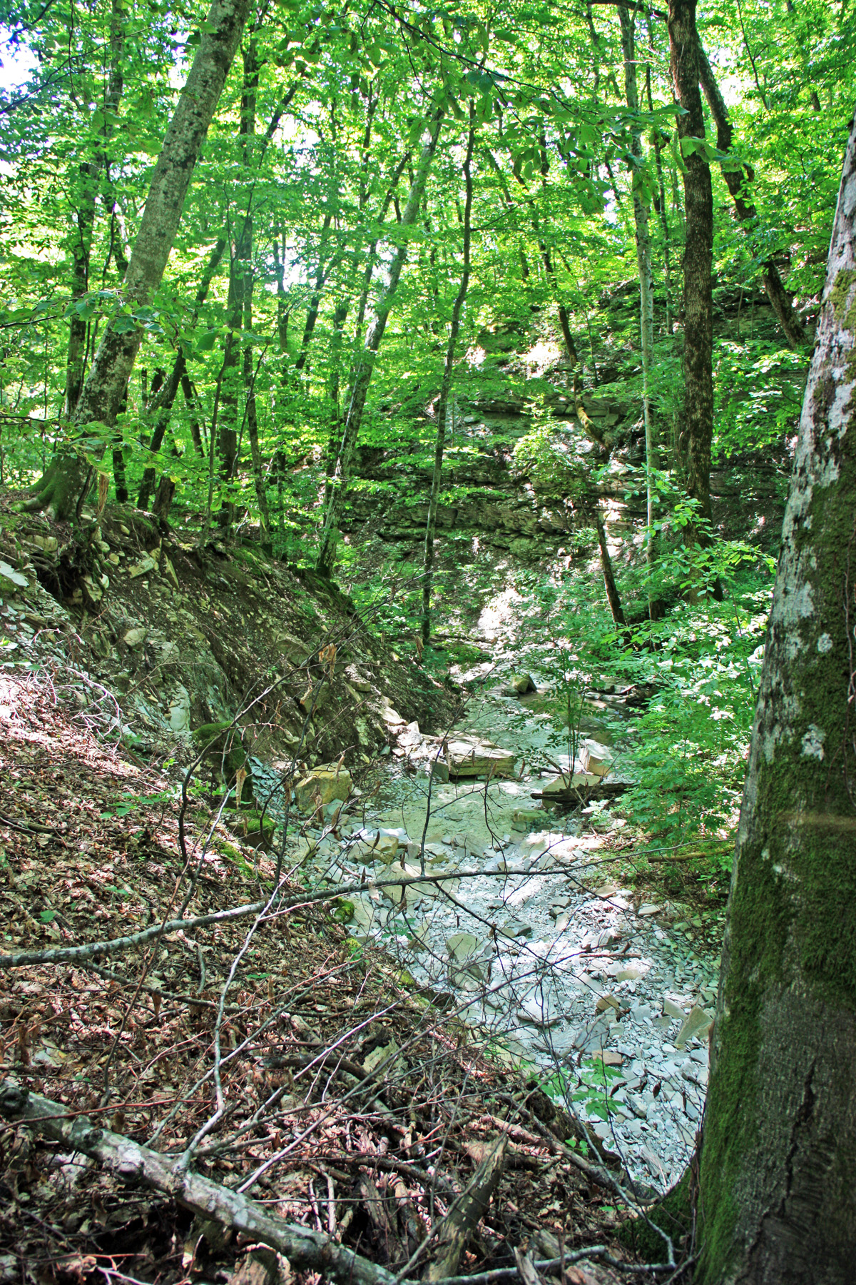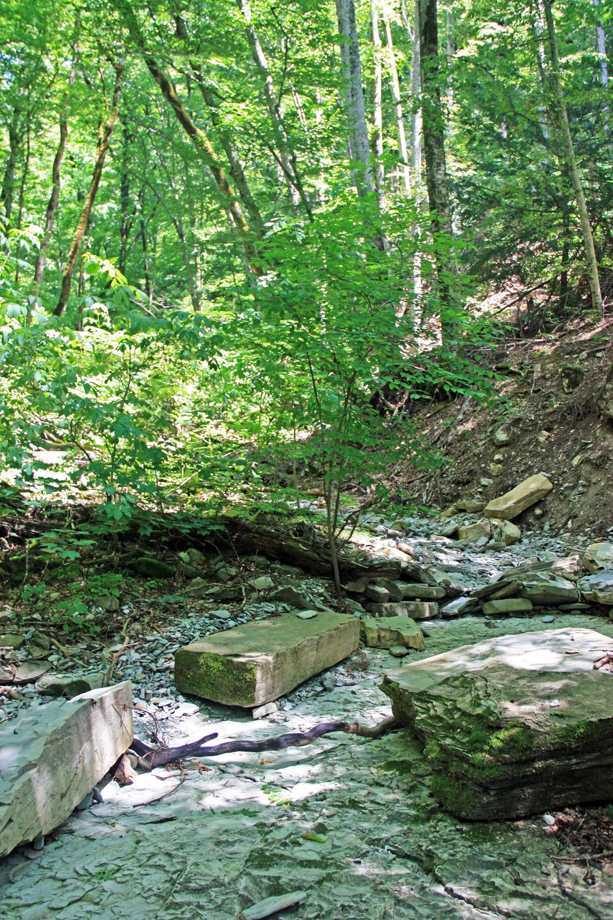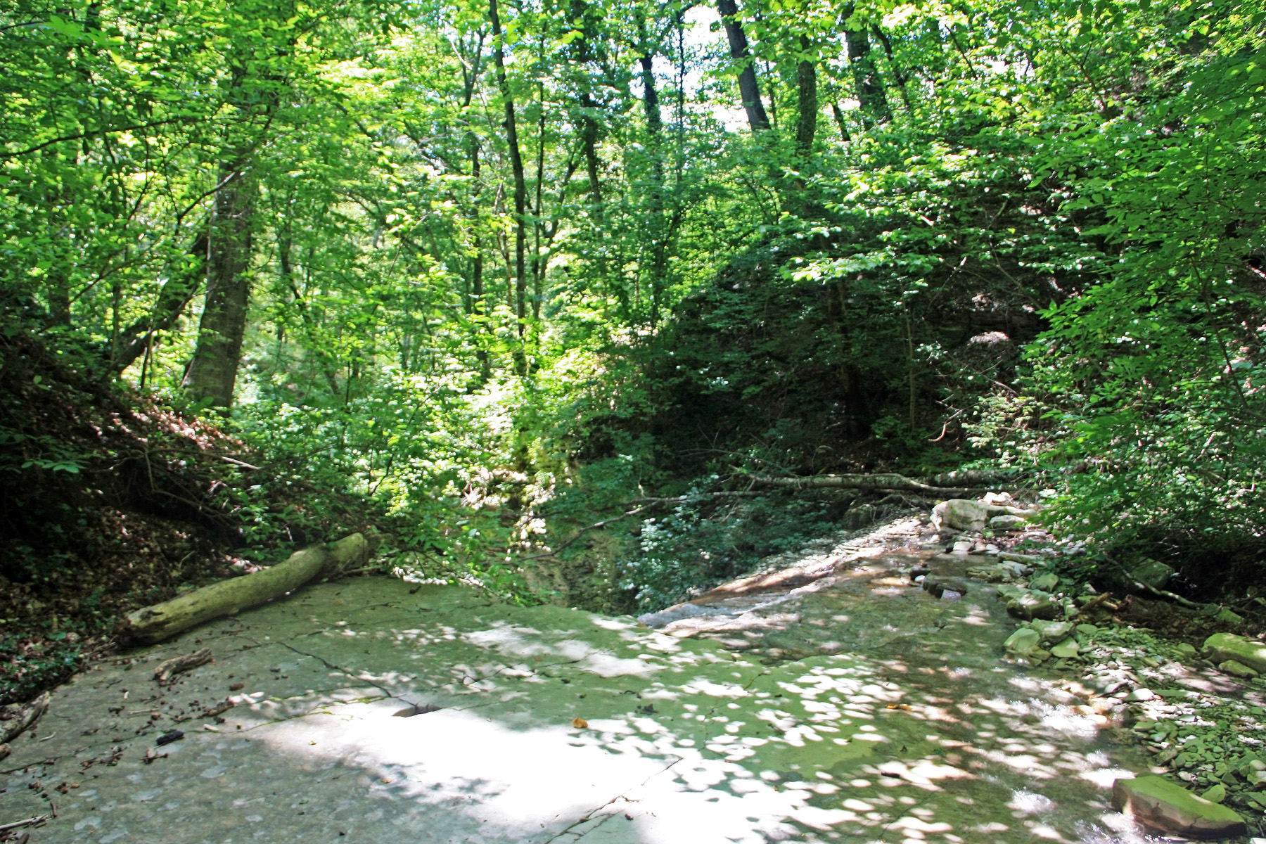 Подхожу ближе, справа вижу русло притока (левого притока). Узкий поток воды смыл грунт со скальной основы. Основа состоит из ступенчатых плит. Воды в русле сейчас нет, только сырость.