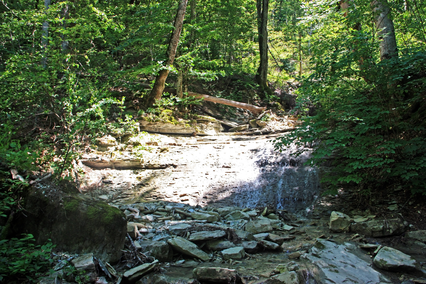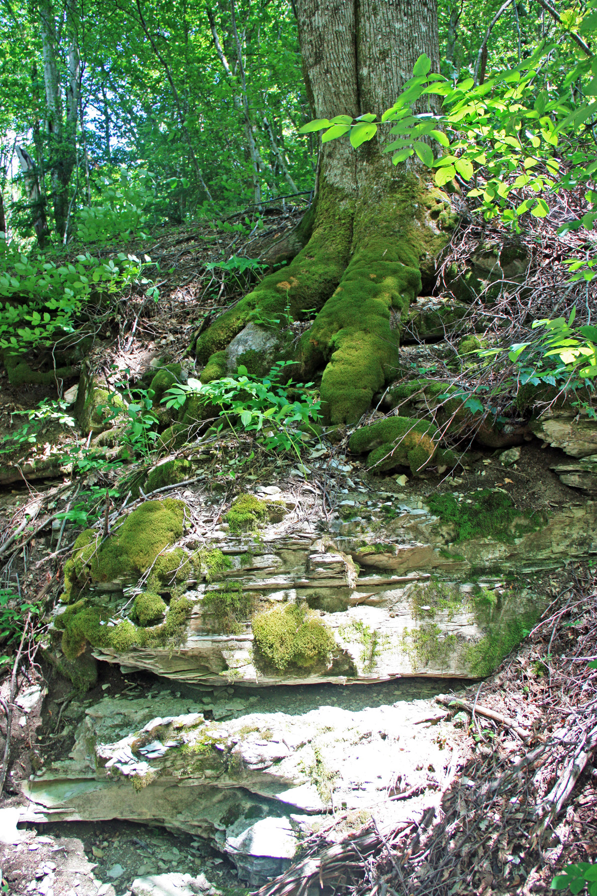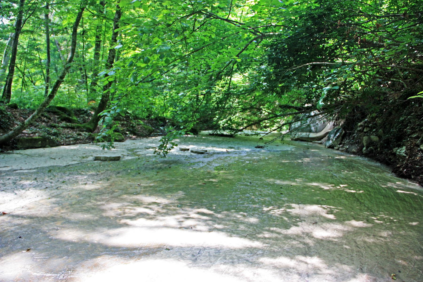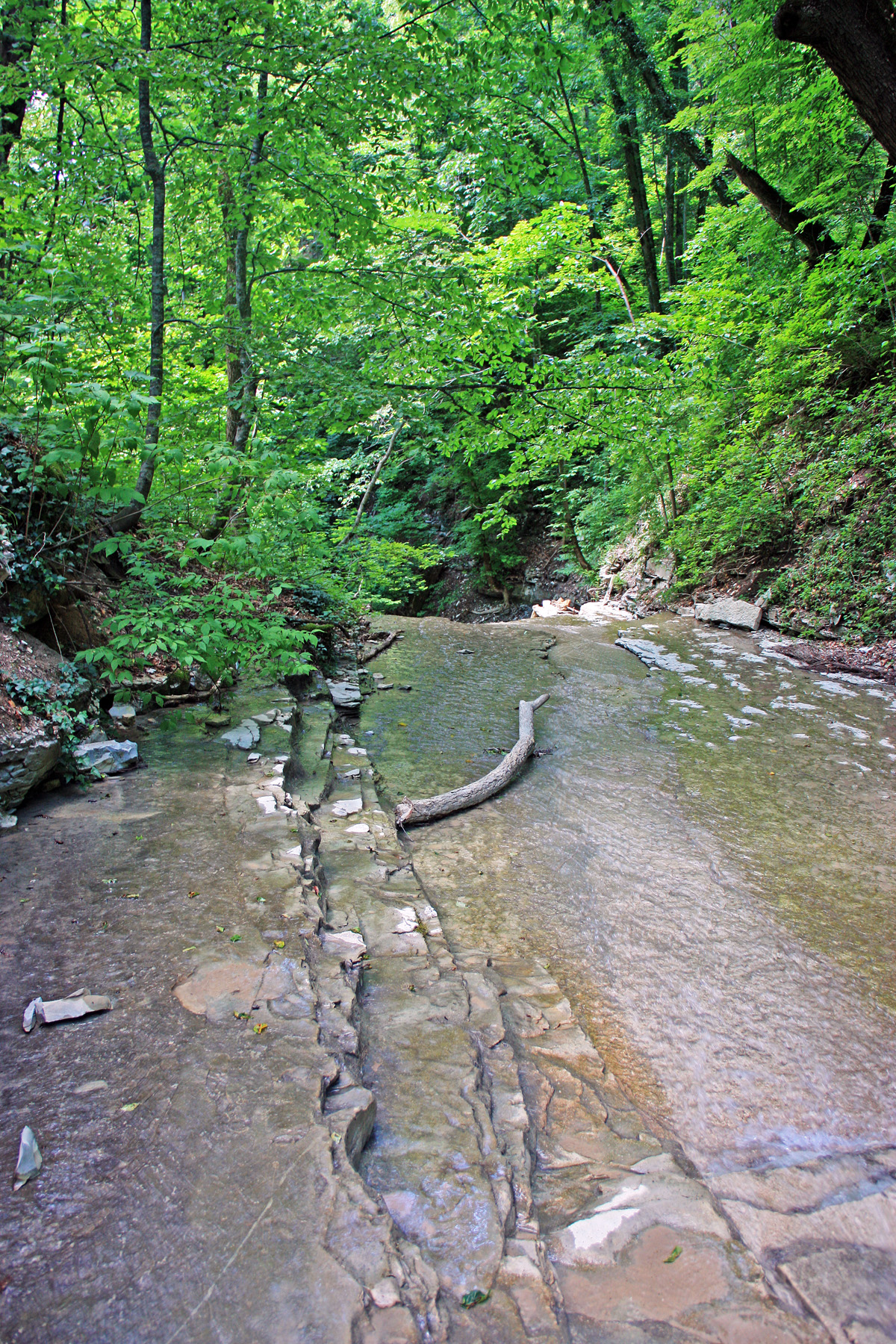 Подхожу ближе, справа вижу русло притока (левого притока). Узкий поток воды смыл грунт со скальной основы. Основа состоит из ступенчатых плит. Воды в русле сейчас нет, только сырость.