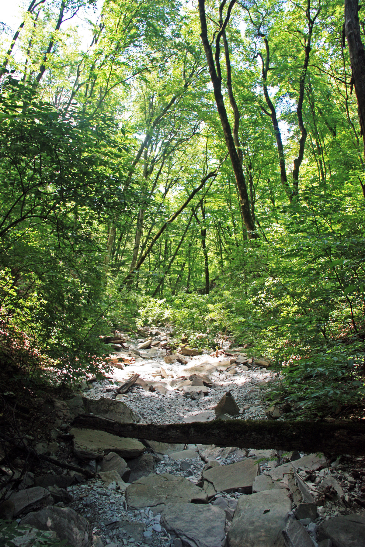 Иду по щебёночным наносам, вперемежку с камнями. Местами в русле проросли кусты (или молодая поросль леса). Это значит, что весенние потоки здесь не мощные, молодняк не в состоянии смыть. Или зазор, между мощными паводками в несколько лет.